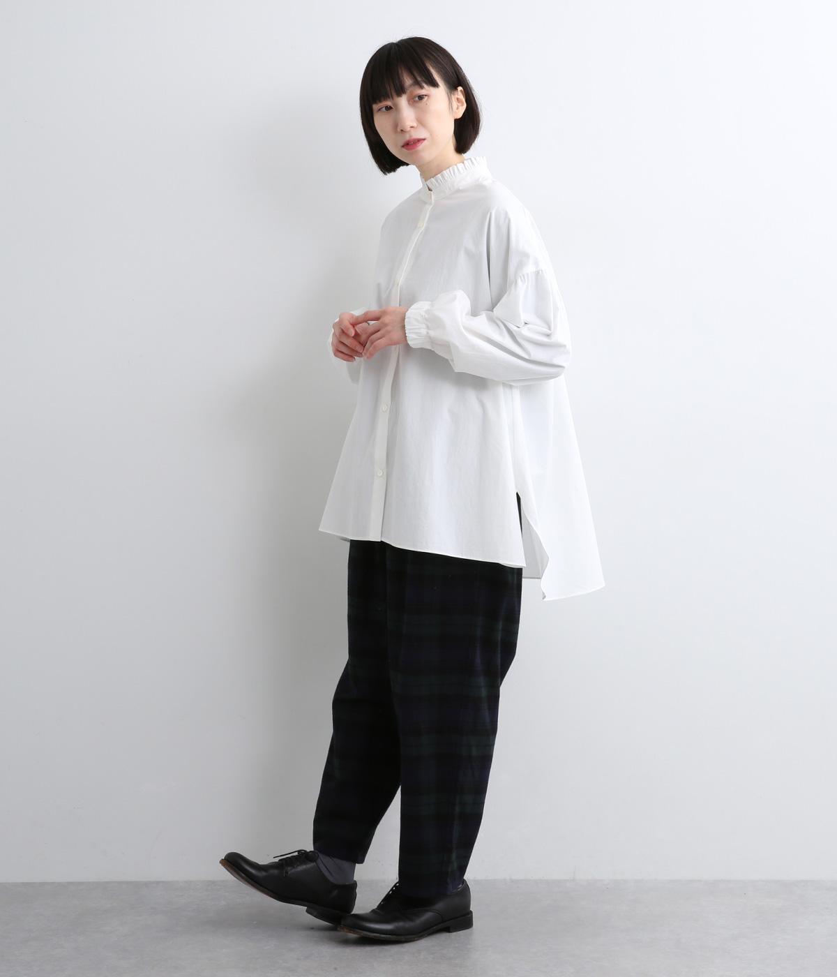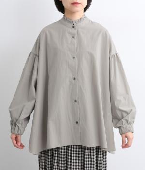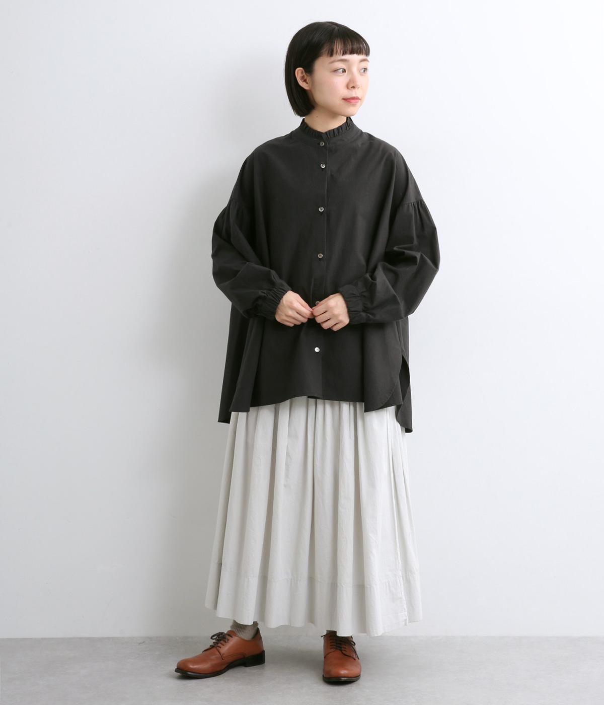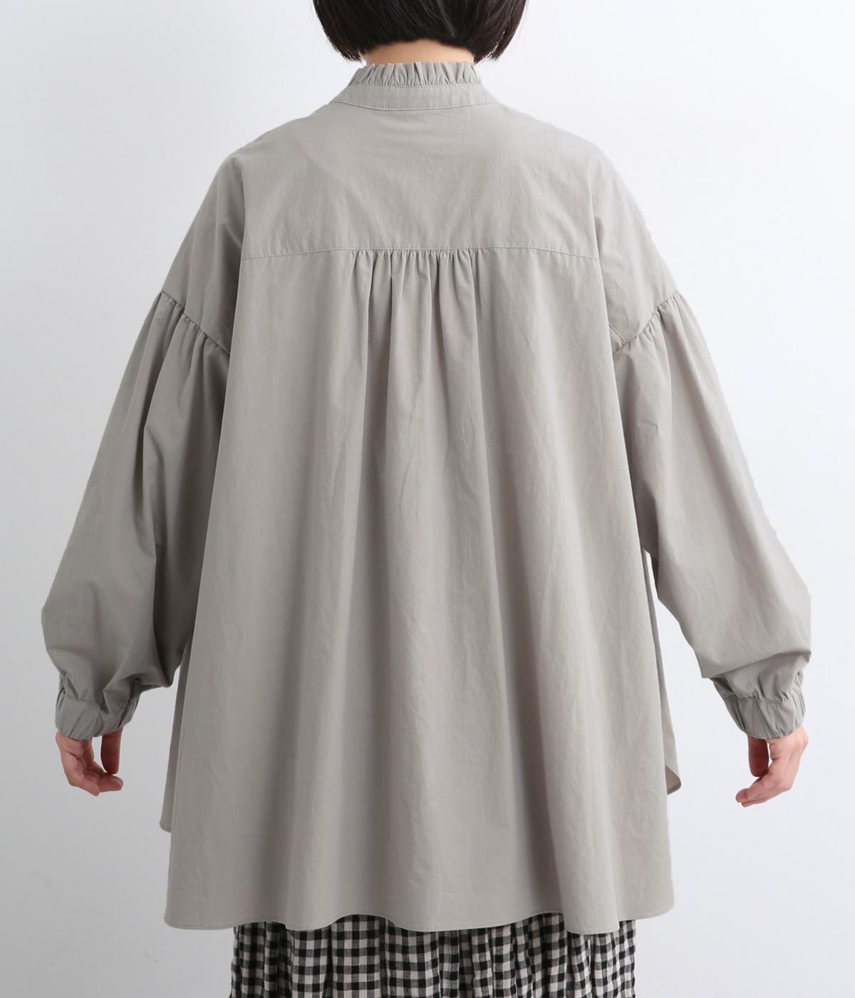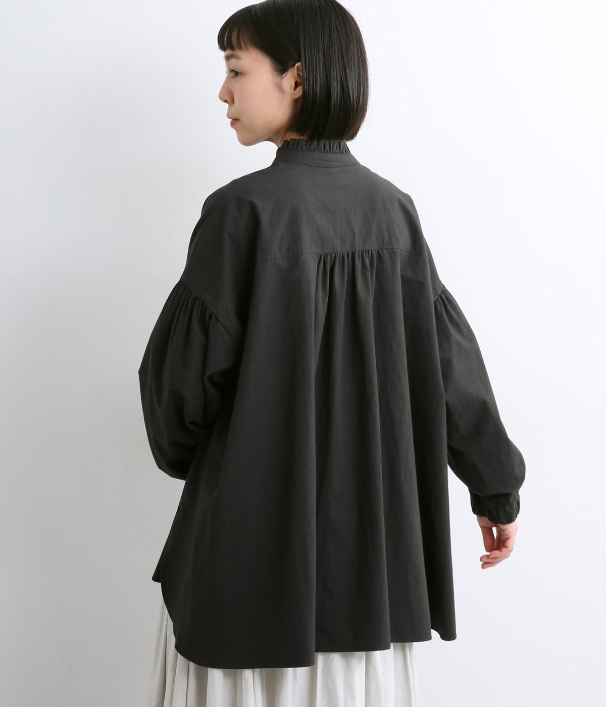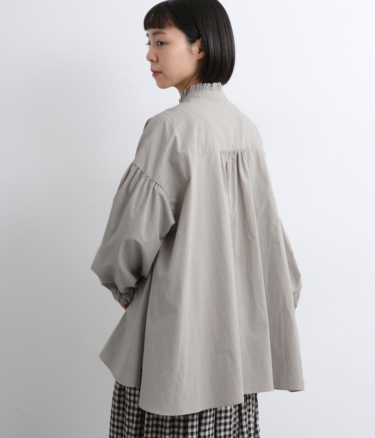 繊細なフリルネックと、布の落ち感を活かしたサーキュラーシルエットが魅力です。背中にたっぷりとギャザーを施すことで、立体的でやわらかなフォルムをつくり出しています。袖はゆるやかに膨らみ、袖口のゴムで自然な丸みのあるラインに。サイドスリットが動きを軽くし、どんなボトムスにも合わせやすいデザインです。