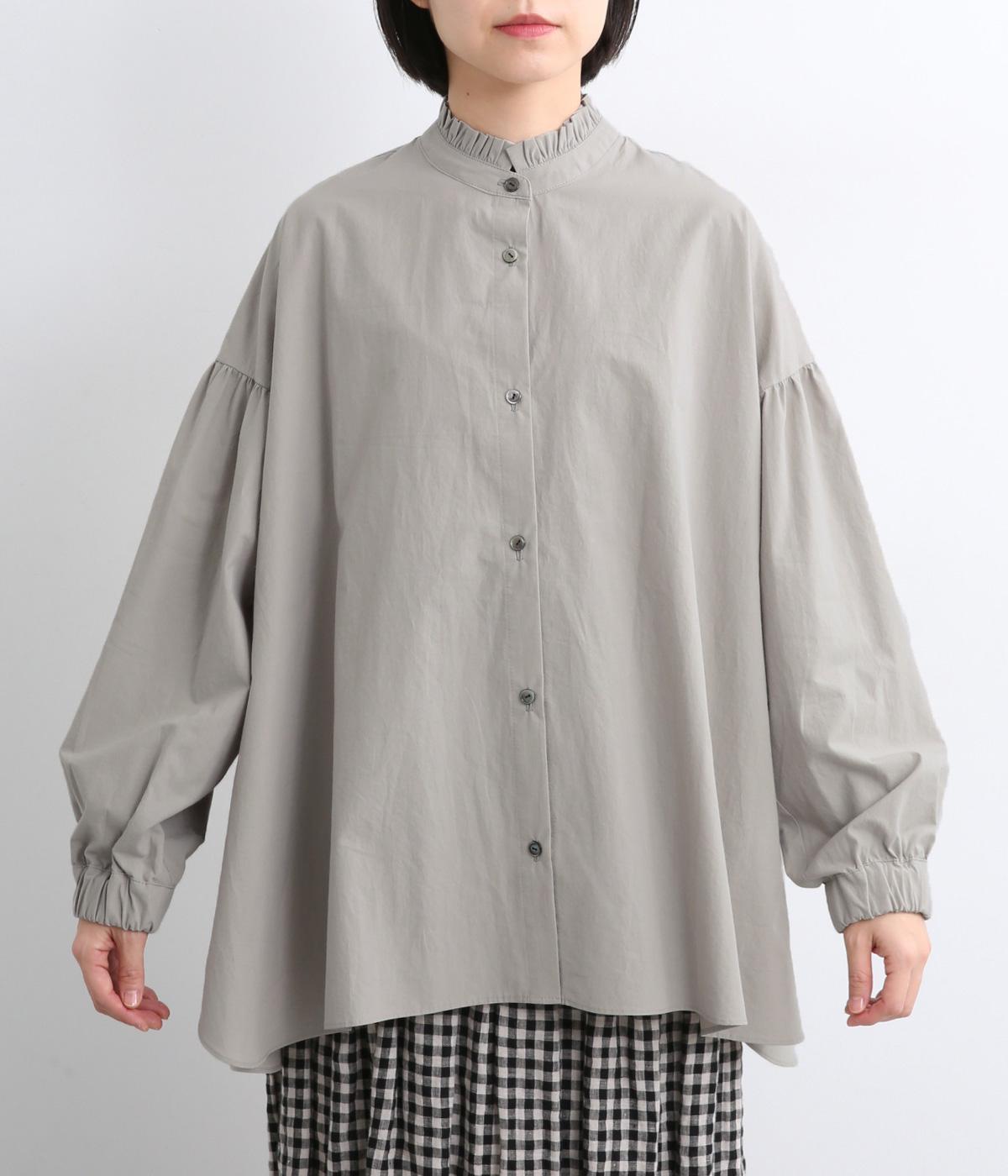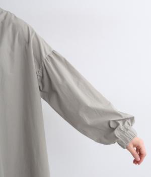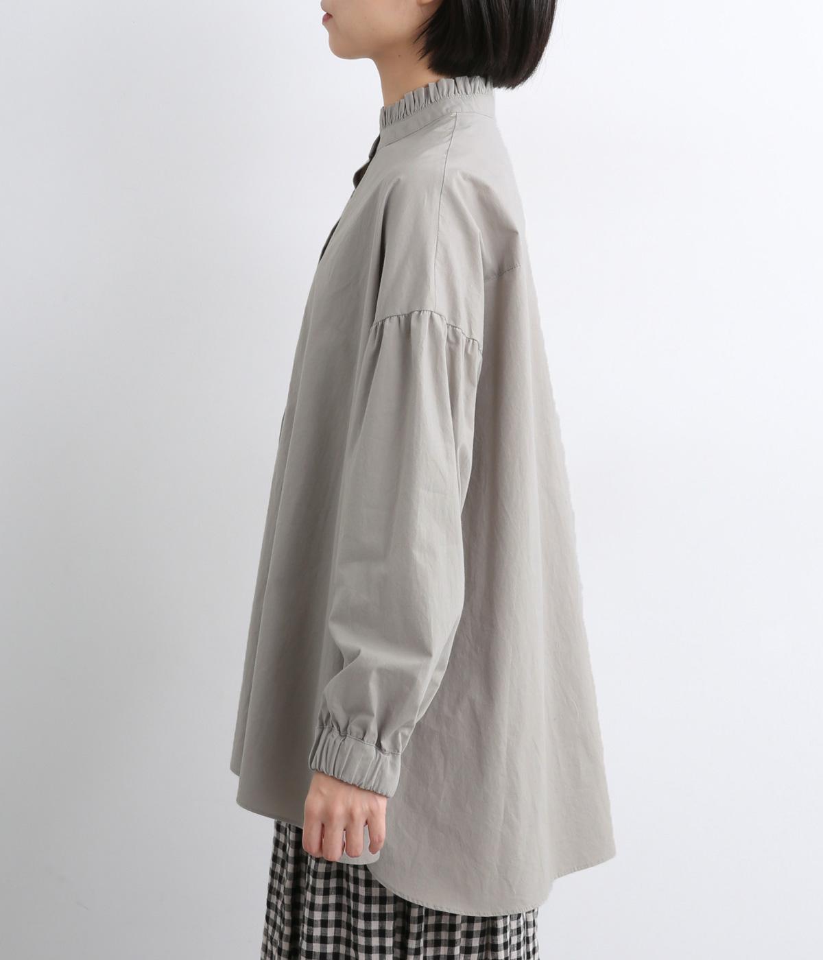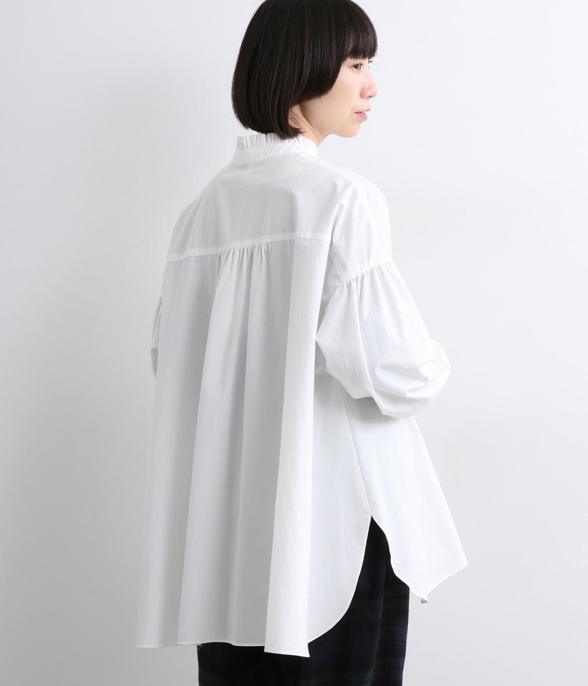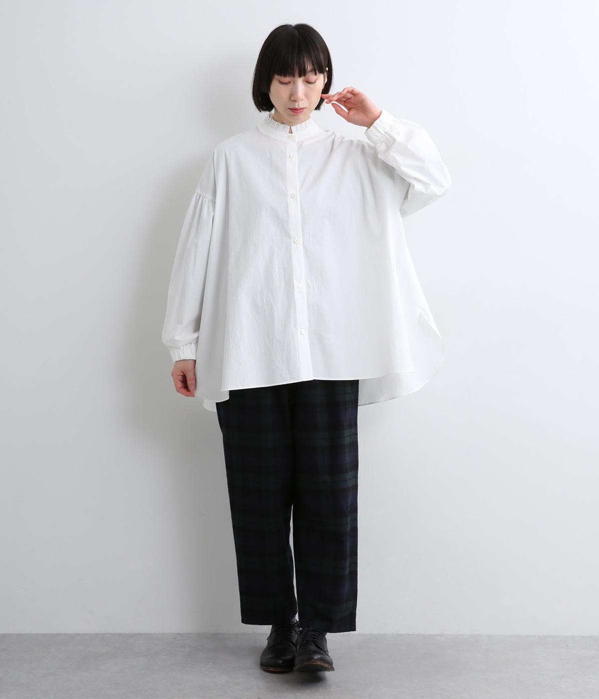 繊細なフリルネックと、布の落ち感を活かしたサーキュラーシルエットが魅力です。背中にたっぷりとギャザーを施すことで、立体的でやわらかなフォルムをつくり出しています。袖はゆるやかに膨らみ、袖口のゴムで自然な丸みのあるラインに。サイドスリットが動きを軽くし、どんなボトムスにも合わせやすいデザインです。