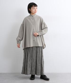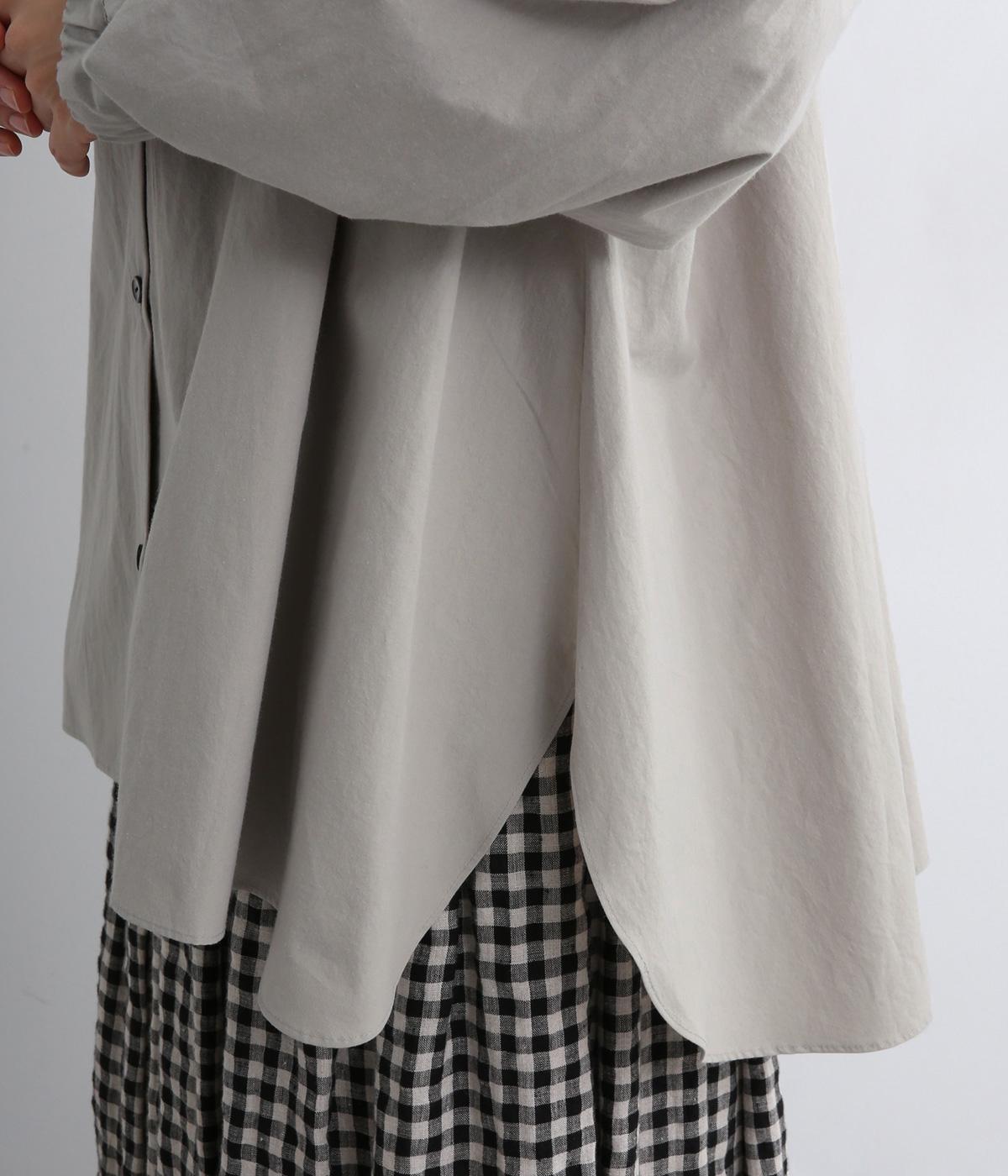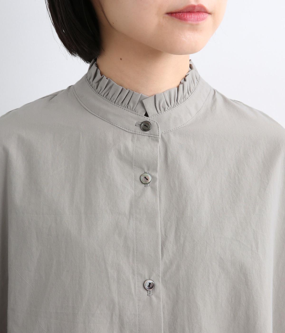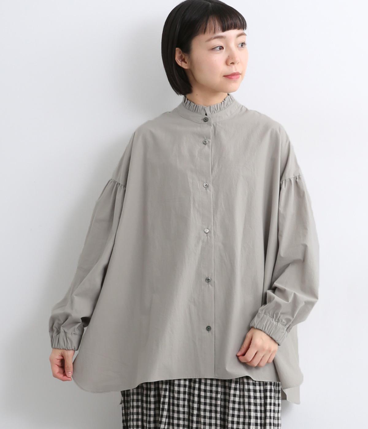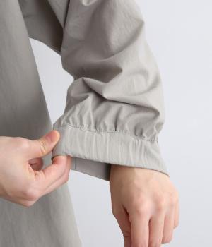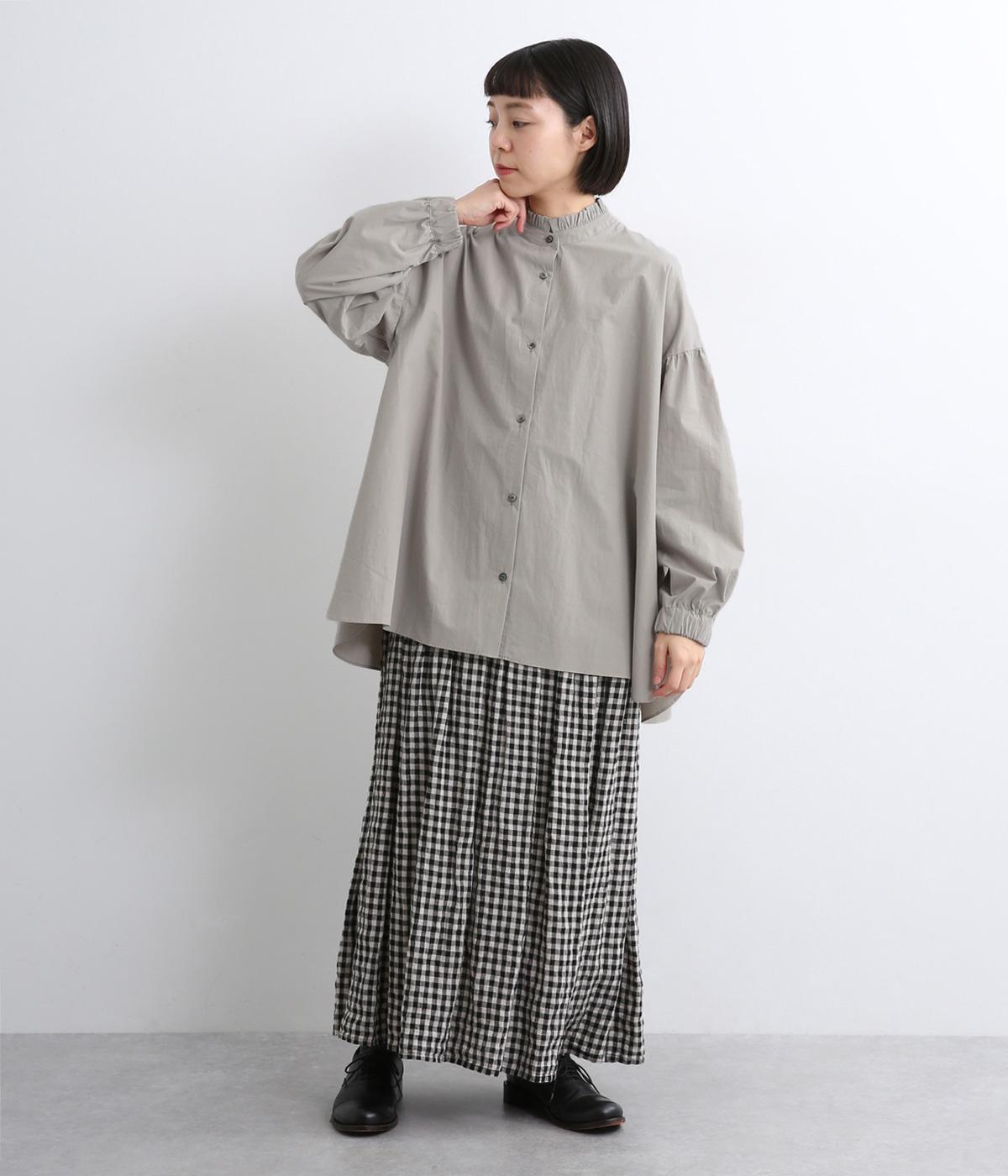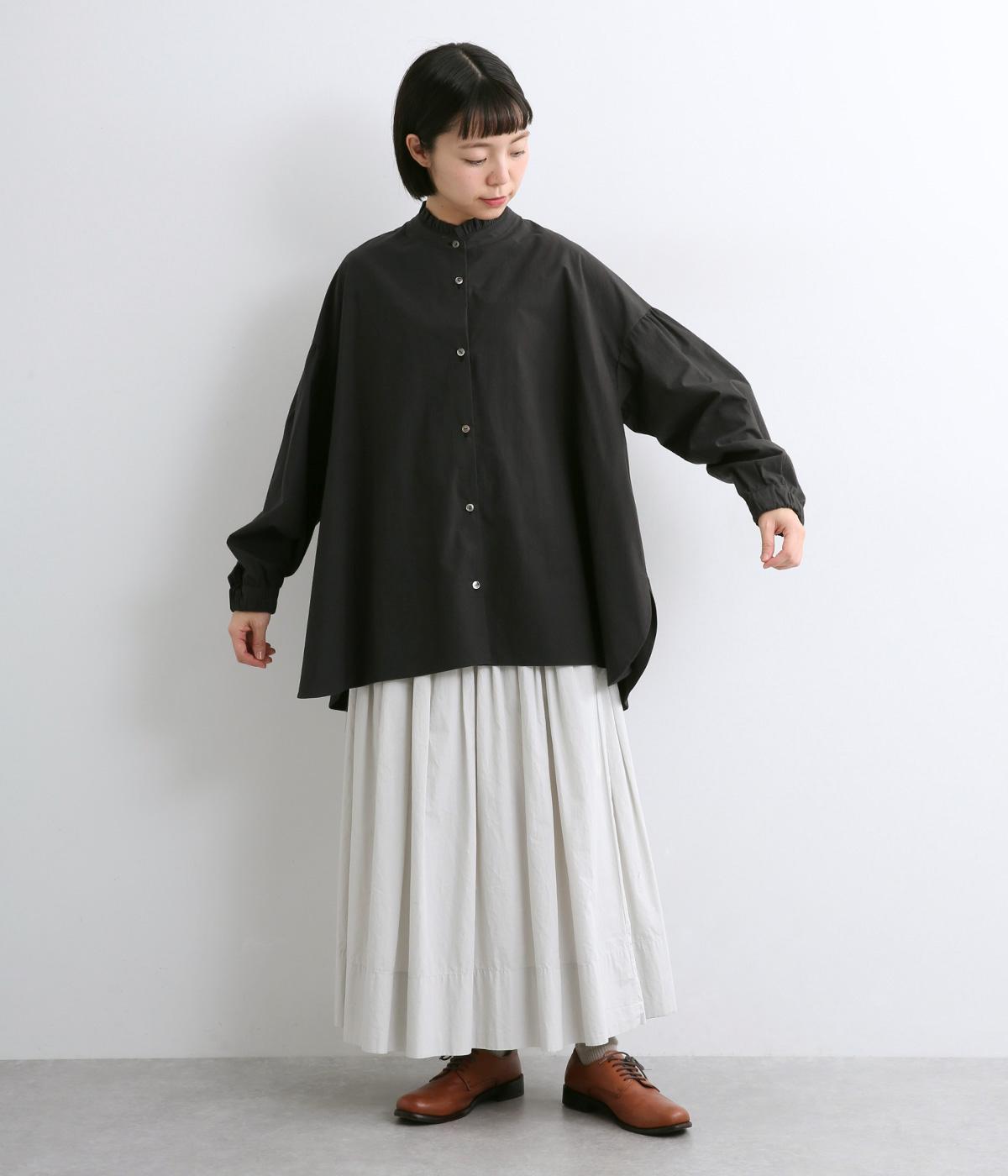 繊細なフリルネックと、布の落ち感を活かしたサーキュラーシルエットが魅力です。背中にたっぷりとギャザーを施すことで、立体的でやわらかなフォルムをつくり出しています。袖はゆるやかに膨らみ、袖口のゴムで自然な丸みのあるラインに。サイドスリットが動きを軽くし、どんなボトムスにも合わせやすいデザインです。