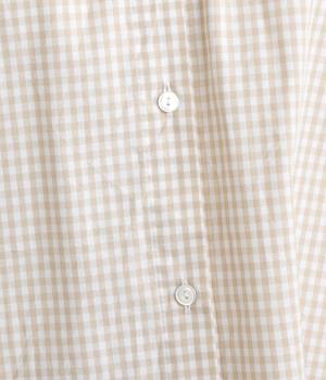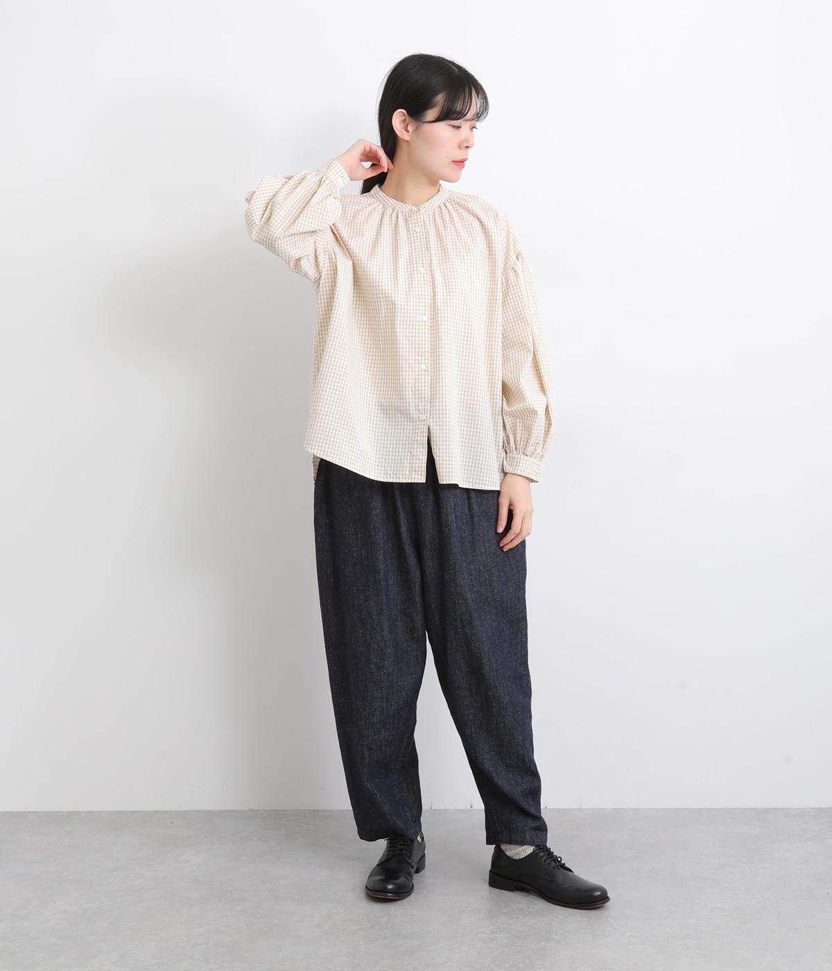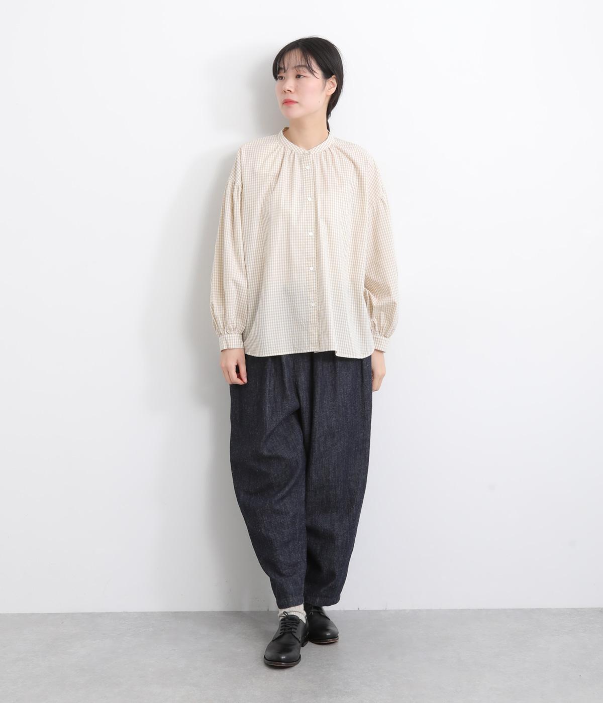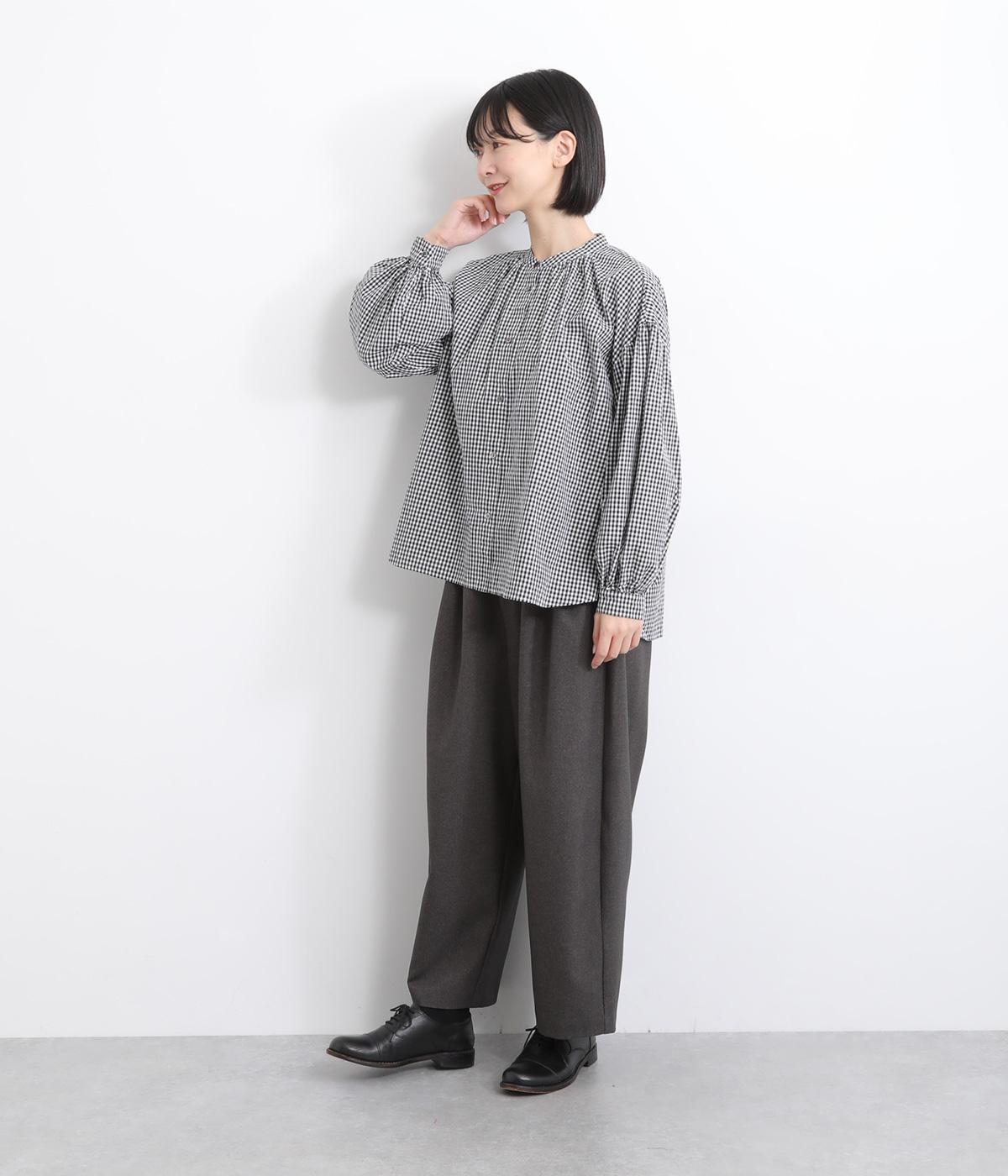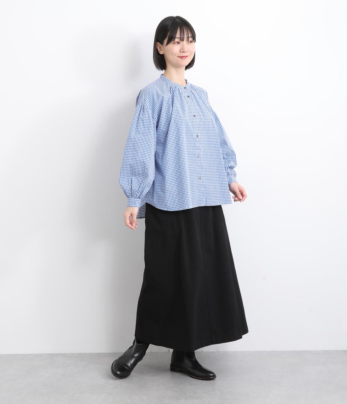 大人かわいい雰囲気のギンガムチェックシャツ。ふんわりした袖が女性らしいシルエットを描きます。ゆったりした身幅にバンドカラーで顔まわりはすっきりと仕上げました。程よい丈感でさまざまなボトムスと好相性です。