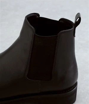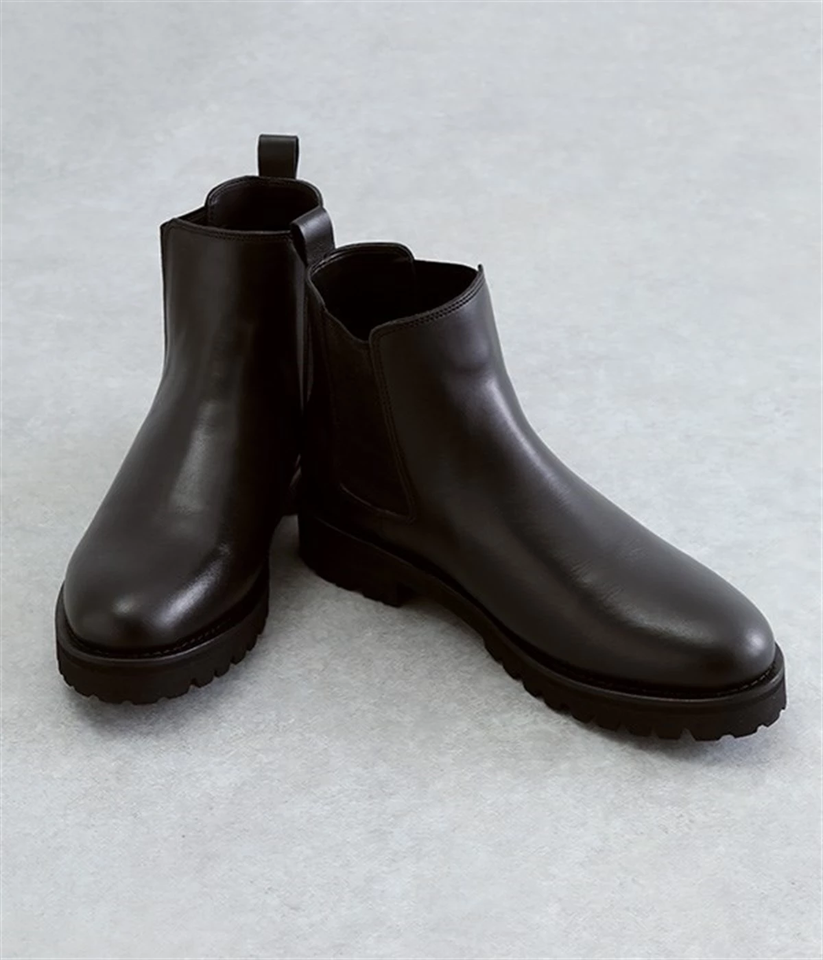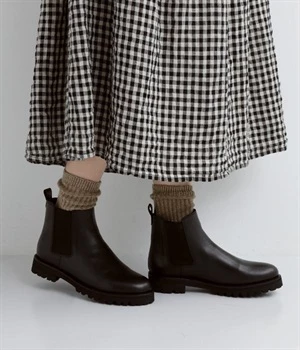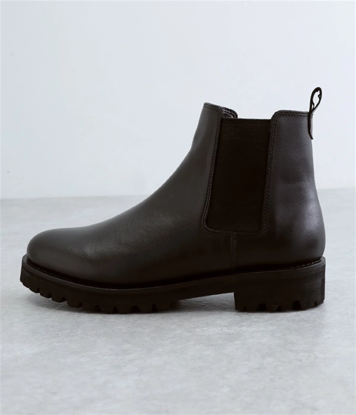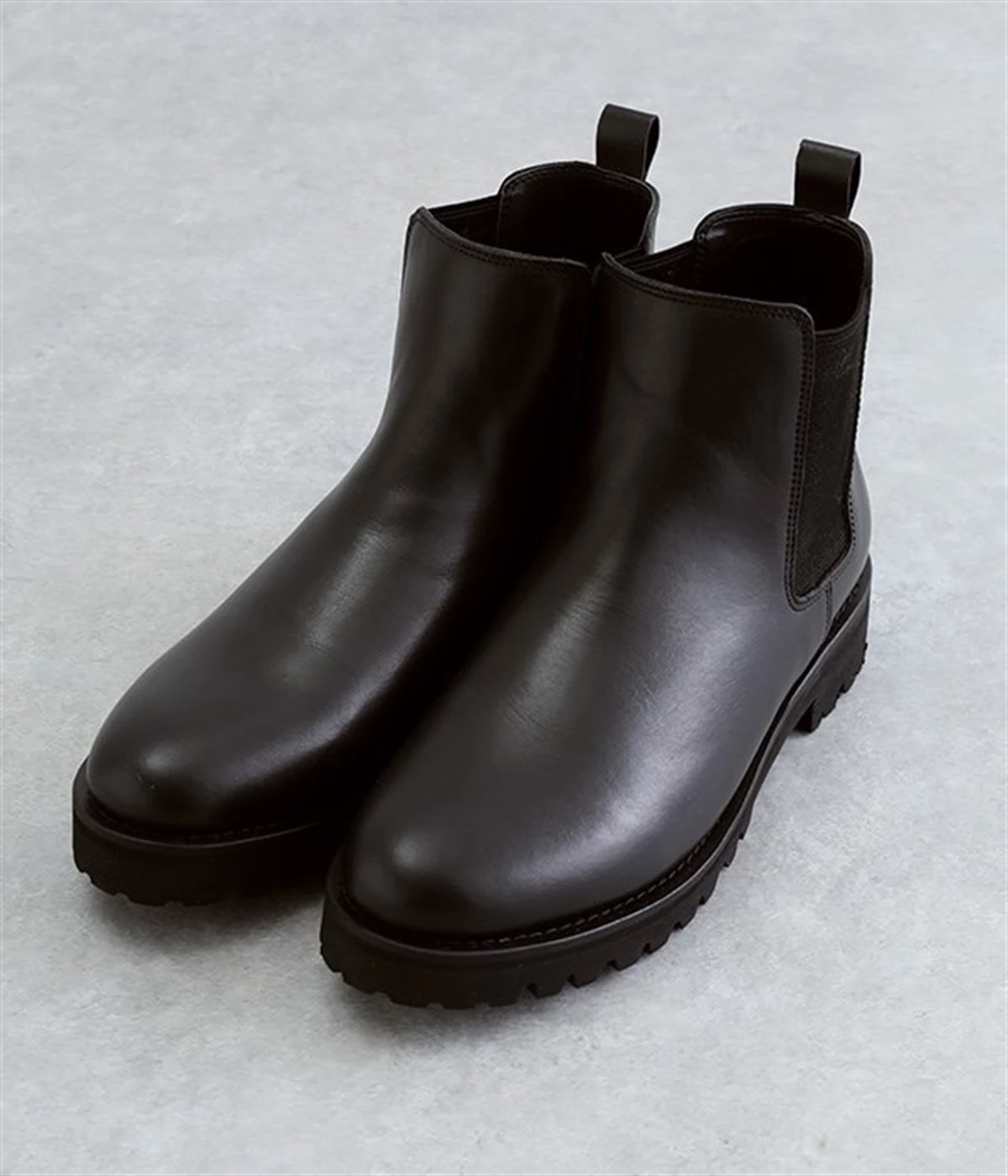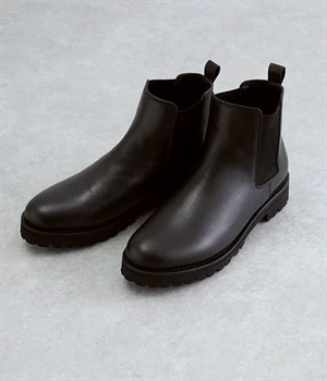 凹凸のあるボリュームソールと、つま先がややシェイプしたすっきりシルエットのコントラストがおしゃれなブーツ。アッパーにはつややかな光沢がひときわ目を惹く牛革を使用し、はきこむほどに足になじんでいく経年変化を楽しめます。デザインポイントのサイドゴアは豊かなストレッチ性があり、スムーズな足入れに欠かせない大切なディテール。はき口のプルストラップをつまみながらだと、よりなめらかにはくことができます。見た目ほど重さを感じにくい仕上がりで、足運びがラクなのも普段使いにうれしいポイントです。