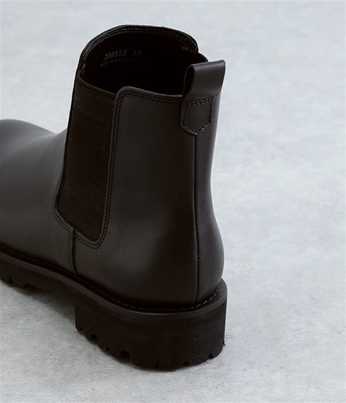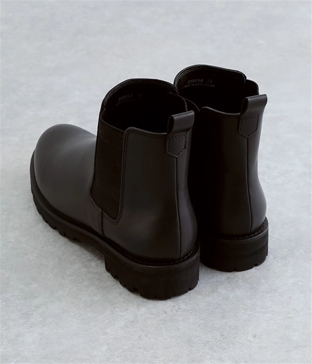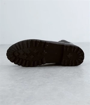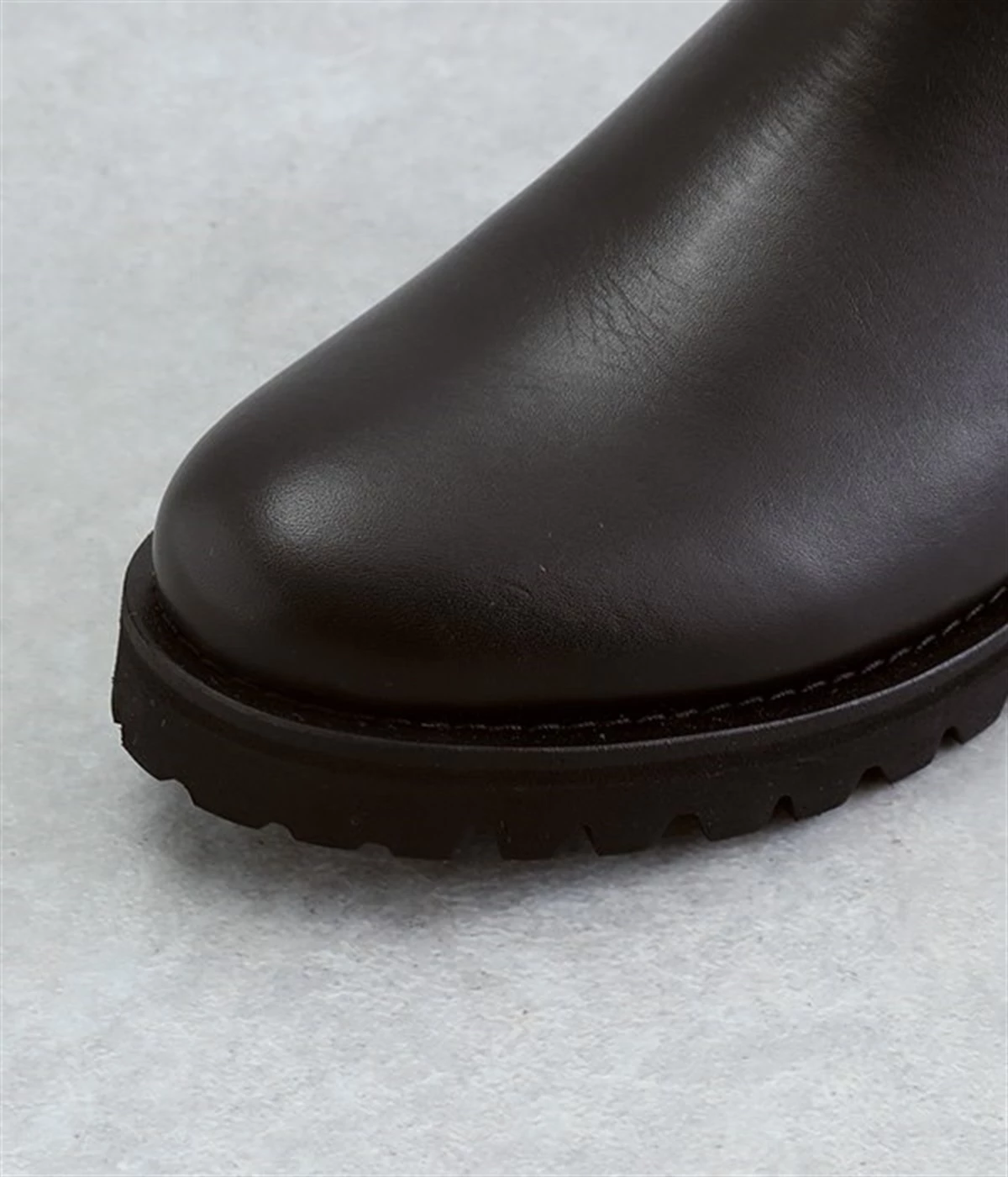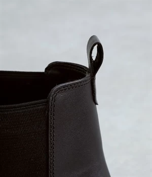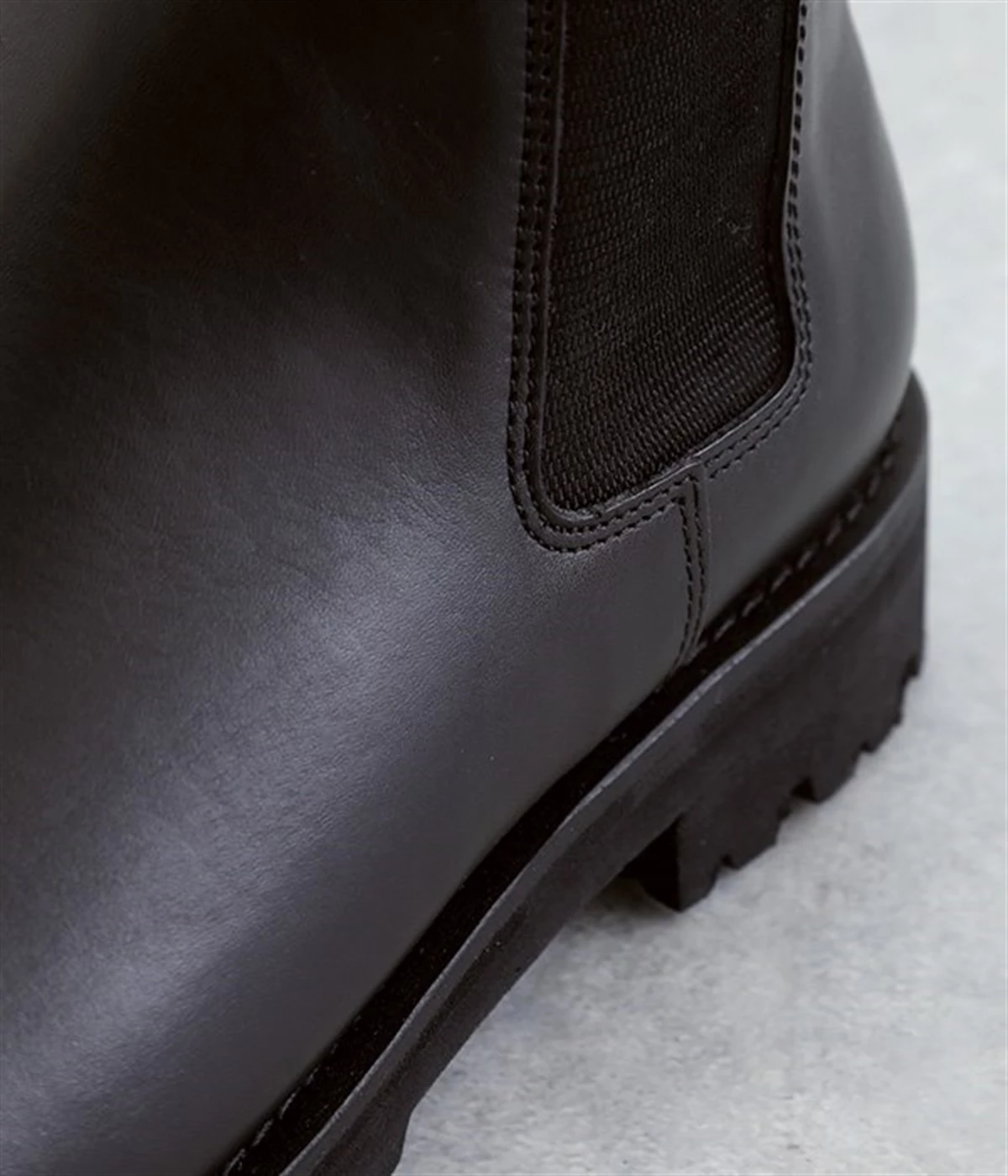 凹凸のあるボリュームソールと、つま先がややシェイプしたすっきりシルエットのコントラストがおしゃれなブーツ。アッパーにはつややかな光沢がひときわ目を惹く牛革を使用し、はきこむほどに足になじんでいく経年変化を楽しめます。デザインポイントのサイドゴアは豊かなストレッチ性があり、スムーズな足入れに欠かせない大切なディテール。はき口のプルストラップをつまみながらだと、よりなめらかにはくことができます。見た目ほど重さを感じにくい仕上がりで、足運びがラクなのも普段使いにうれしいポイントです。