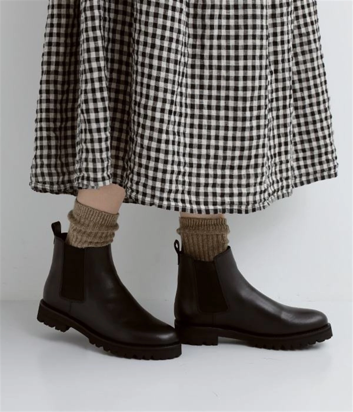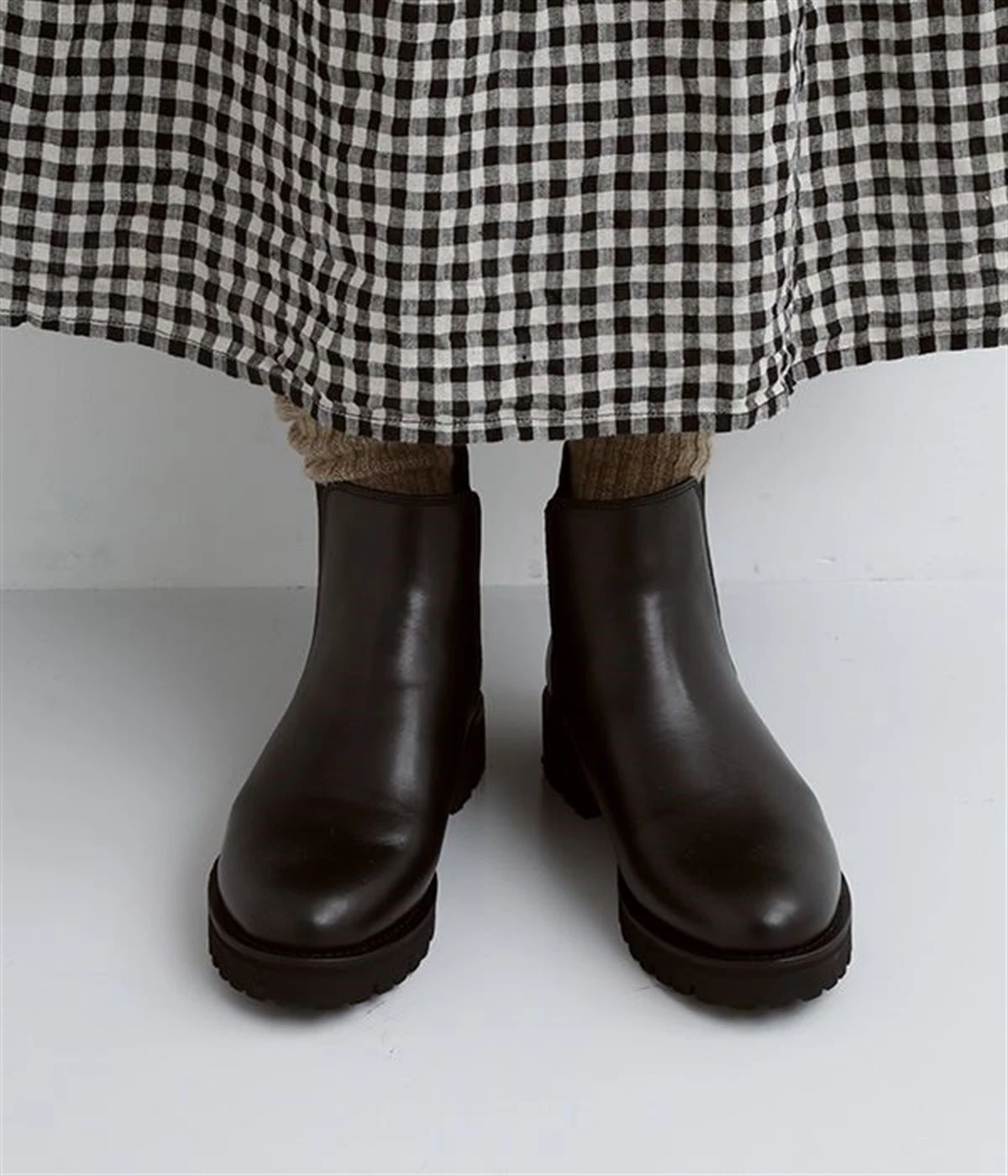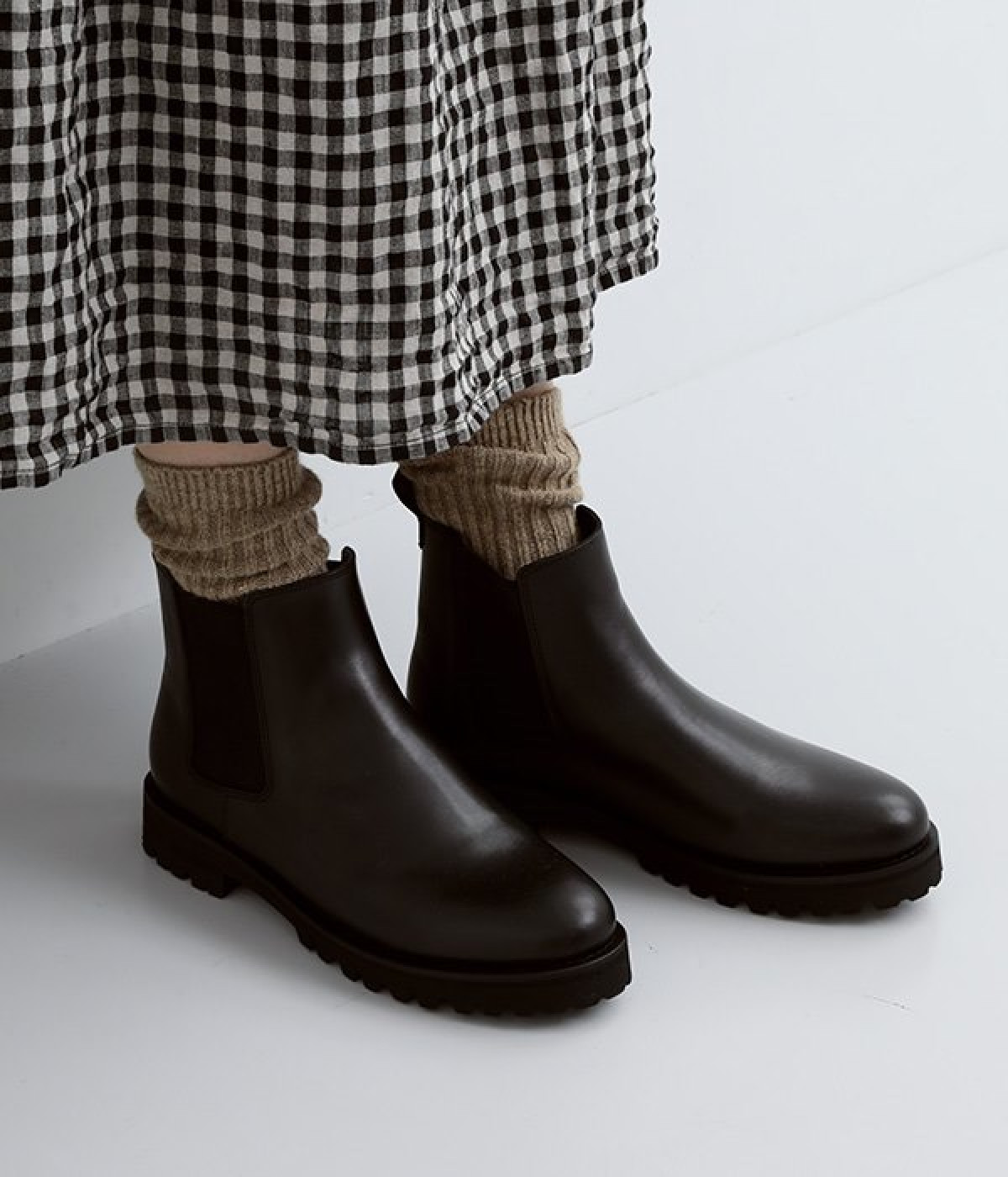 凹凸のあるボリュームソールと、つま先がややシェイプしたすっきりシルエットのコントラストがおしゃれなブーツ。アッパーにはつややかな光沢がひときわ目を惹く牛革を使用し、はきこむほどに足になじんでいく経年変化を楽しめます。デザインポイントのサイドゴアは豊かなストレッチ性があり、スムーズな足入れに欠かせない大切なディテール。はき口のプルストラップをつまみながらだと、よりなめらかにはくことができます。見た目ほど重さを感じにくい仕上がりで、足運びがラクなのも普段使いにうれしいポイントです。