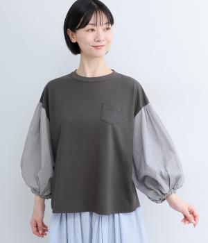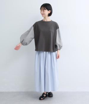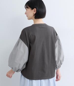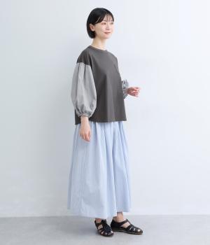 異素材のコントラストが目をひくトップス。袖のチェック柄が装いに彩りを添え、一枚でさっと着るだけでスタイリングが決まります。袖口はゴム仕様でたくしあげやすく、ぽわんとしたボリューム感を楽しめます。
