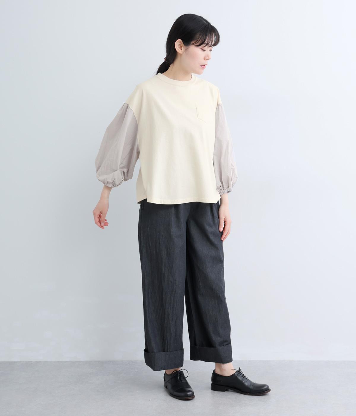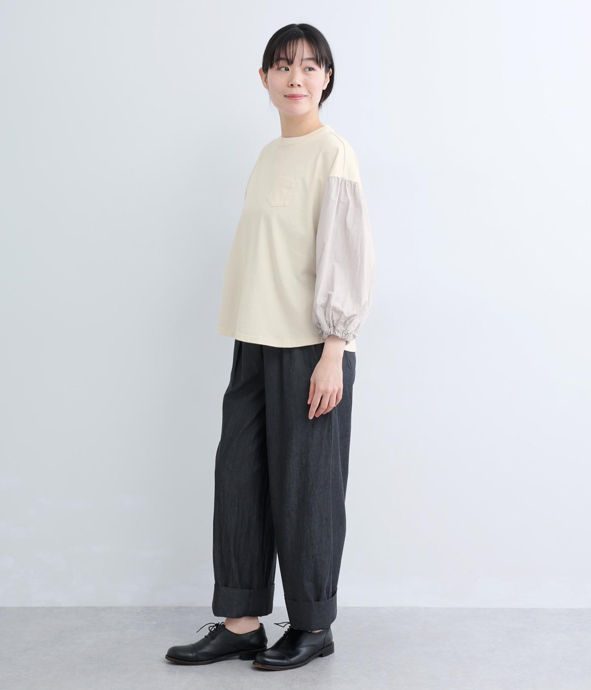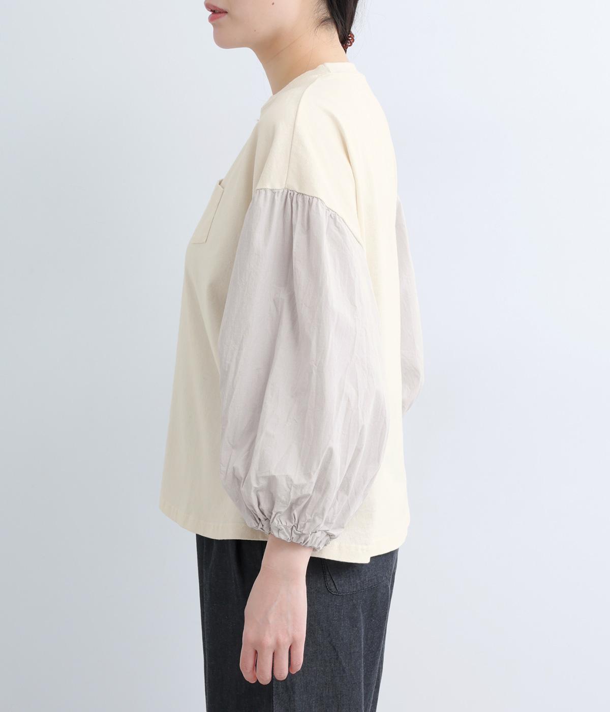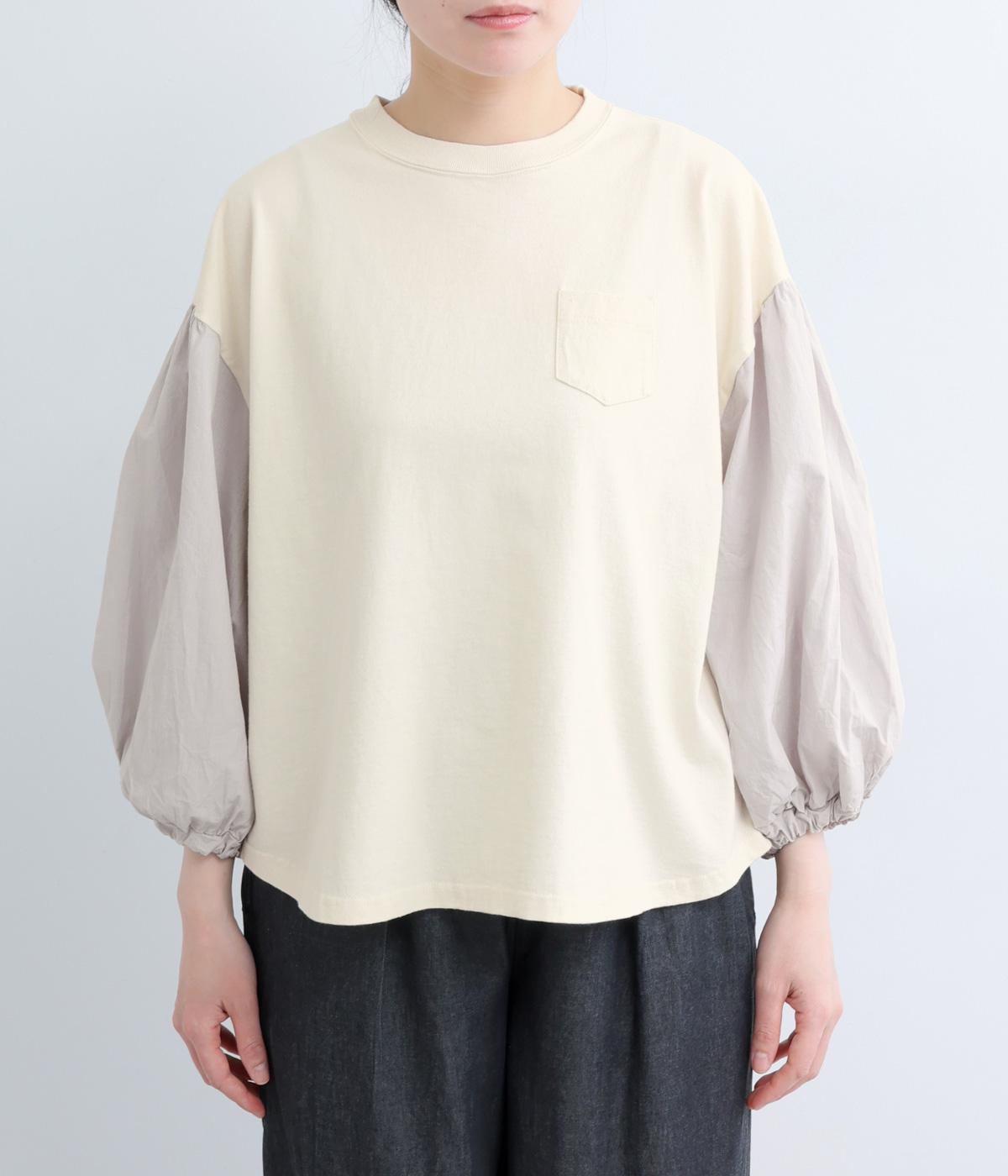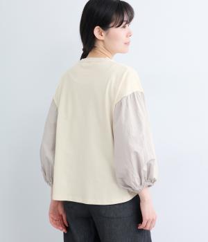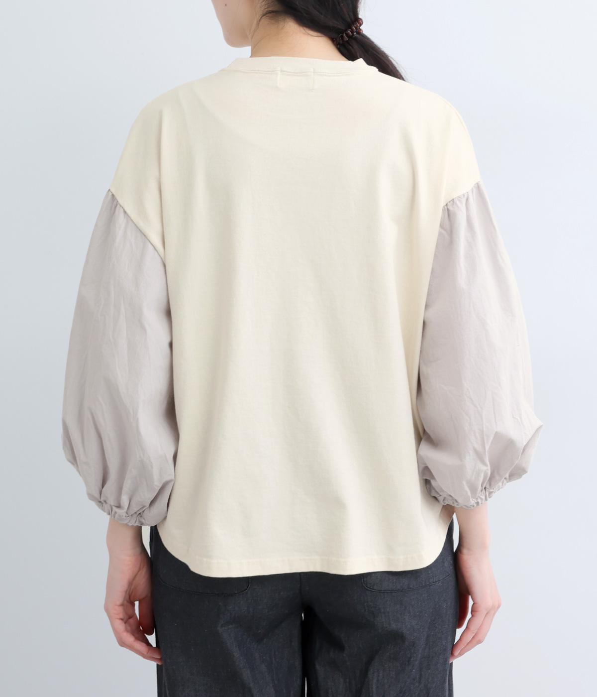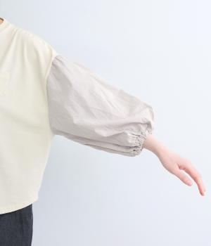 身頃はさらりとドライな質感でほどよい肉感の天竺生地、袖には軽やかな布帛を組み合わせました。どちらも吸湿性に優れたコットン素材で、肌ばなれよく快適に着られます。