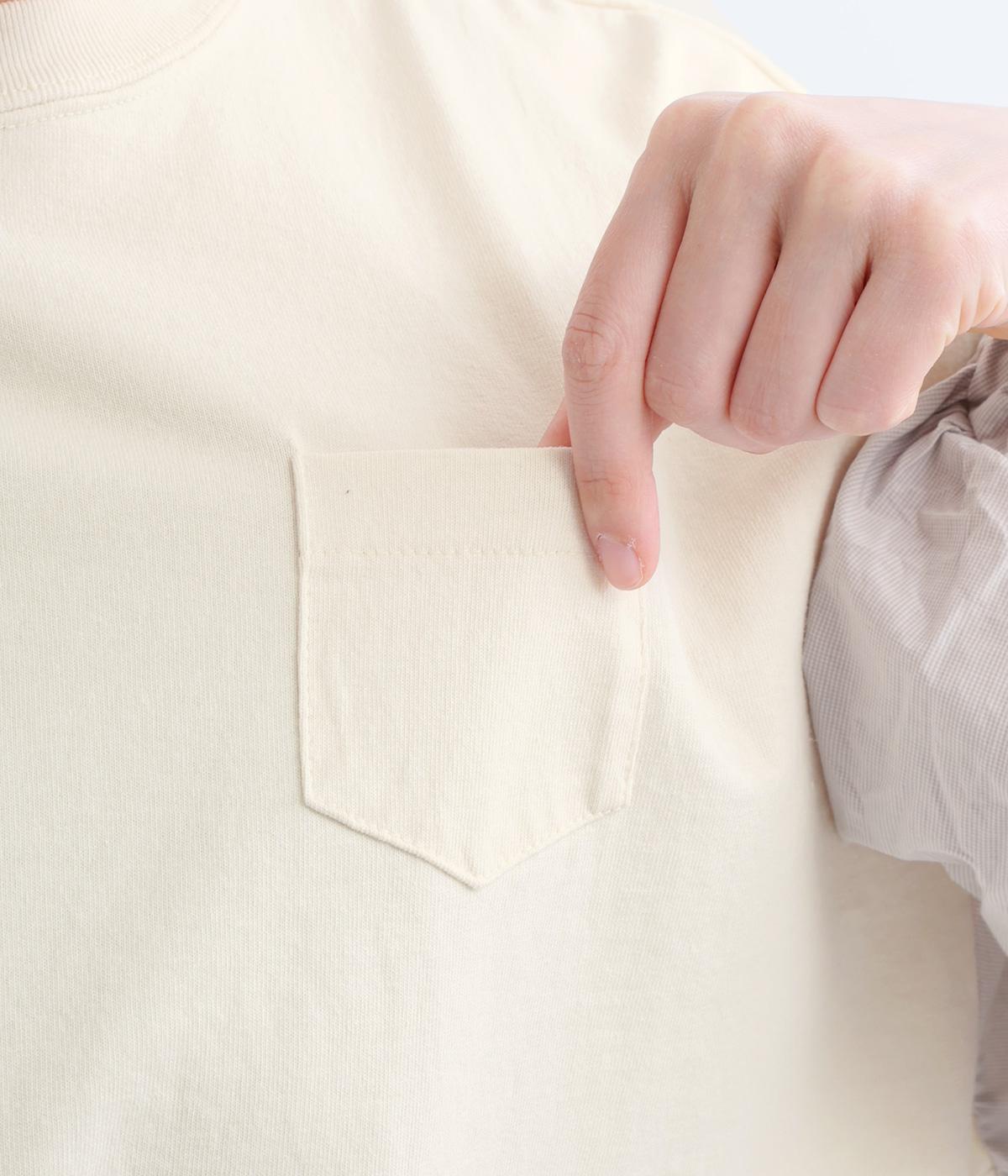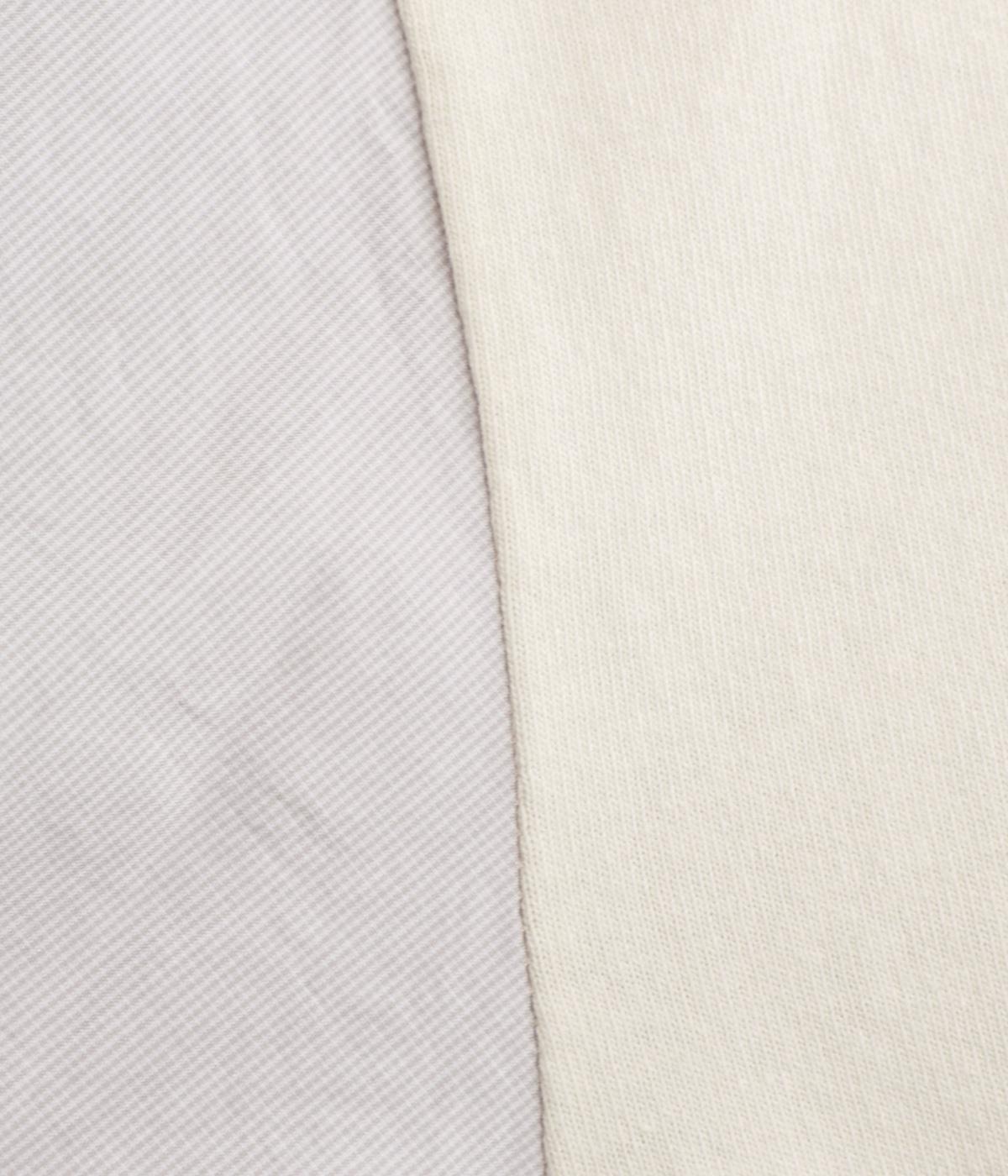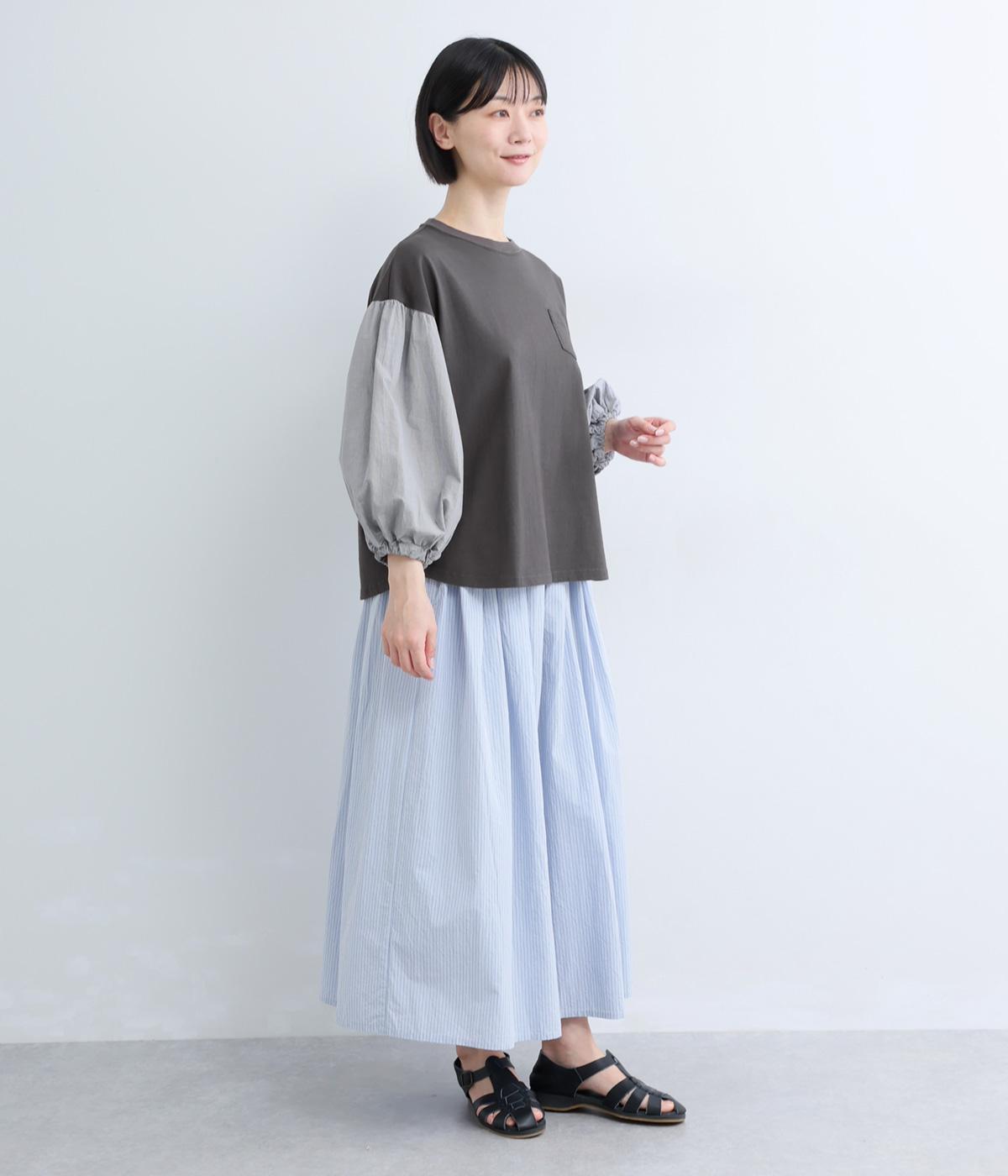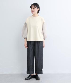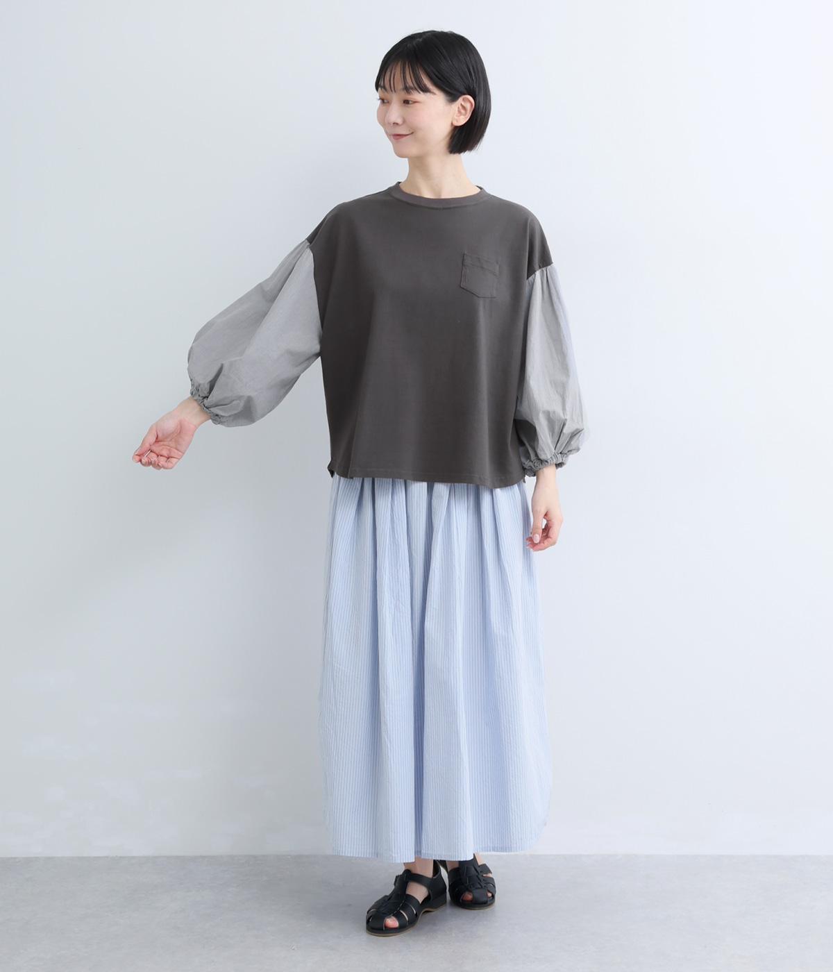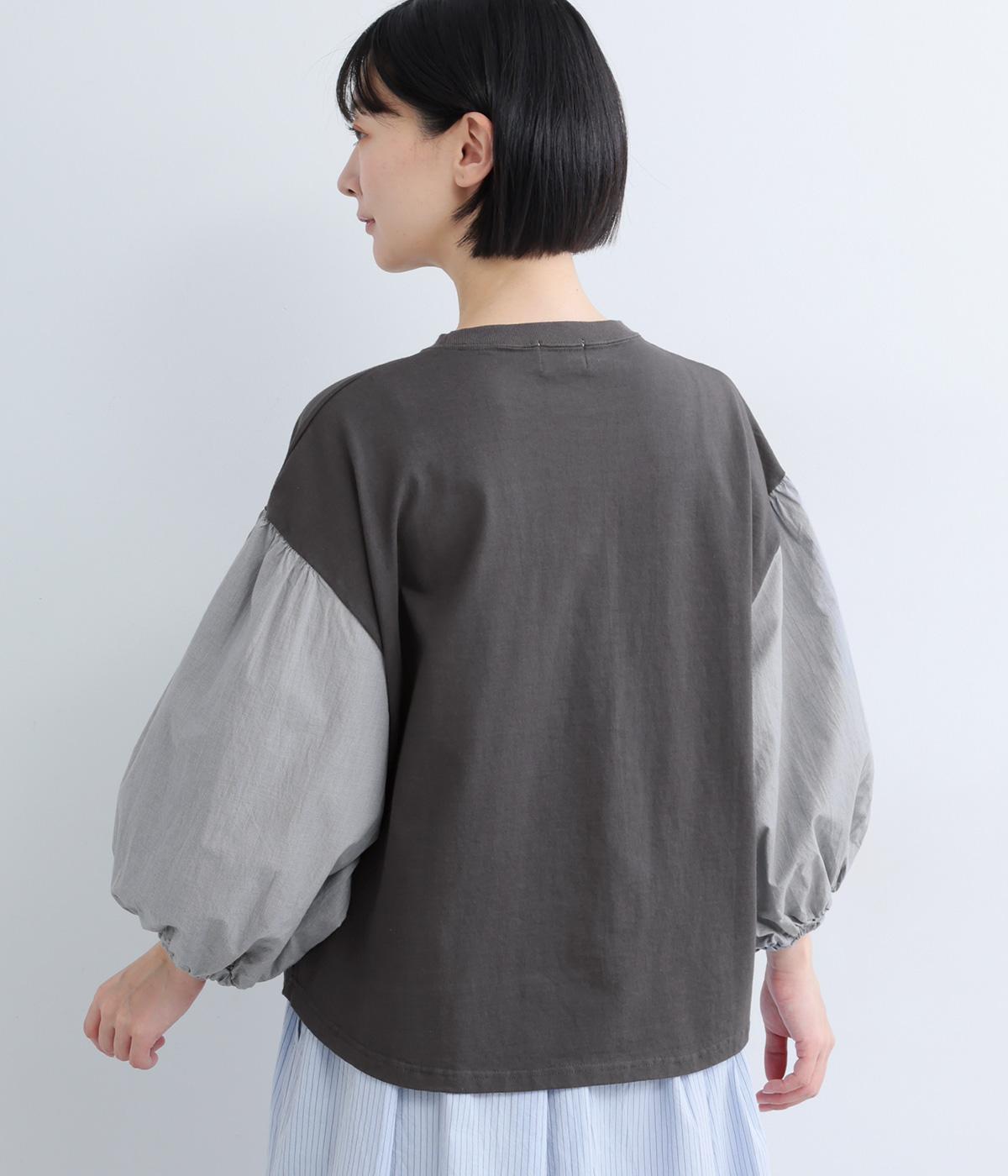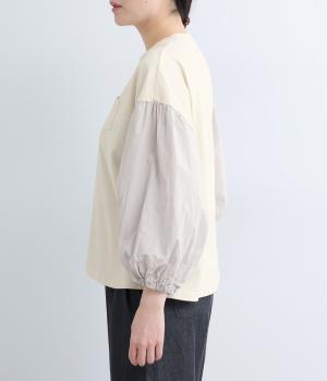 身頃はさらりとドライな質感でほどよい肉感の天竺生地、袖には軽やかな布帛を組み合わせました。どちらも吸湿性に優れたコットン素材で、肌ばなれよく快適に着られます。