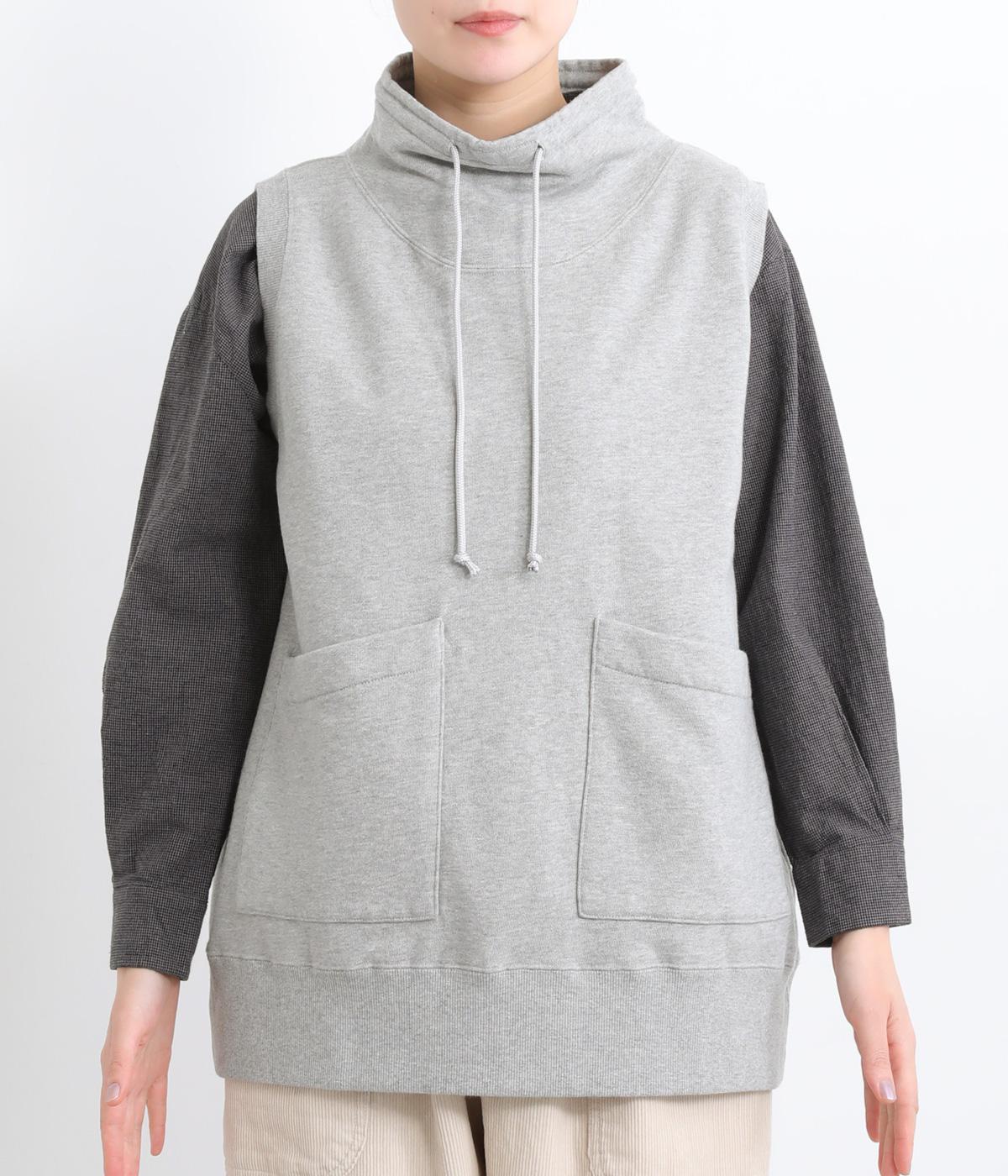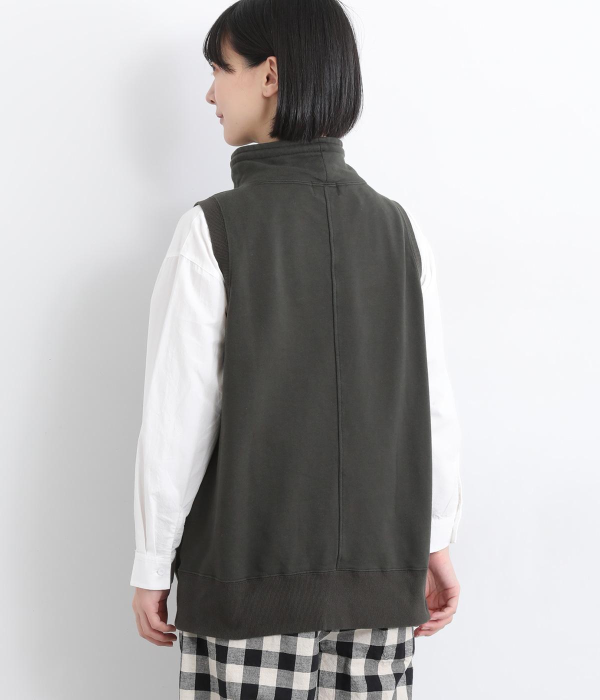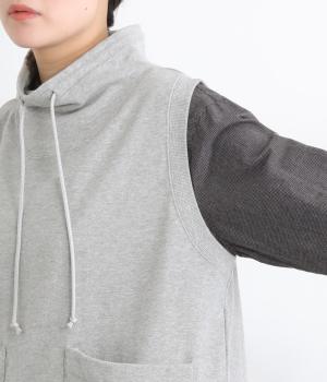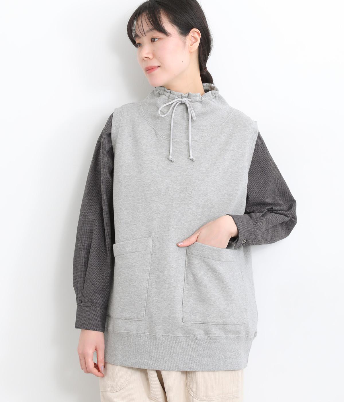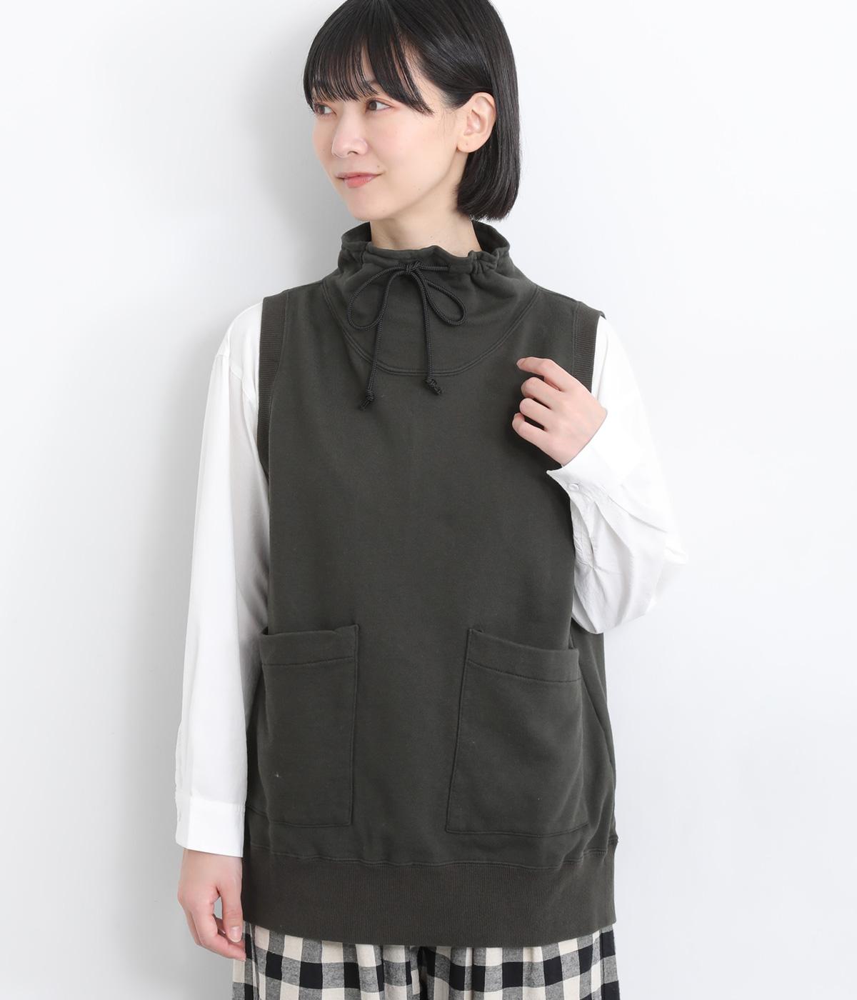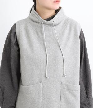 カジュアルなスウェット素材に、ハイネックの上品さをプラスしたベスト。首元のドローストリングを軽くしぼることで、シルエットに変化をつけられます。肩まわりにゆとりを持たせているので、シャツやカットソー、ワンピースとの重ね着にもぴったりです。