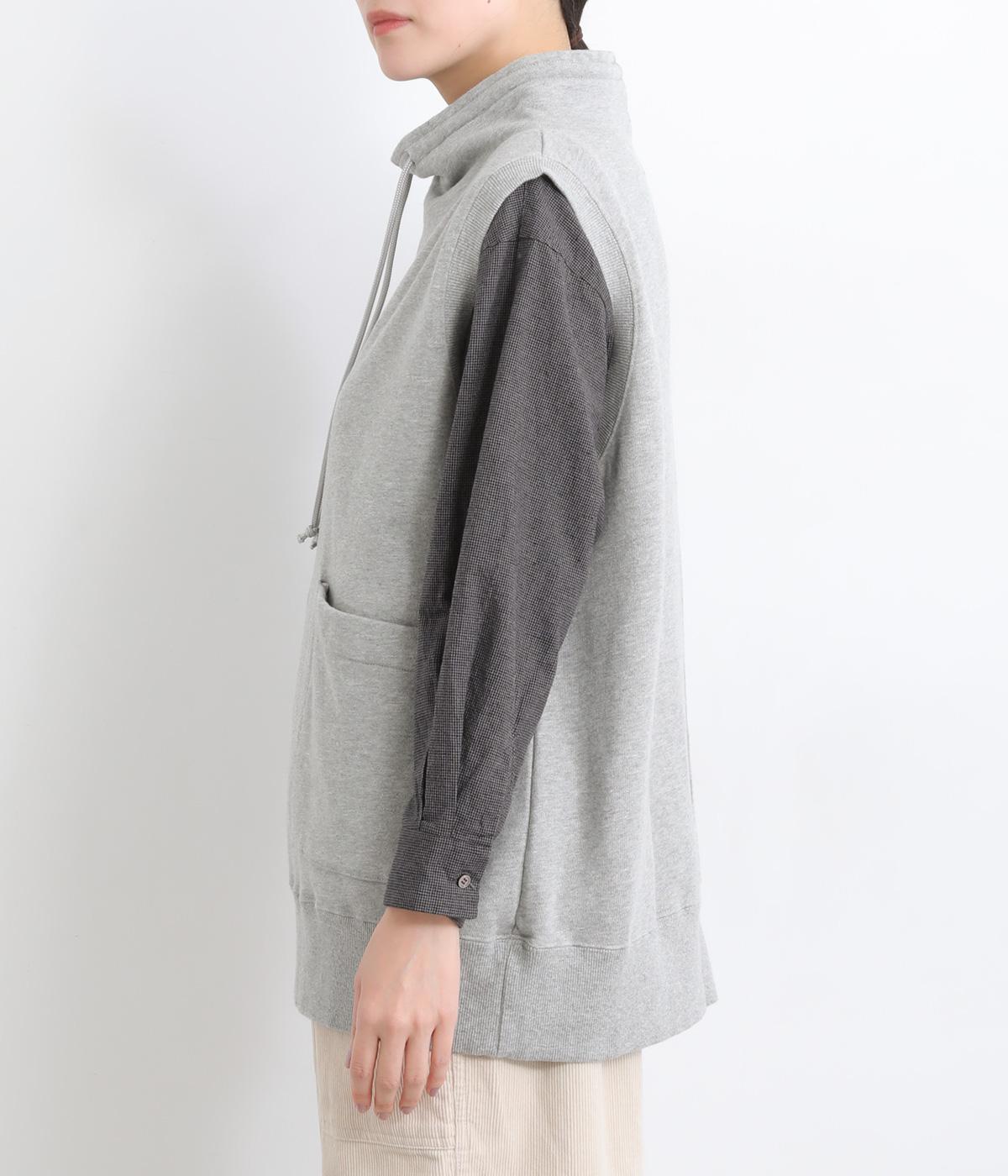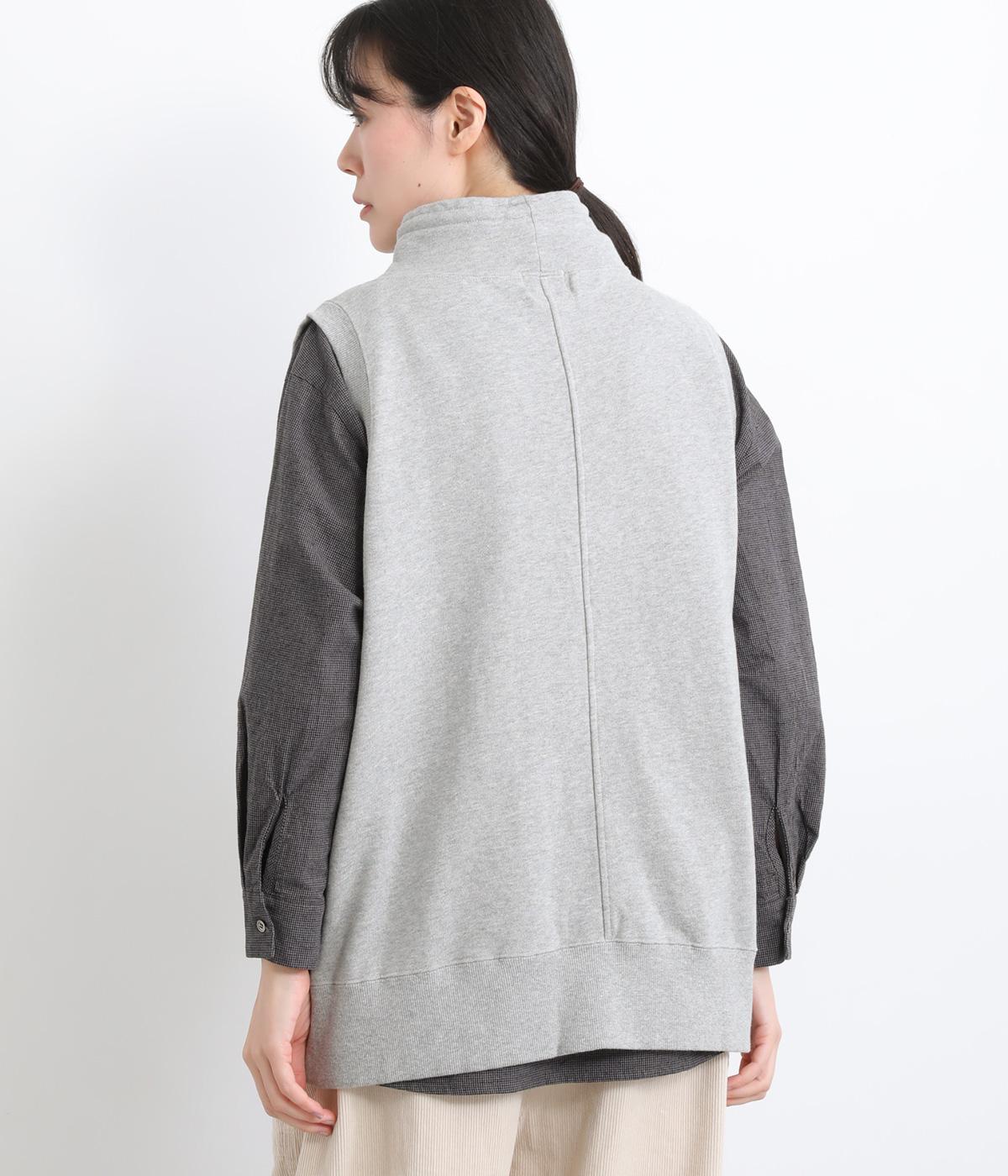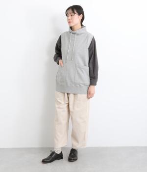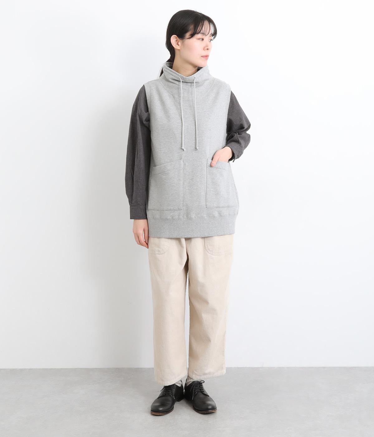 カジュアルなスウェット素材に、ハイネックの上品さをプラスしたベスト。首元のドローストリングを軽くしぼることで、シルエットに変化をつけられます。肩まわりにゆとりを持たせているので、シャツやカットソー、ワンピースとの重ね着にもぴったりです。