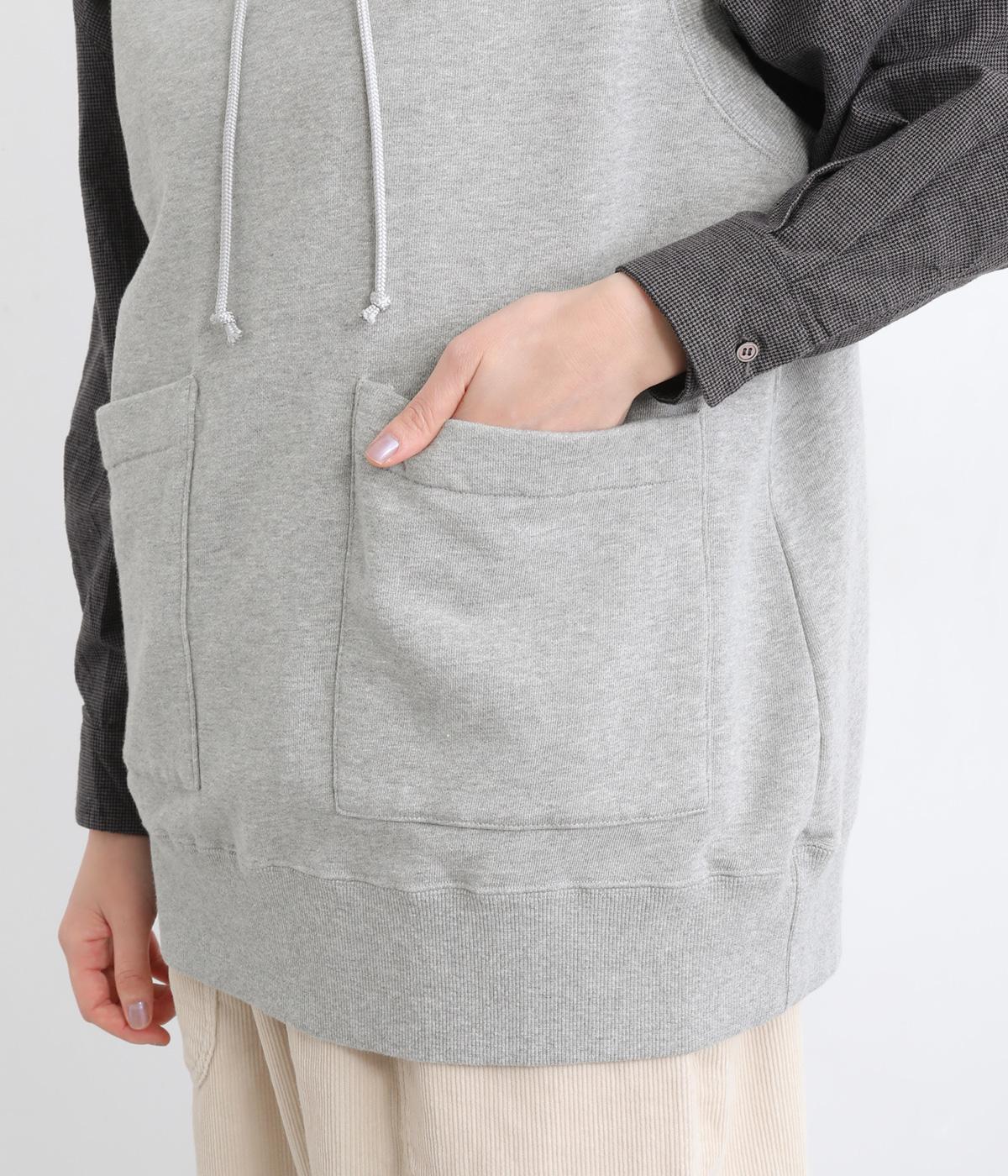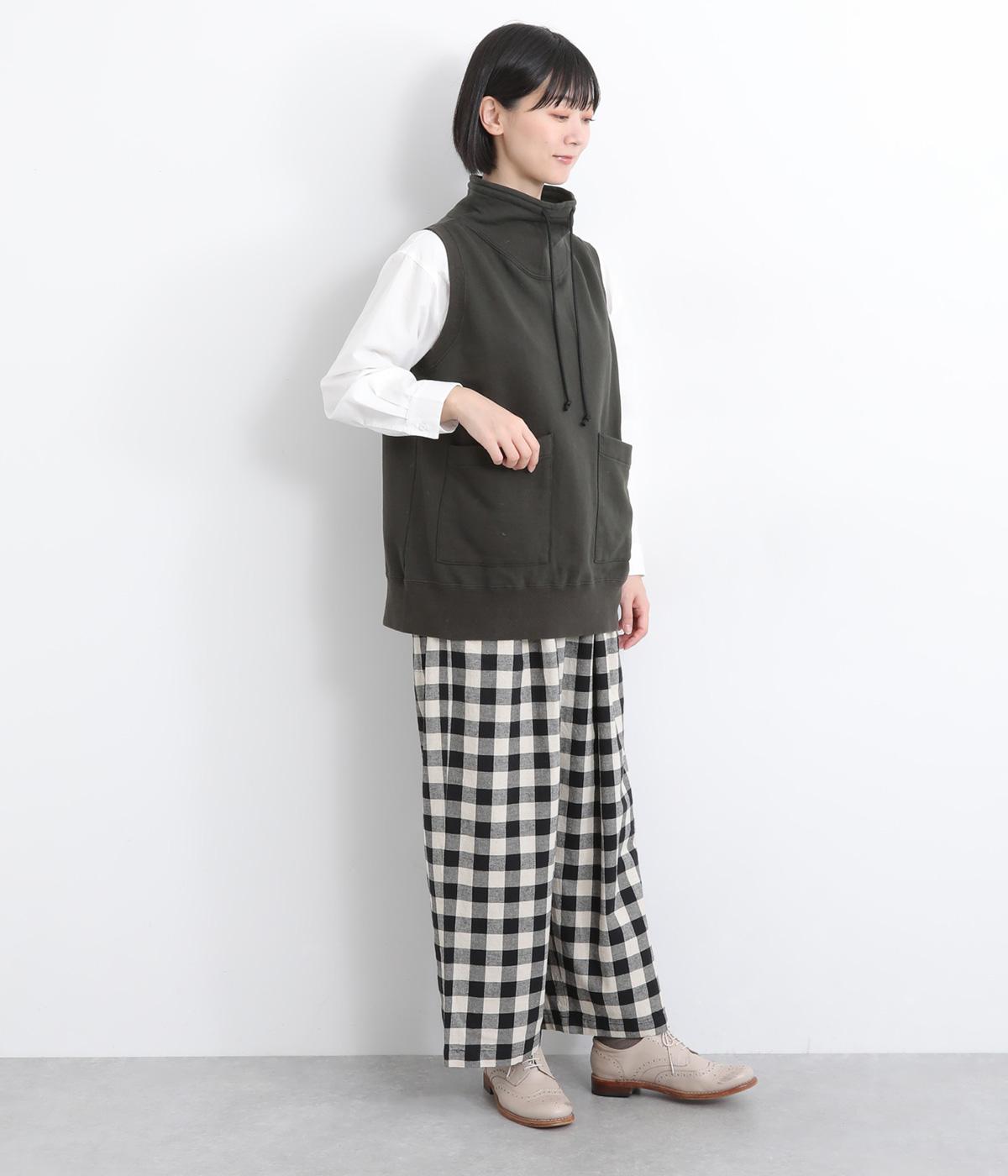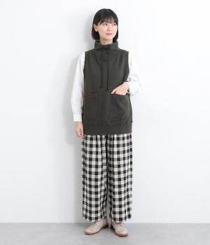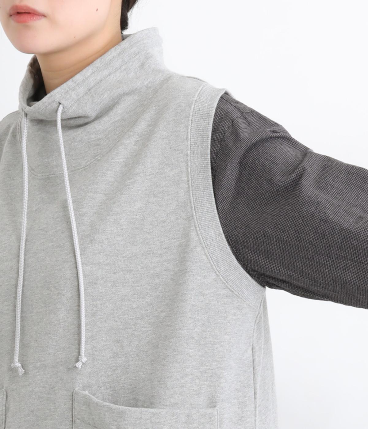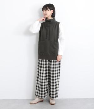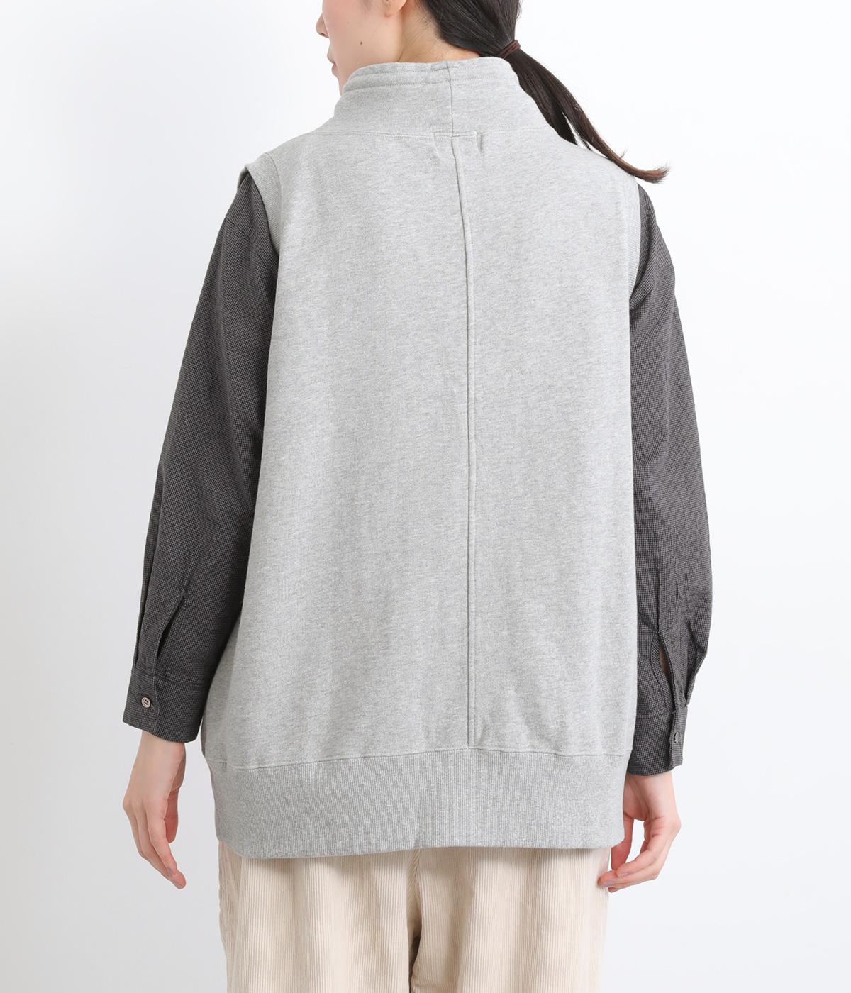 カジュアルなスウェット素材に、ハイネックの上品さをプラスしたベスト。首元のドローストリングを軽くしぼることで、シルエットに変化をつけられます。肩まわりにゆとりを持たせているので、シャツやカットソー、ワンピースとの重ね着にもぴったりです。