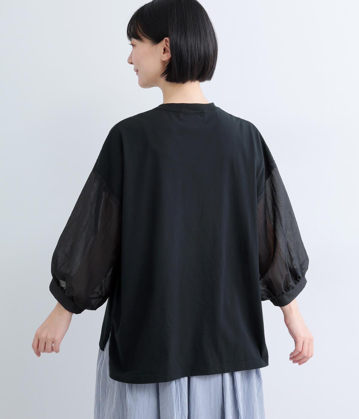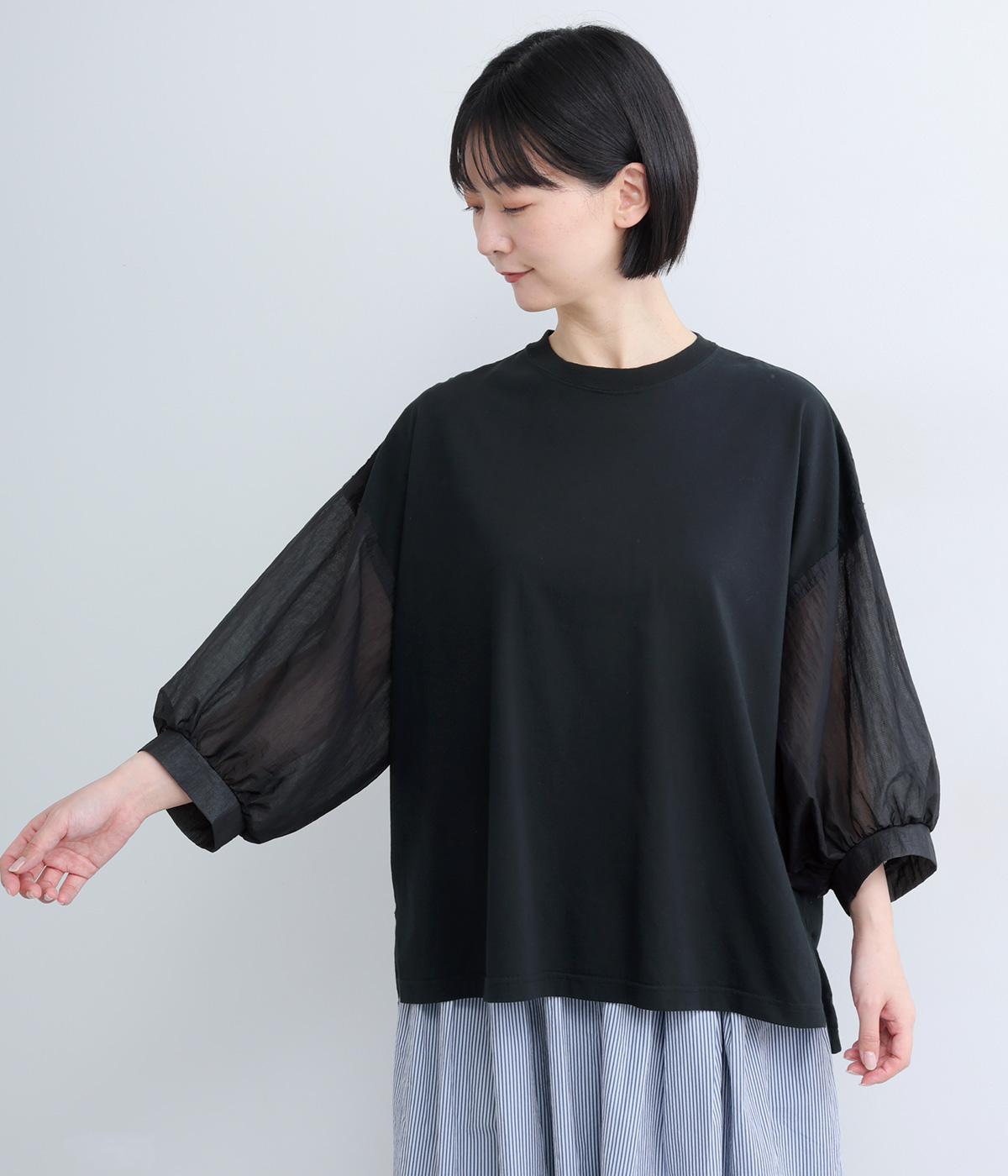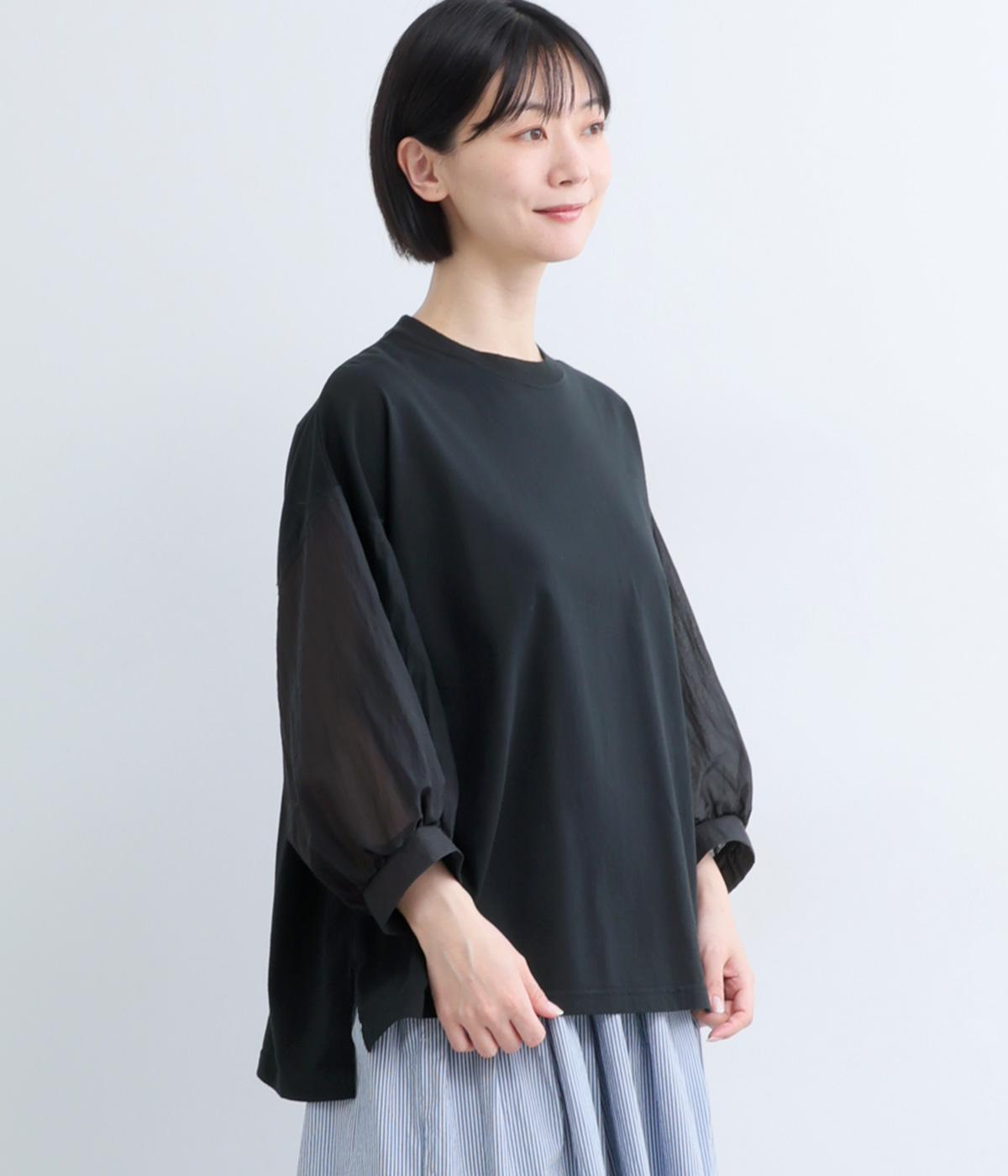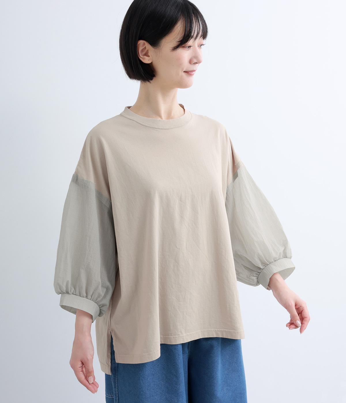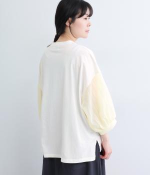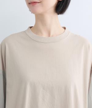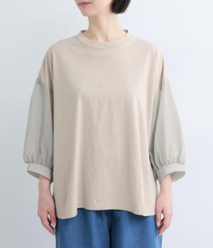なめらかな手ざわりが心地よいコットン天竺に、袖にはシアーなナイロン生地を組み合わせました。さらりと肌になじむ質感で、デイリーユースにぴったりの素材感です。