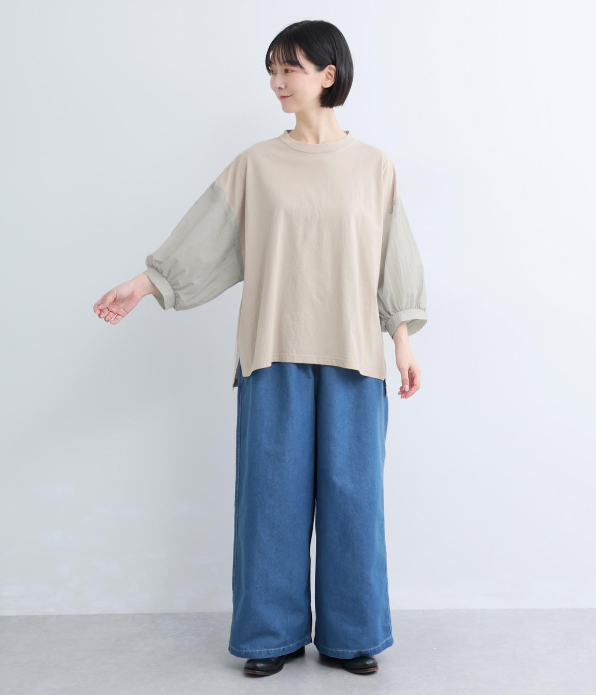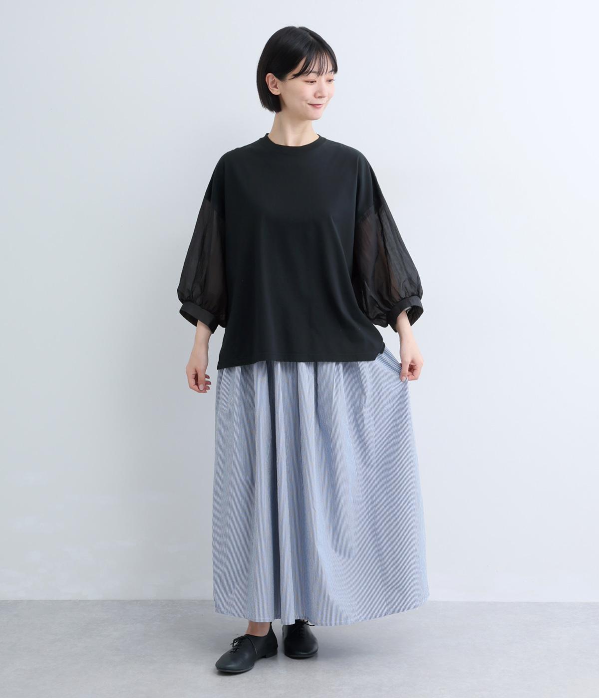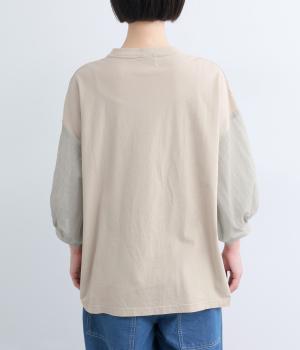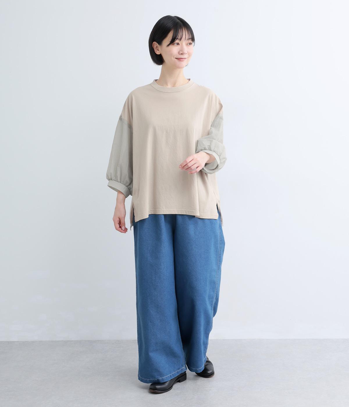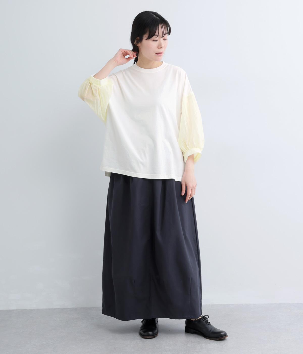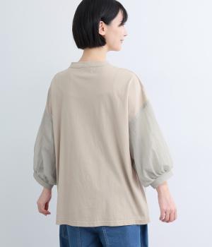 なめらかな手ざわりが心地よいコットン天竺に、袖にはシアーなナイロン生地を組み合わせました。さらりと肌になじむ質感で、デイリーユースにぴったりの素材感です。