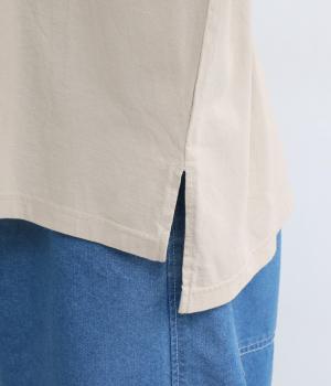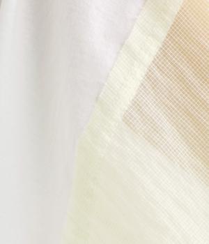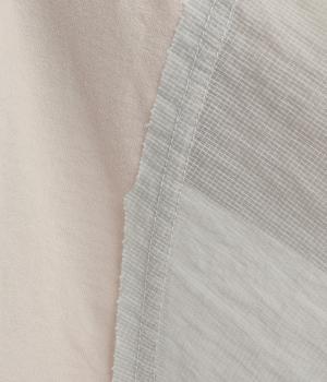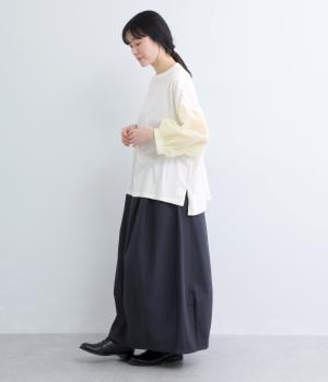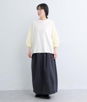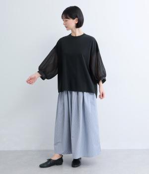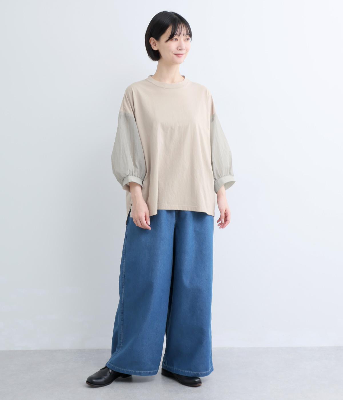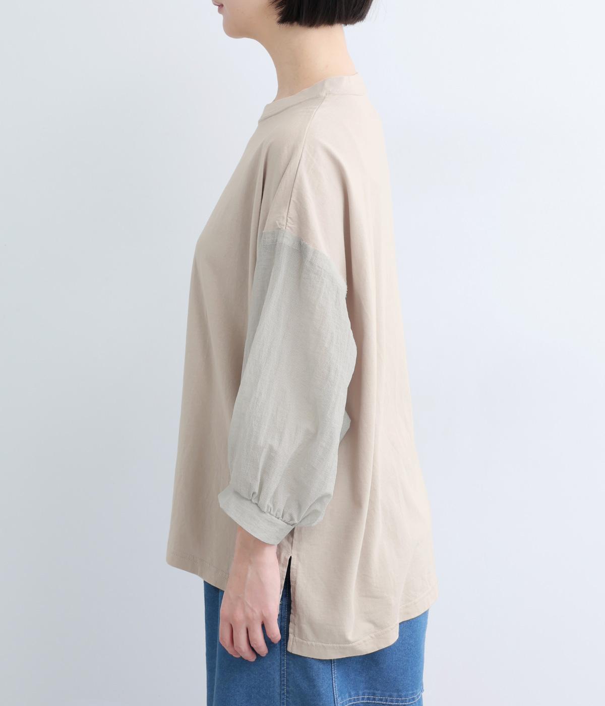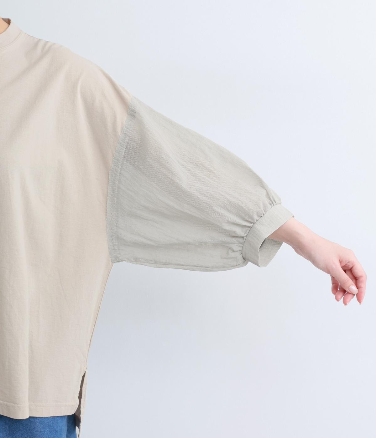 なめらかな手ざわりが心地よいコットン天竺に、袖にはシアーなナイロン生地を組み合わせました。さらりと肌になじむ質感で、デイリーユースにぴったりの素材感です。