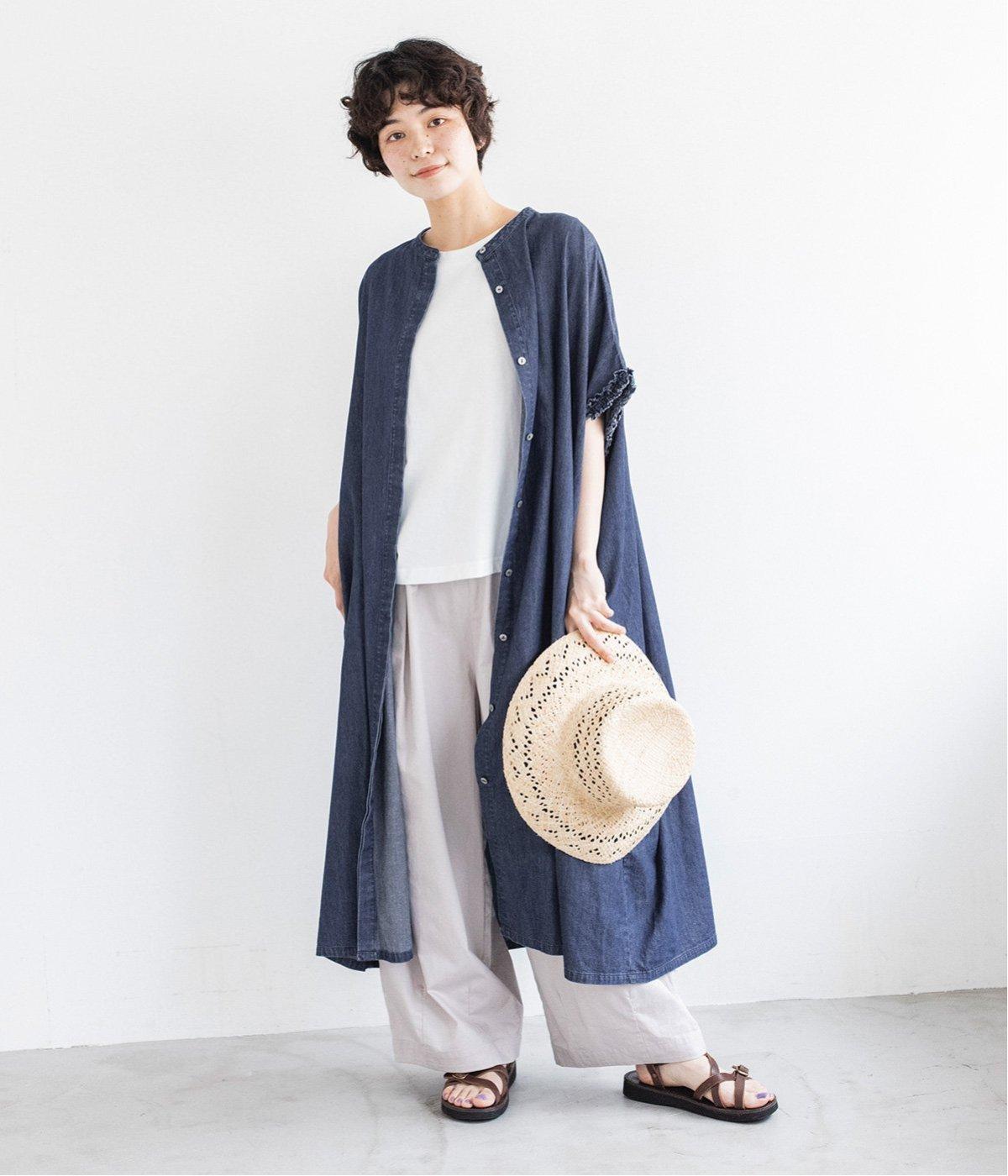 袖は肘にかかるくらいの安心の丈感。風が通り抜けるようなワイドな身幅のため、着心地も涼やか。