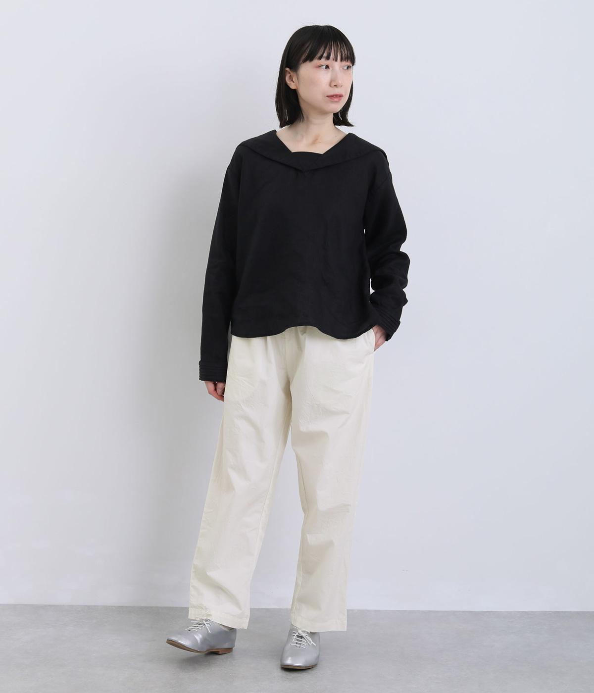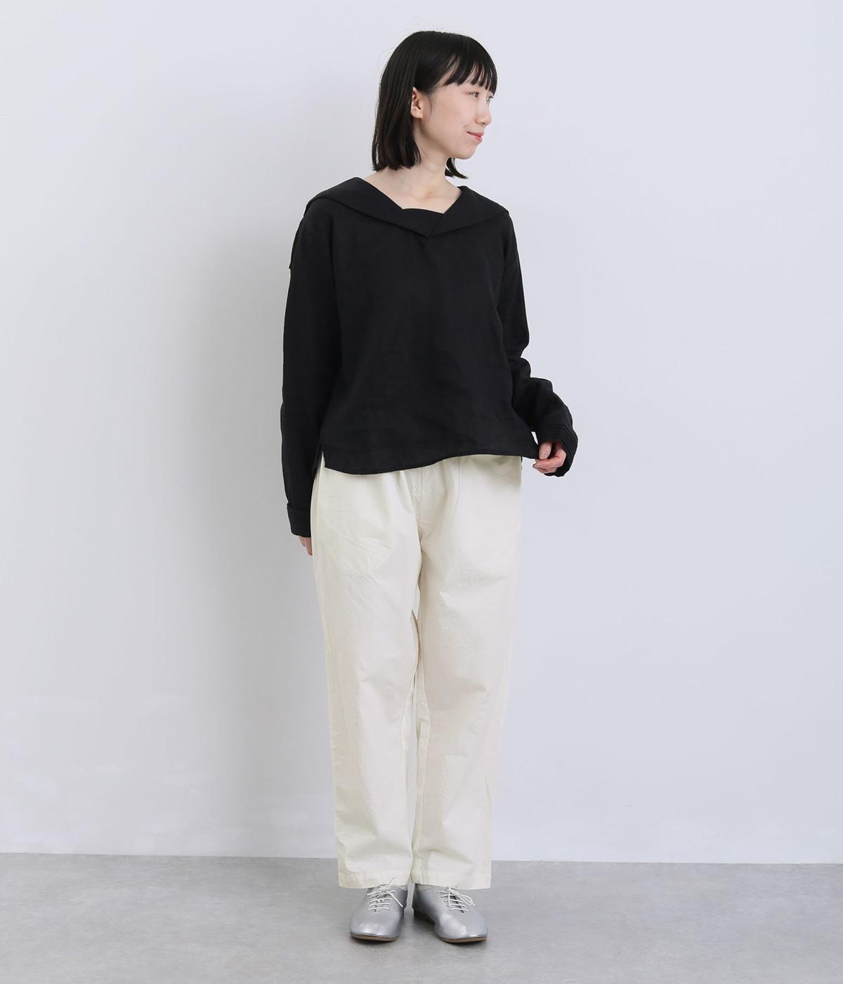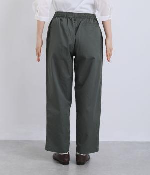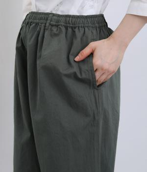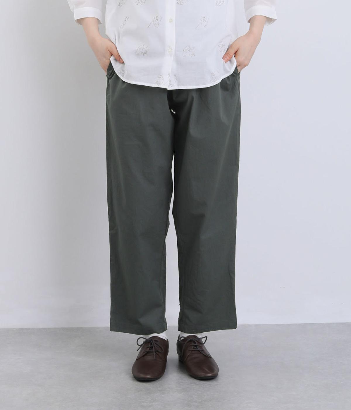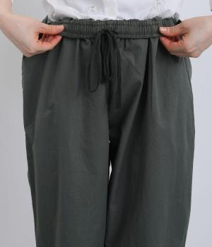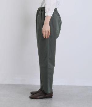 ほどよくゆとりを持たせながら、裾に向かってやや細くなるテーパードシルエットが特徴です。脚のラインをすっきり見せつつ、リラックス感のあるはき心地に。ウエストはゴム仕様で、紐でフィット感を調節できます。シンプルなデザインで、日々のコーディネートに取り入れやすい一本です。