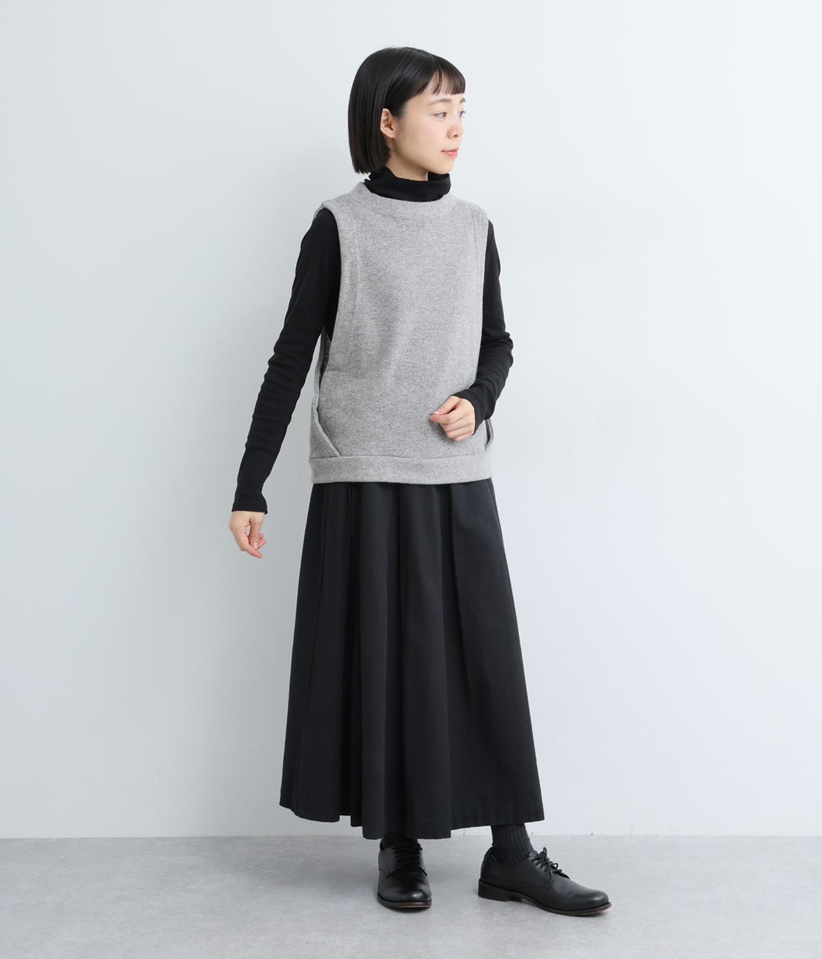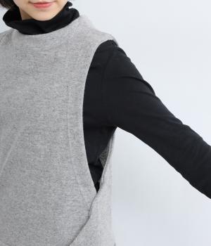サイドを交差させたカシュクールデザインが特徴的なベスト。前後はすっきりシンプルにまとめているので柄アイテムなどとも合わせやすく、袖ぐりも広く開いているのでボリュームトップスとも好相性。すっきり見える脇ラインが◎。