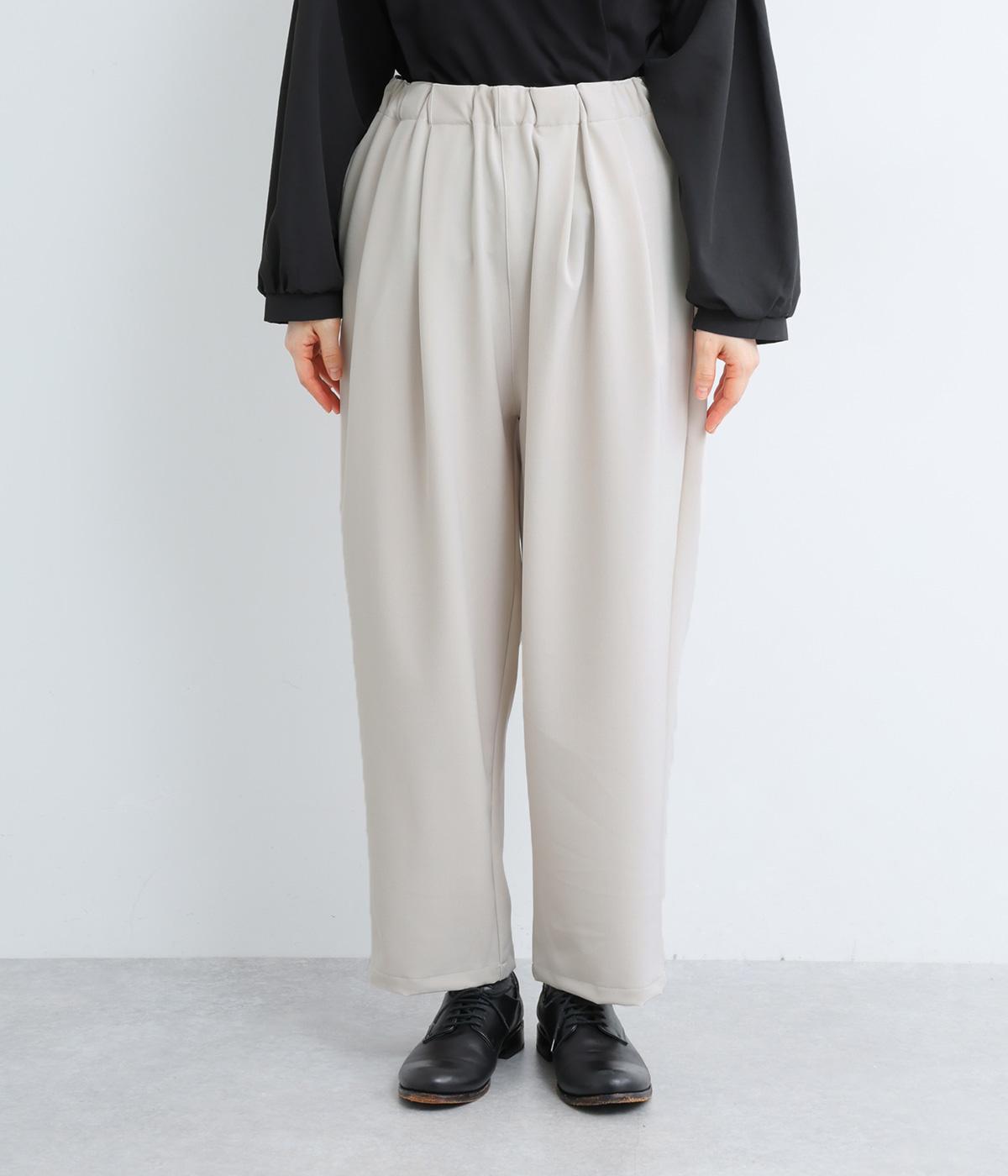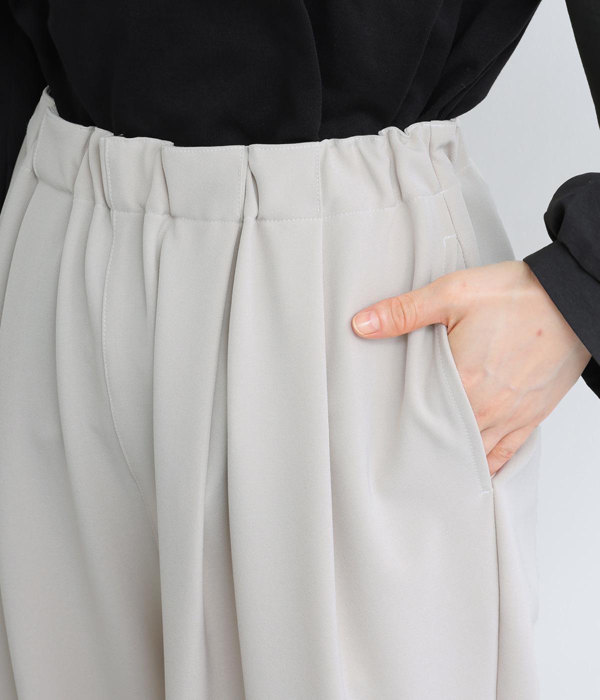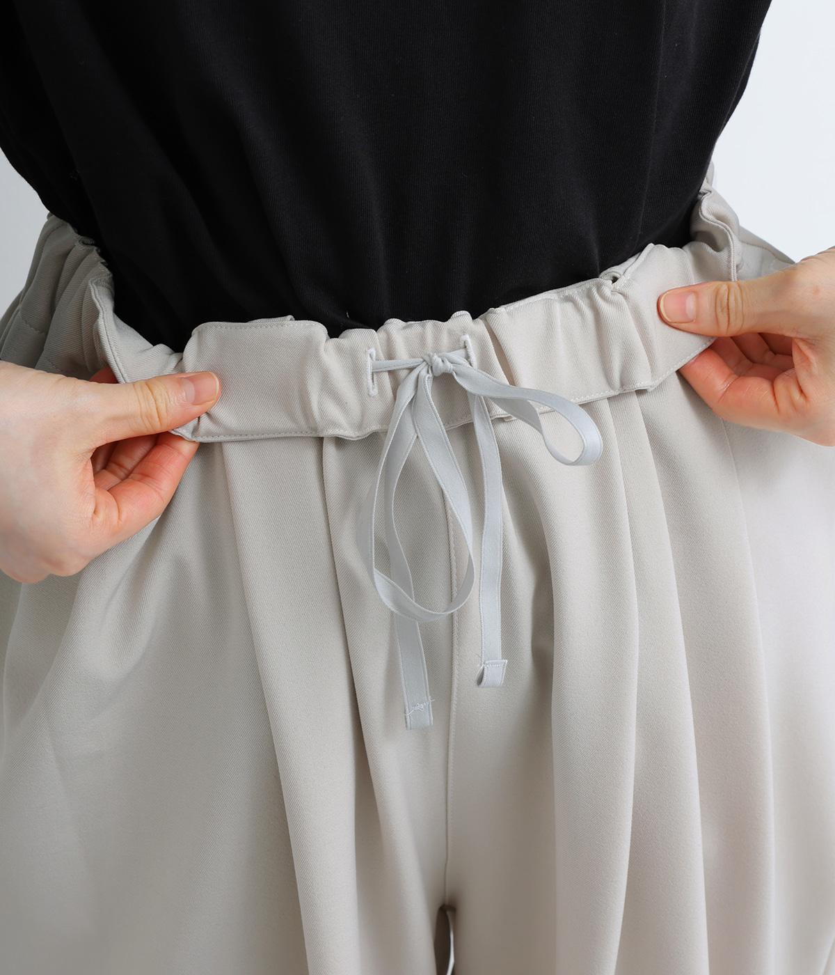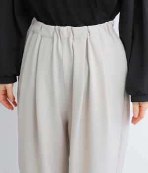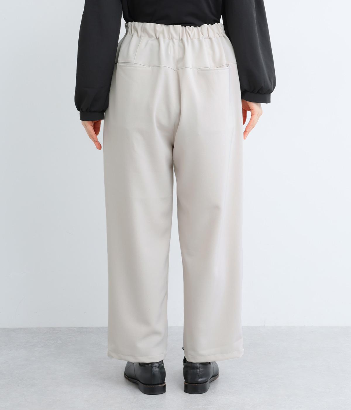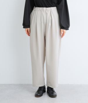 タックを入れて心地よいゆとりを持たせながらもしなやかに落ちる生地感ですっきりまとめました。ウエストは安定感のある総太平ゴムに内紐入り。ほのかな光沢できれいめスタイルにも活躍する優秀なイージーパンツです。