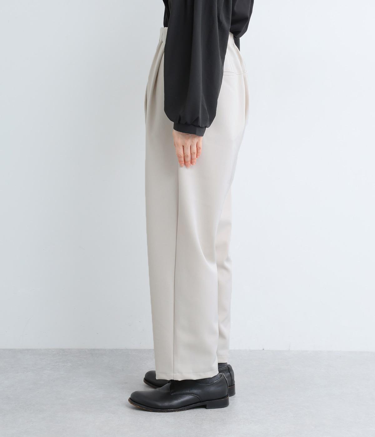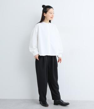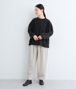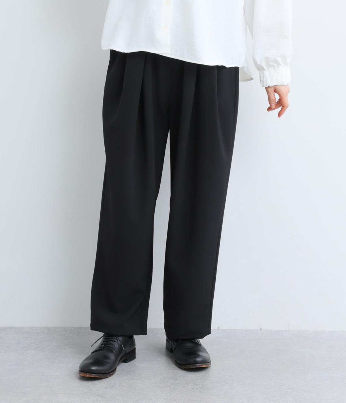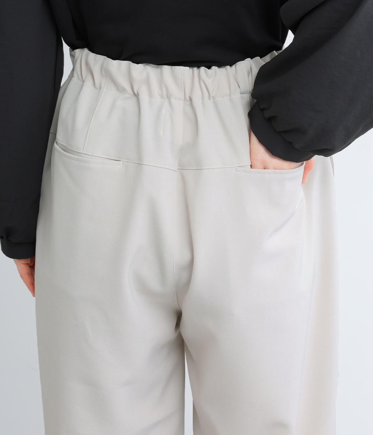 タックを入れて心地よいゆとりを持たせながらもしなやかに落ちる生地感ですっきりまとめました。ウエストは安定感のある総太平ゴムに内紐入り。ほのかな光沢できれいめスタイルにも活躍する優秀なイージーパンツです。