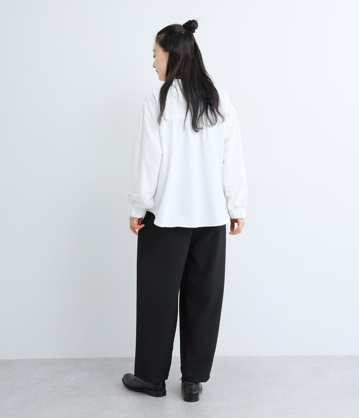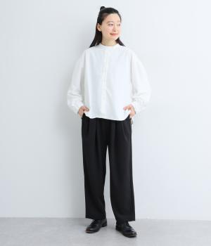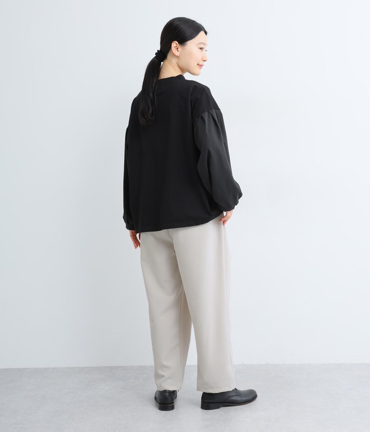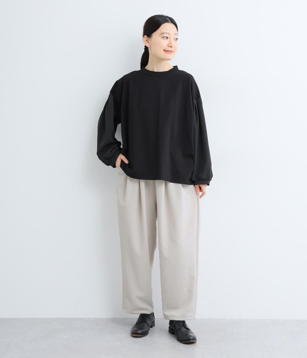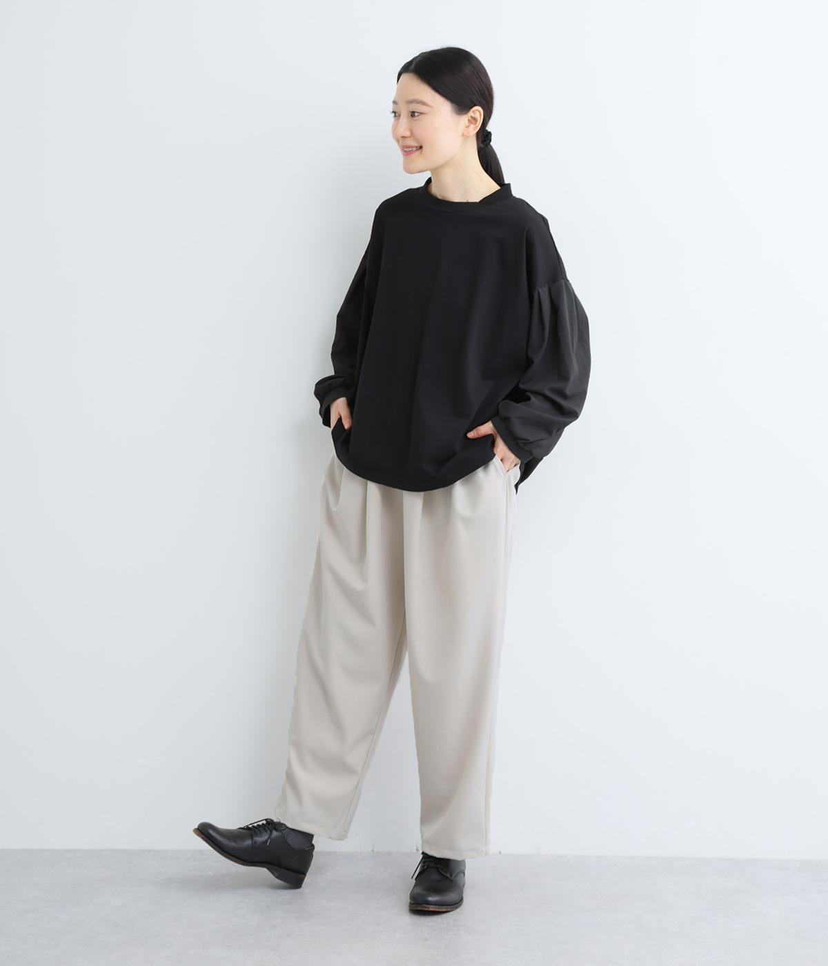 タックを入れて心地よいゆとりを持たせながらもしなやかに落ちる生地感ですっきりまとめました。ウエストは安定感のある総太平ゴムに内紐入り。ほのかな光沢できれいめスタイルにも活躍する優秀なイージーパンツです。