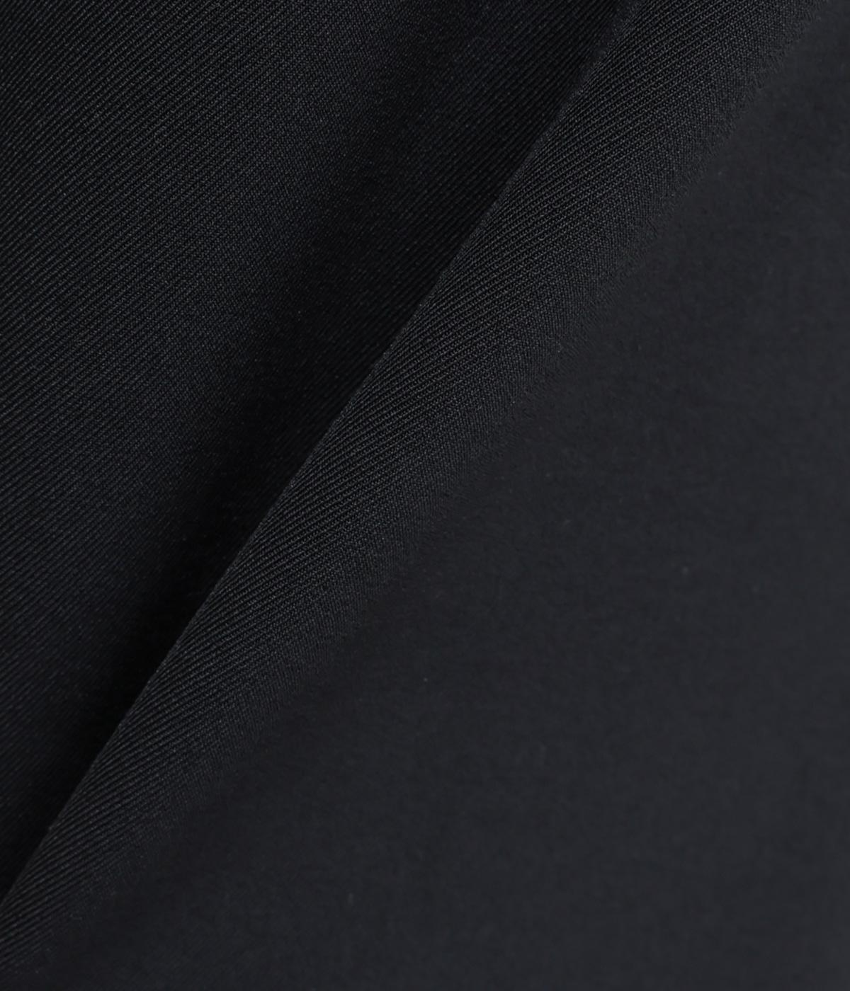 光沢感や奥行きのある表情が魅力的なメランジ生地を使用。ポリエステルをベースにしているので速乾性もよく軽やかで、わずかに伸縮性もあり快適に着用できます。