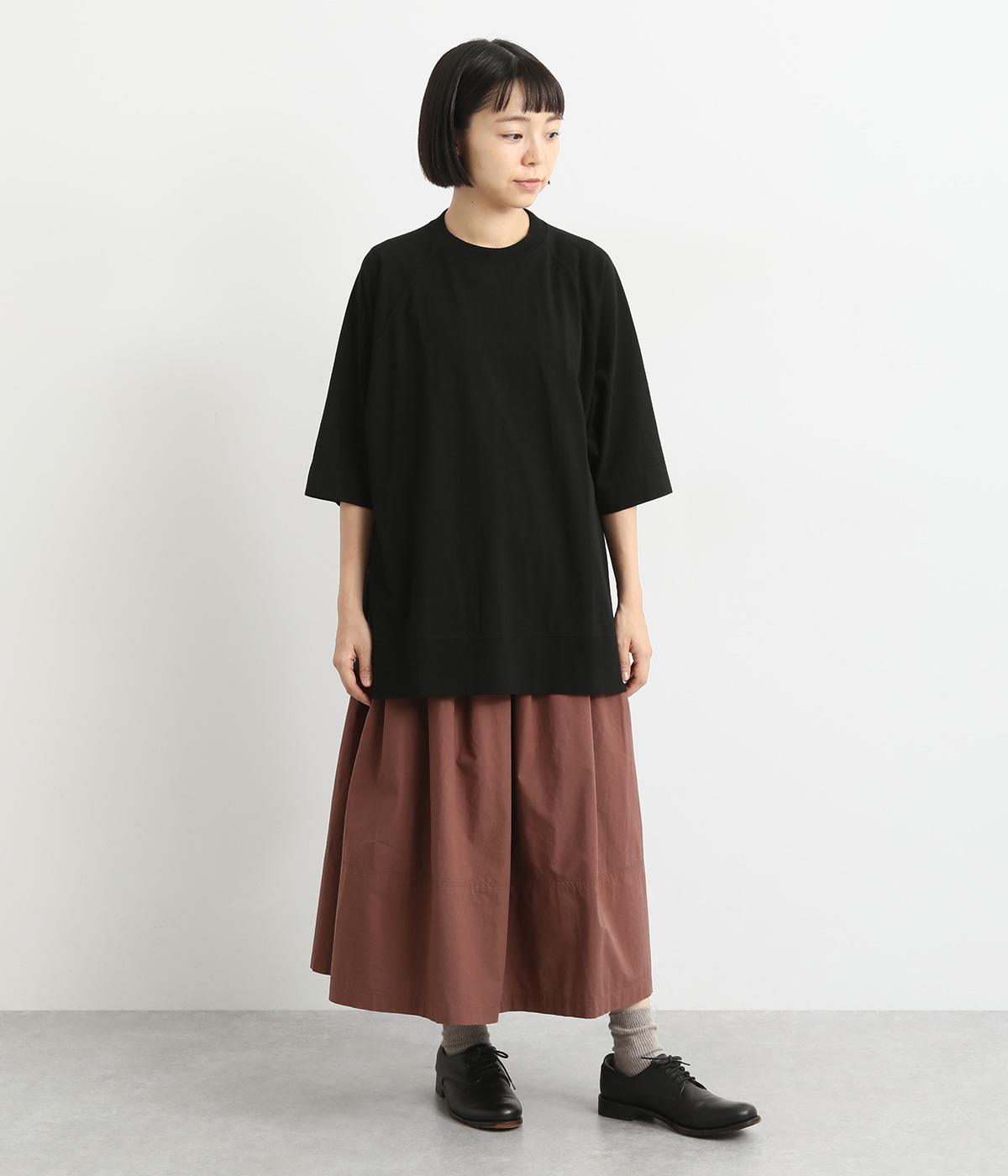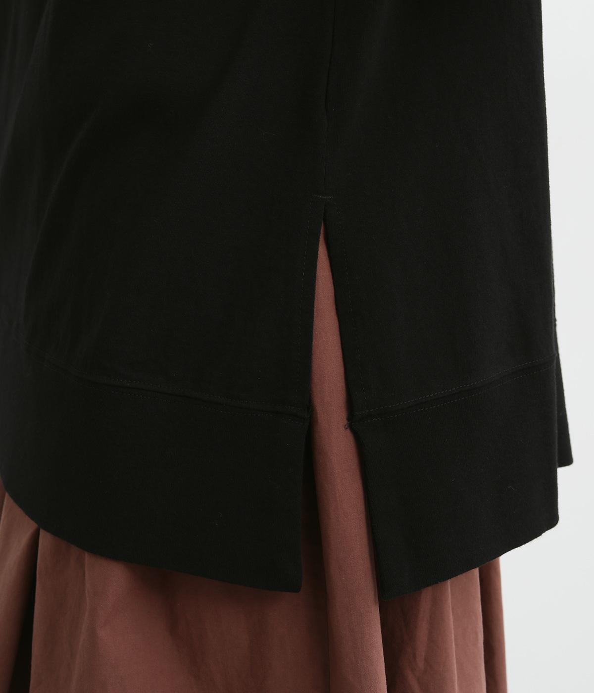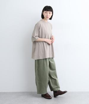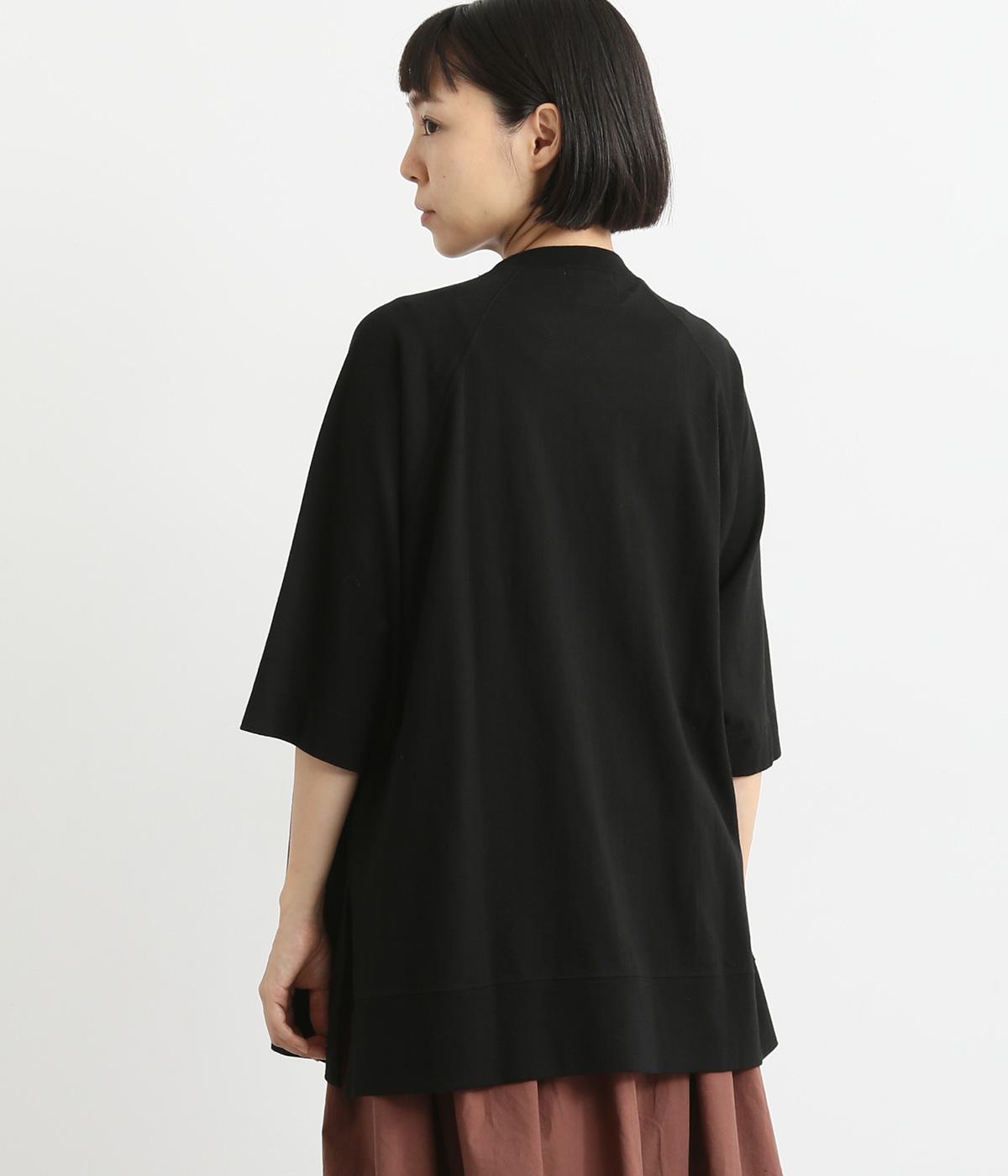 通常の天竺よりも密度を詰めて編み立てたコットン度詰天竺生地を使用しました。天竺の柔らかいなめらかな肌触りに、コシのあるタフな風合いが加わりました。