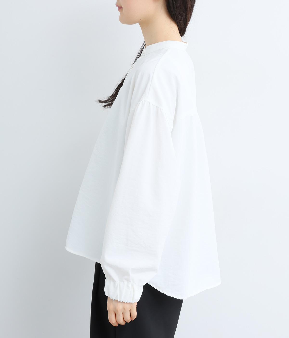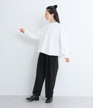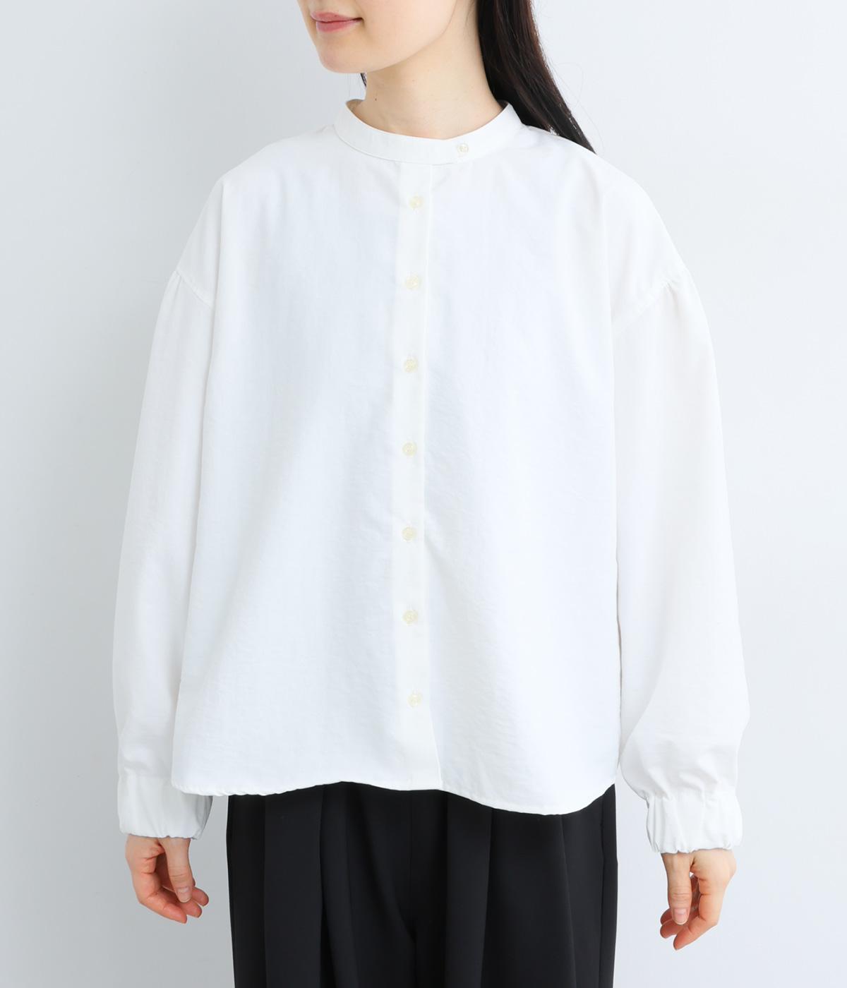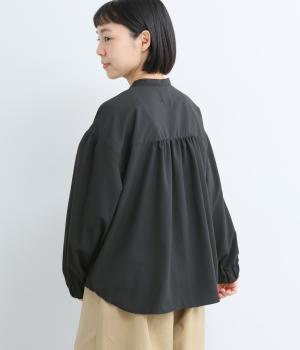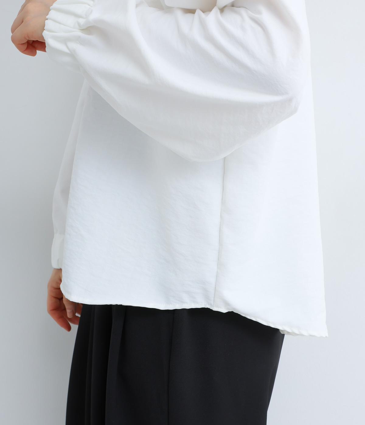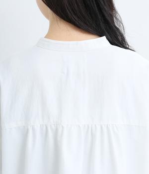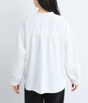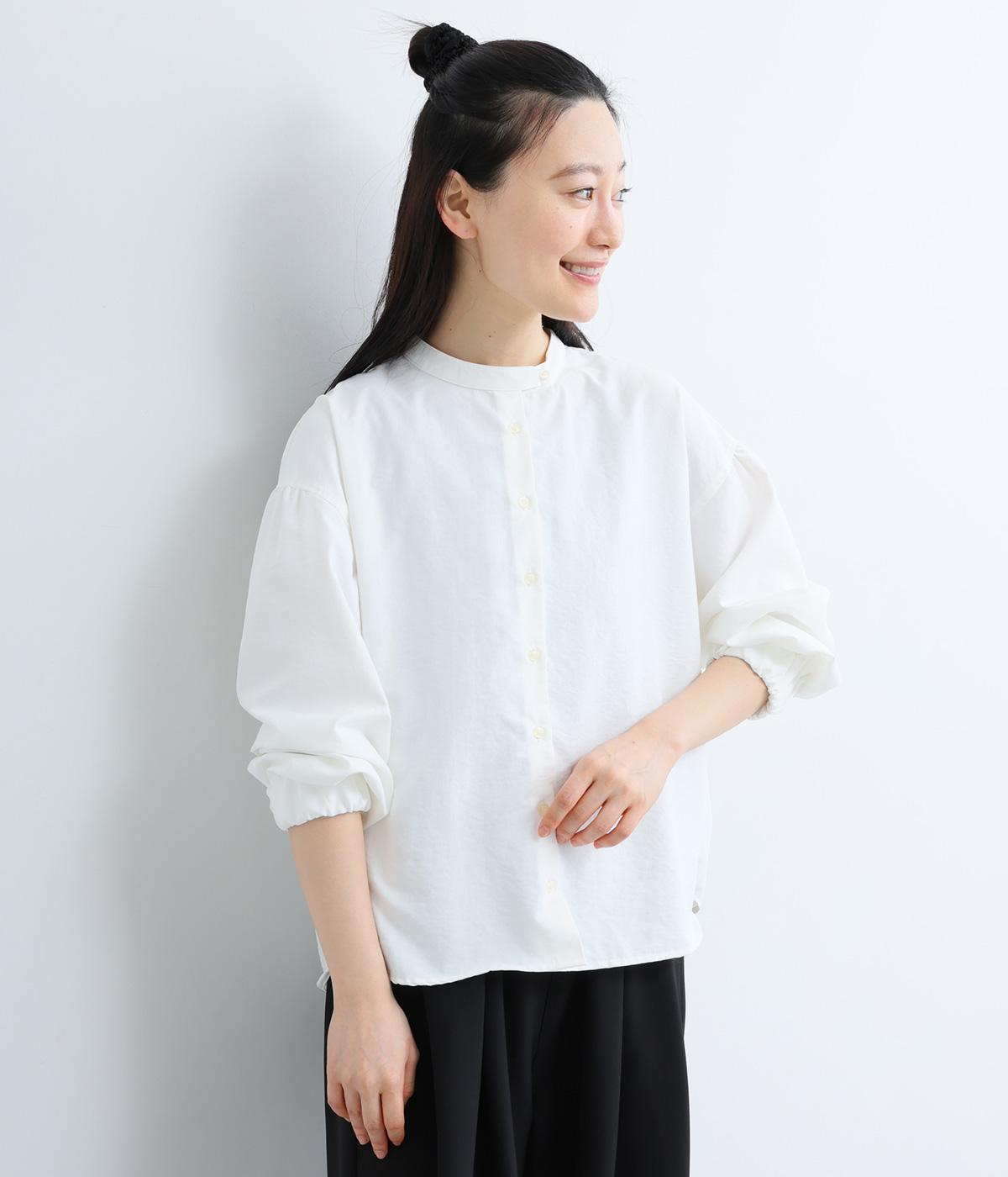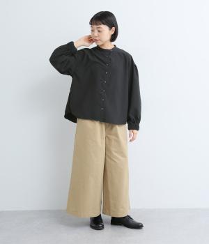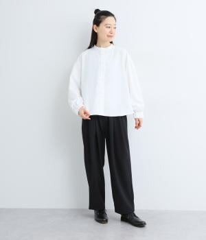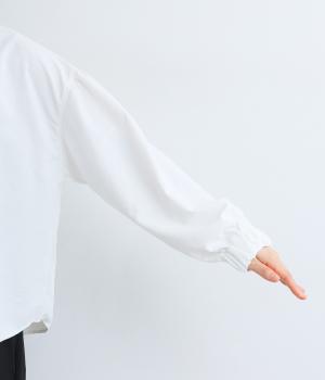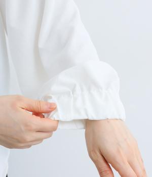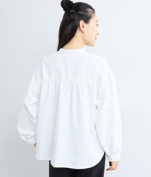 きれいめな装いに活躍するブロード生地のブラウス。ふわりとしたギャザー袖は袖口ゴム入りなのでたくし上げのアレンジもイージー。後ろ裾を長くとってラウンドさせているので、ラフなトップスアウトもお洒落見え。