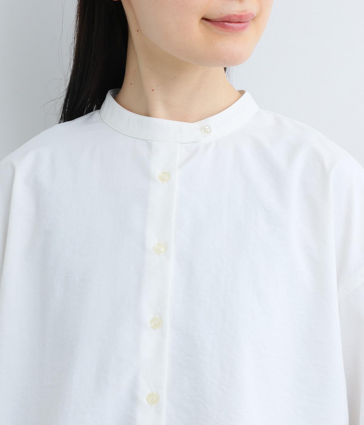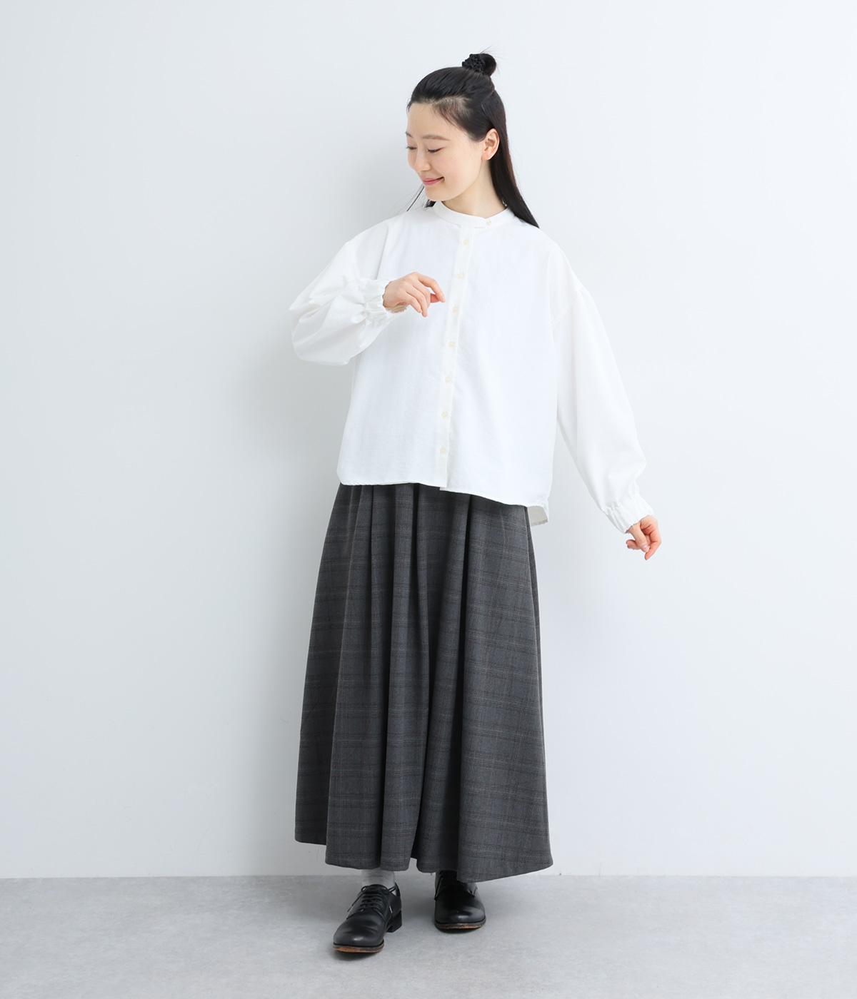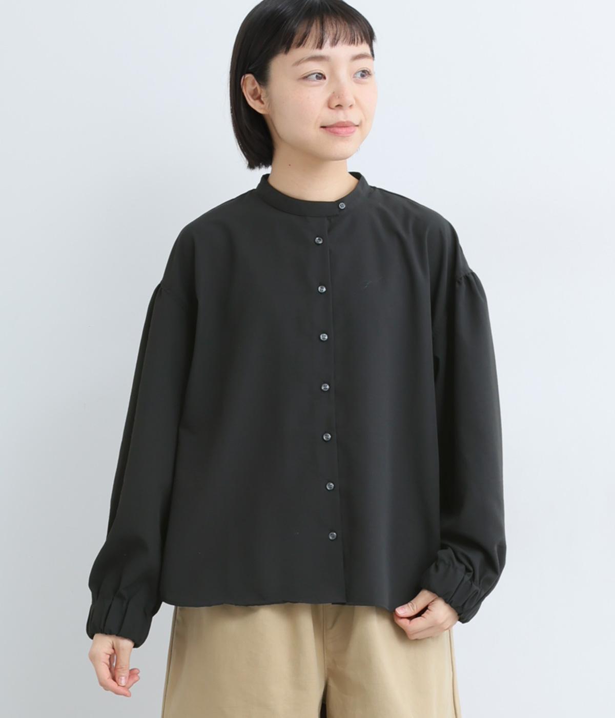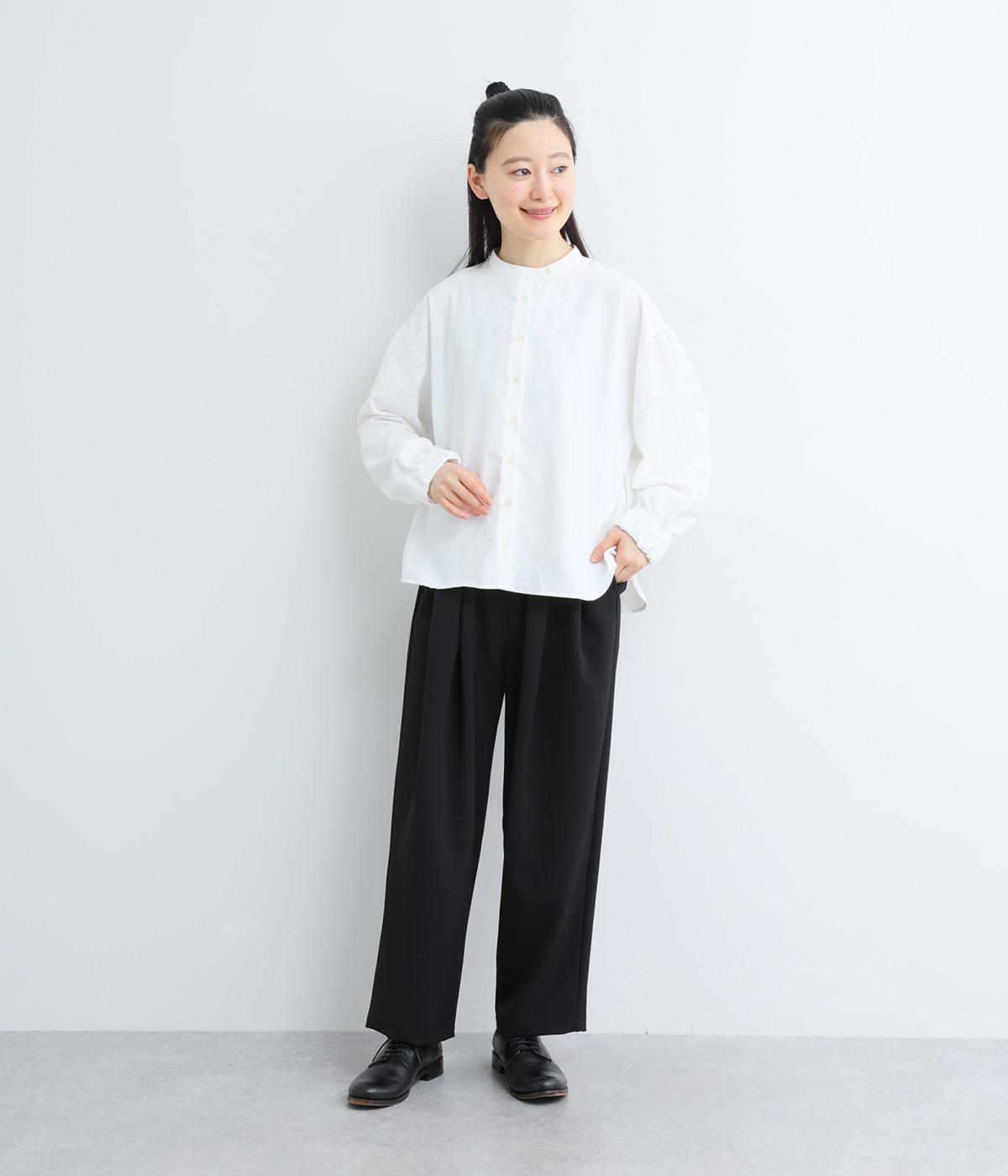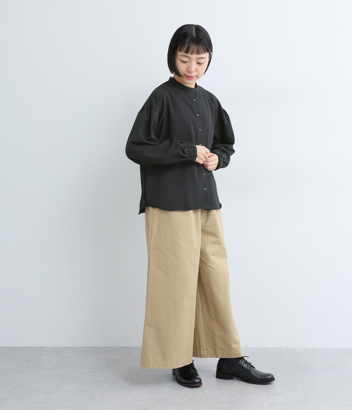 きれいめな装いに活躍するブロード生地のブラウス。ふわりとしたギャザー袖は袖口ゴム入りなのでたくし上げのアレンジもイージー。後ろ裾を長くとってラウンドさせているので、ラフなトップスアウトもお洒落見え。