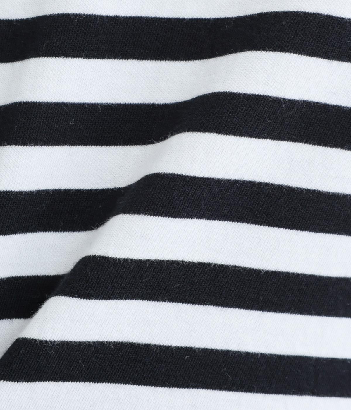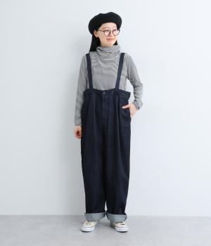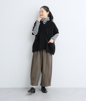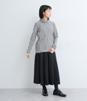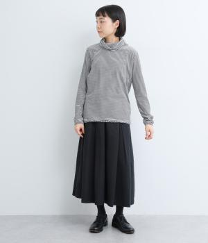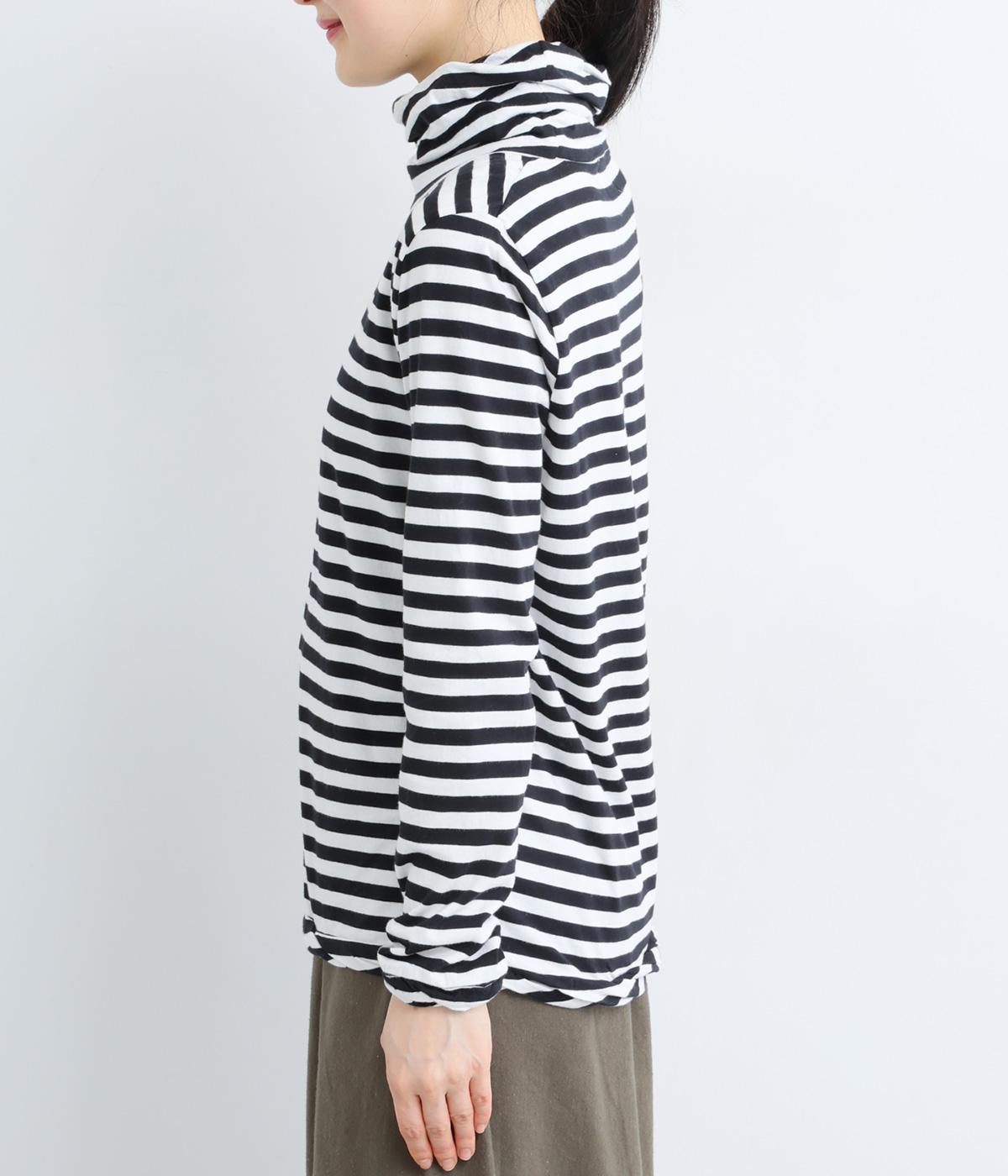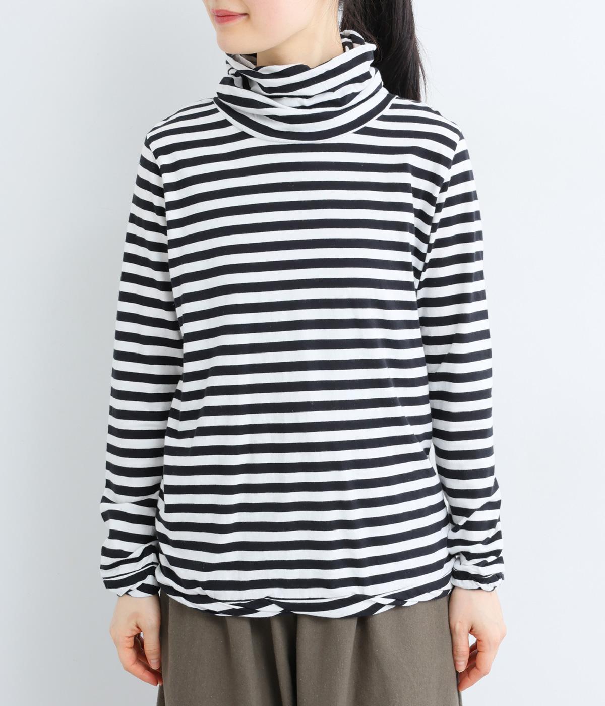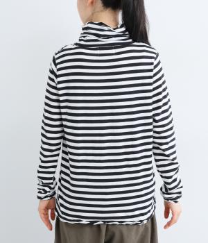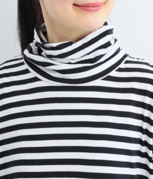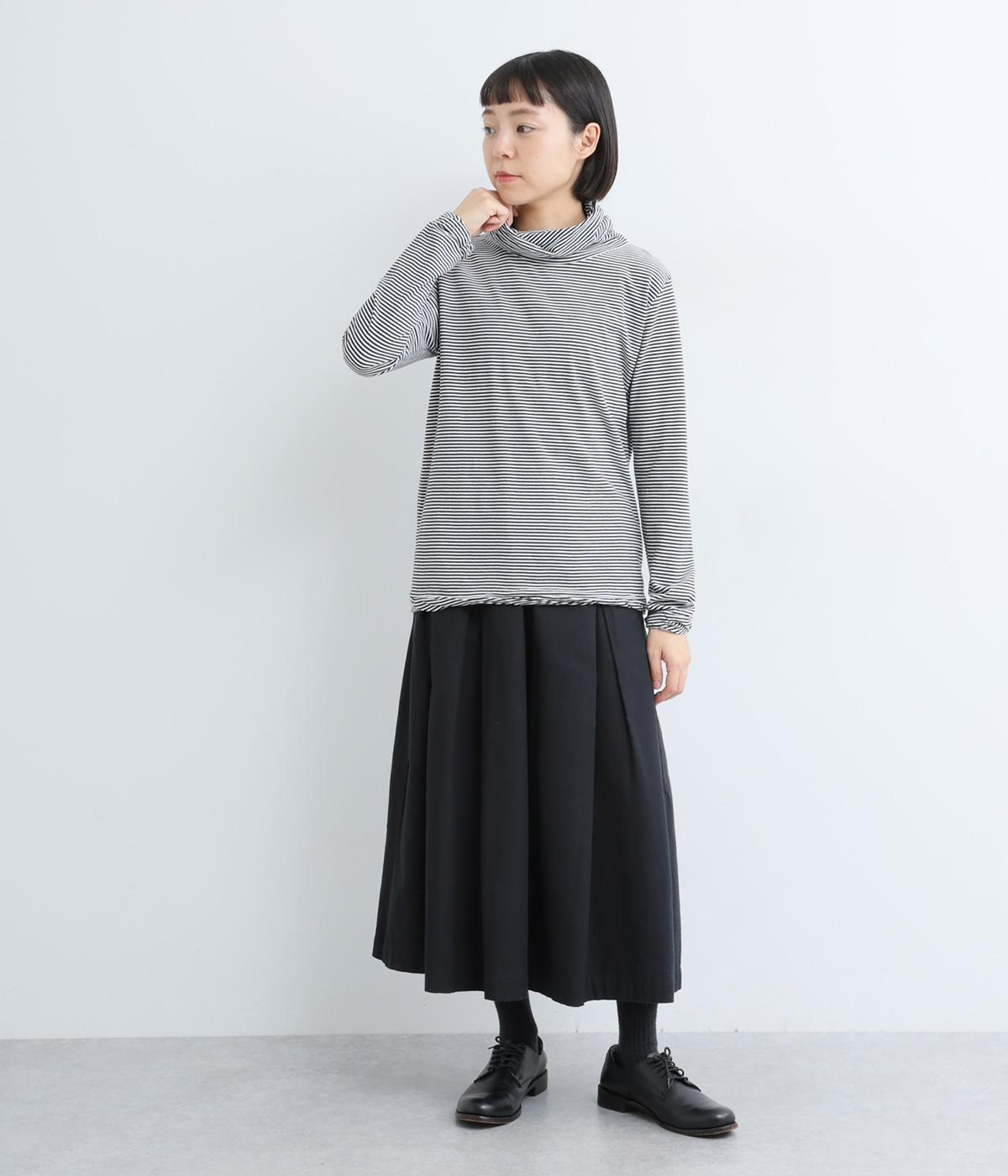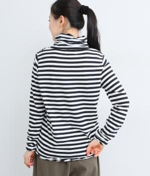 メインにもレイヤードのチラ見せにも活躍するボーダー柄プルオーバー。くしゅっとしたタートルネックが顔まわりにニュアンスを追加。袖口や裾はツイストさせてディテールにもこだわりました。