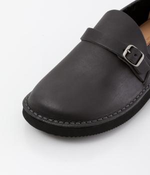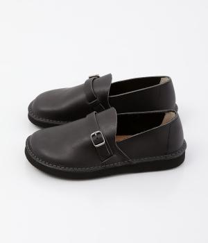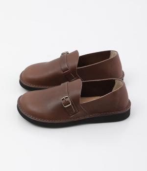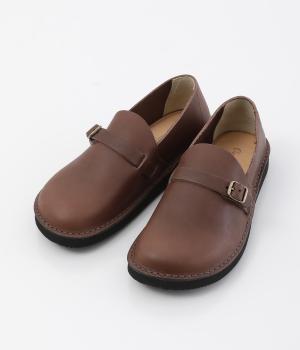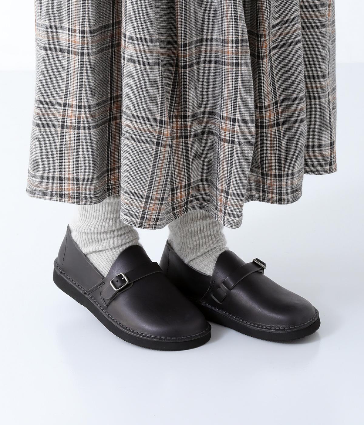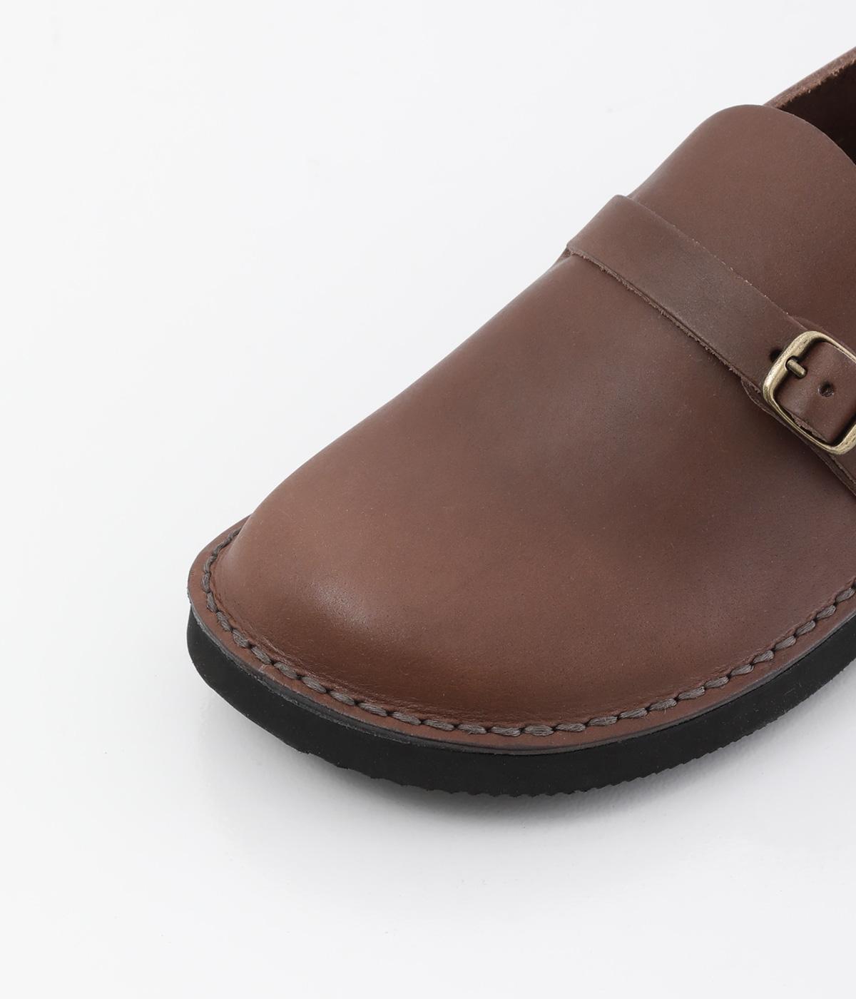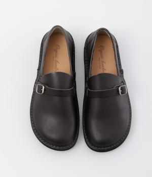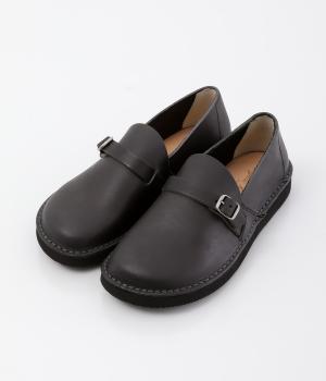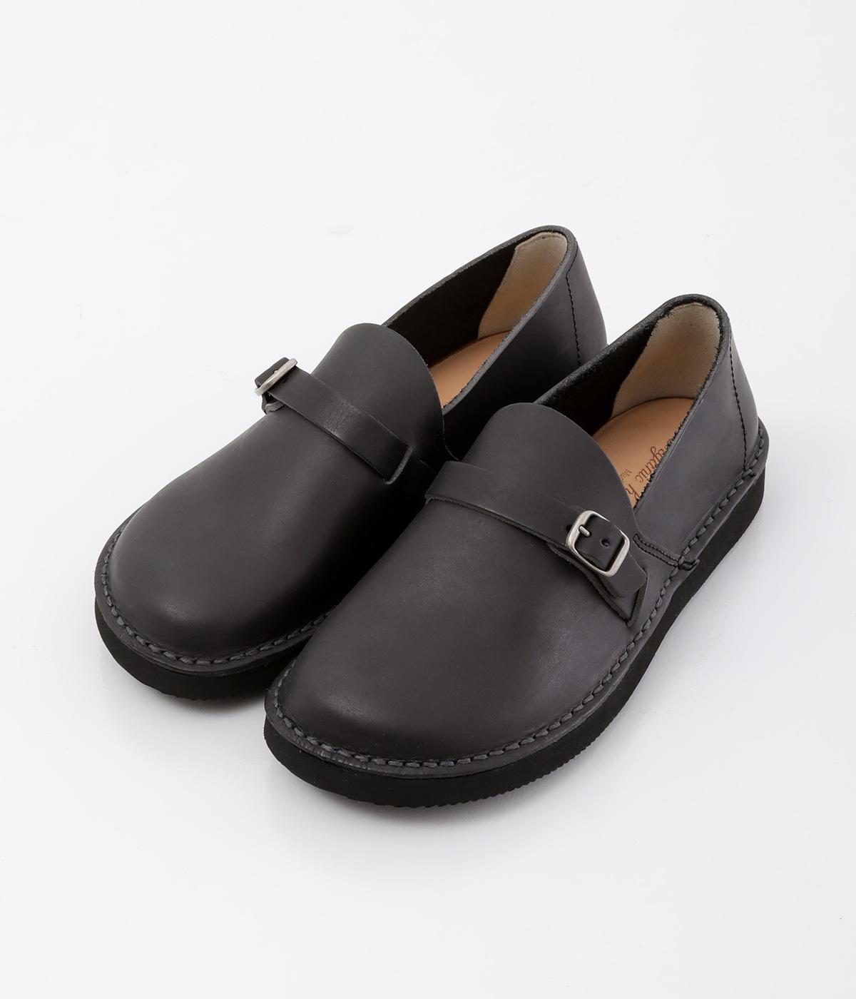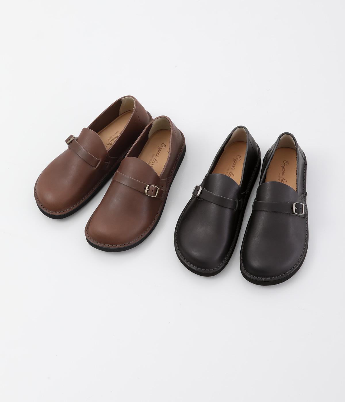 品のよいレザーの質感をいかしたシンプルなスリッポンシューズ。つま先の幅を広めに設定したころんとしたシルエットで履き心地のよさをアップしています。オンオフ問わず、さまざまな装いに合わせやすい一足です。