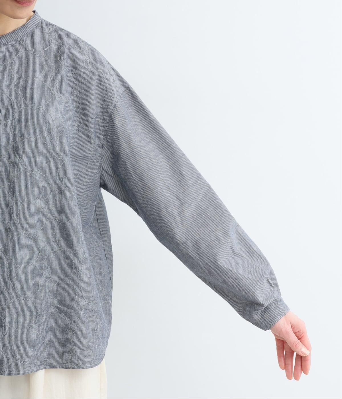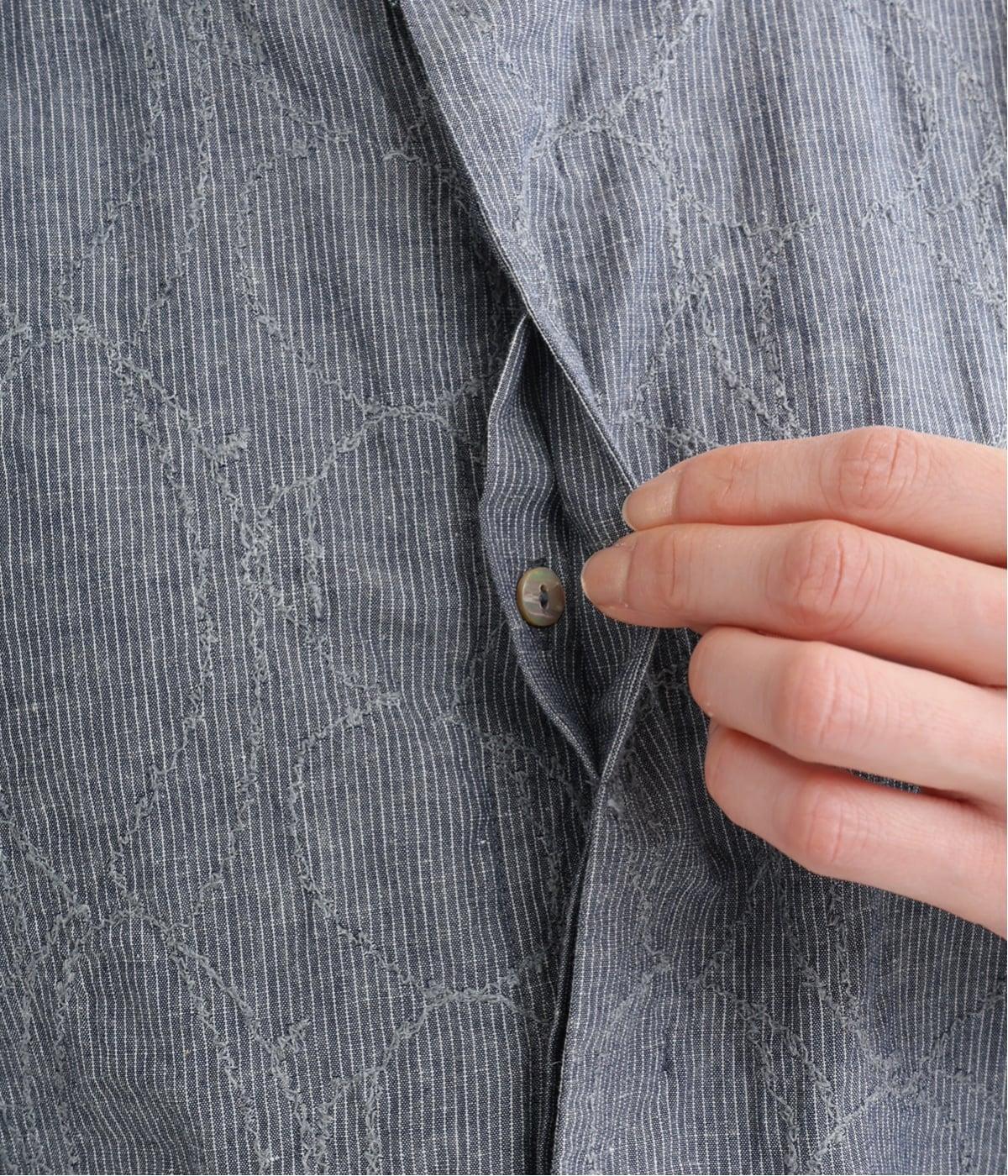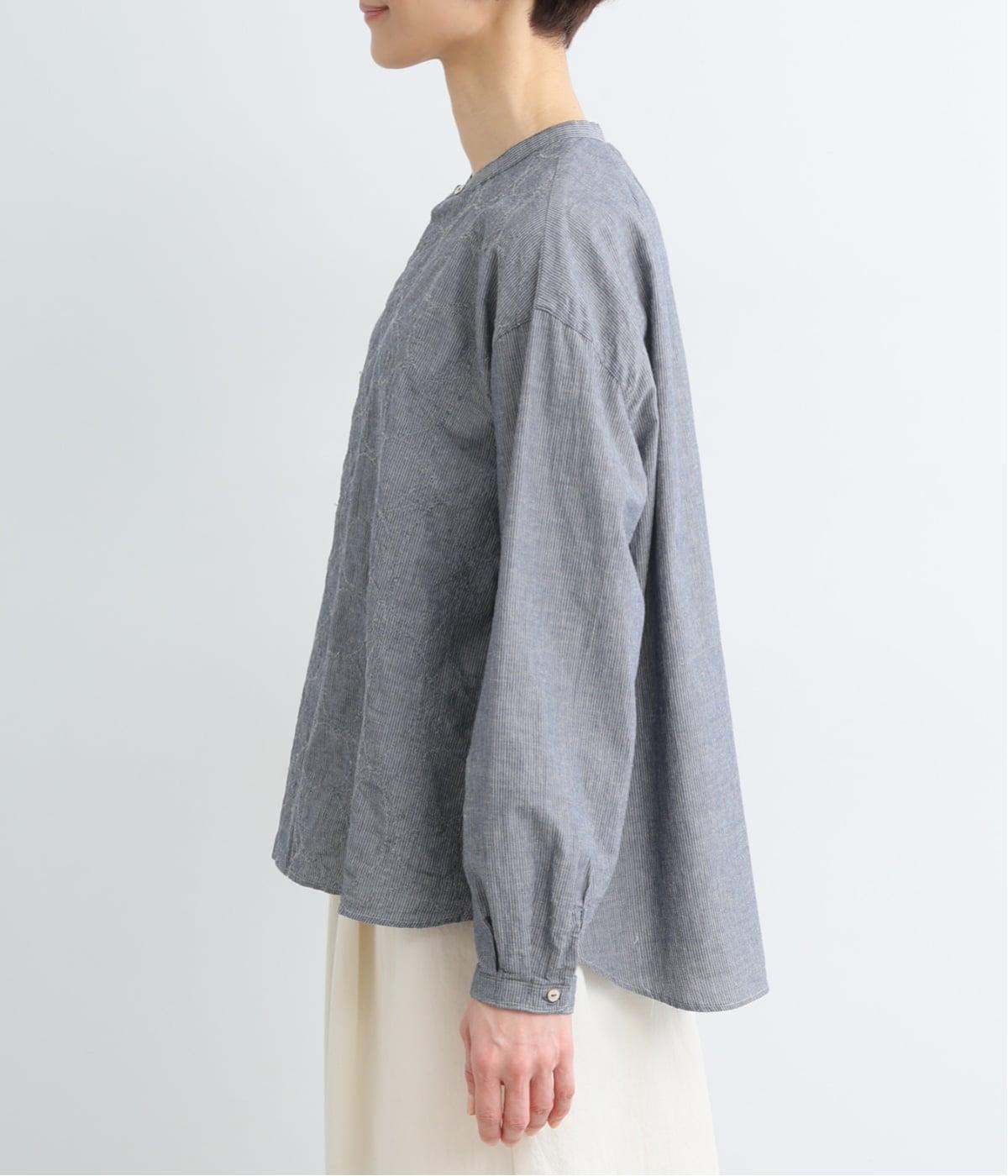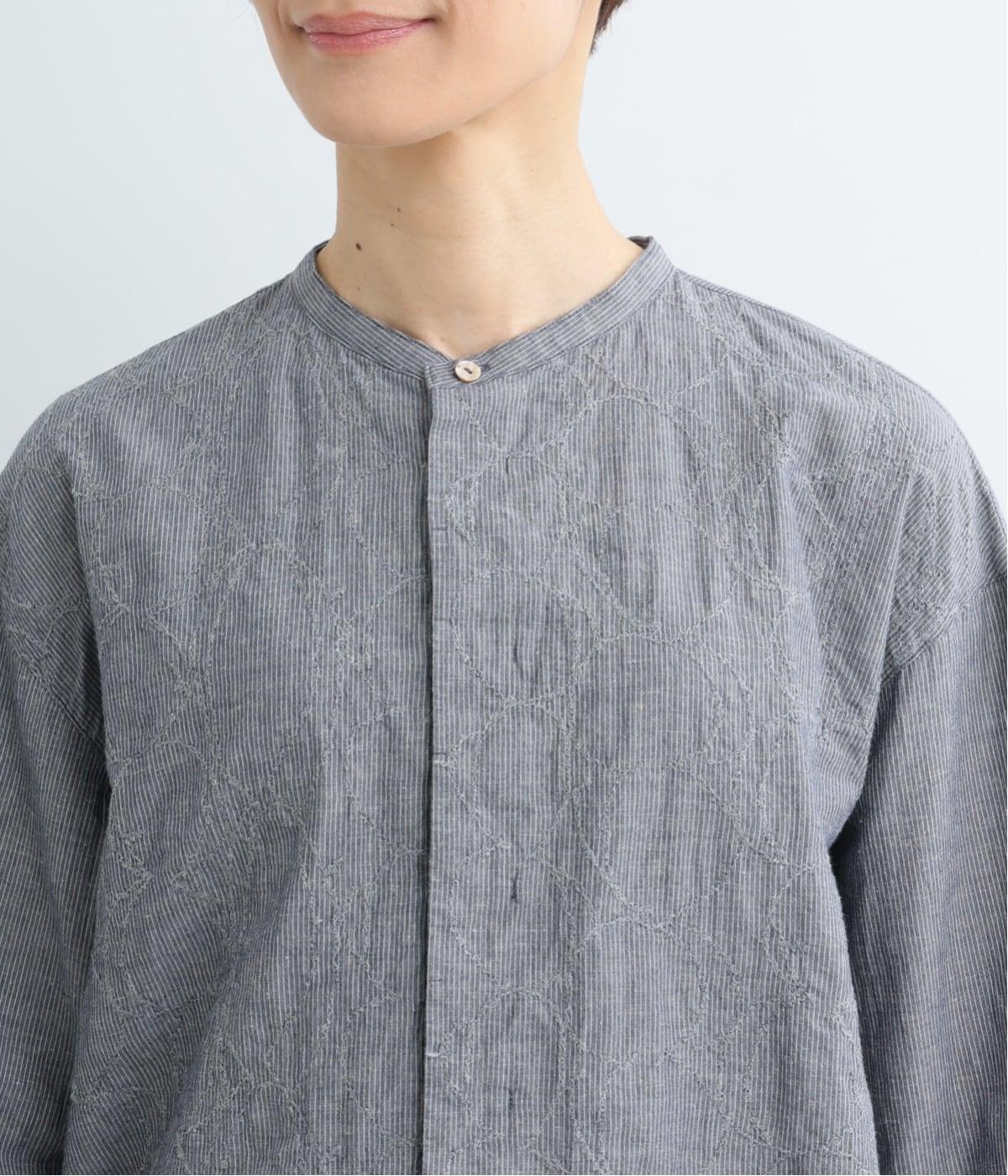 細やかなストライプの縦ラインに、やわらかなラインの刺しゅうを重ねた、表情ゆたかな一枚です。直線と曲線のコントラストが奥行きを生み、さりげない存在感を放ちます。第一ボタンのみを見せた比翼仕立てで、すっきりとした印象に。ほどよくゆとりのあるシルエットで、軽やかに着こなせるのも◎