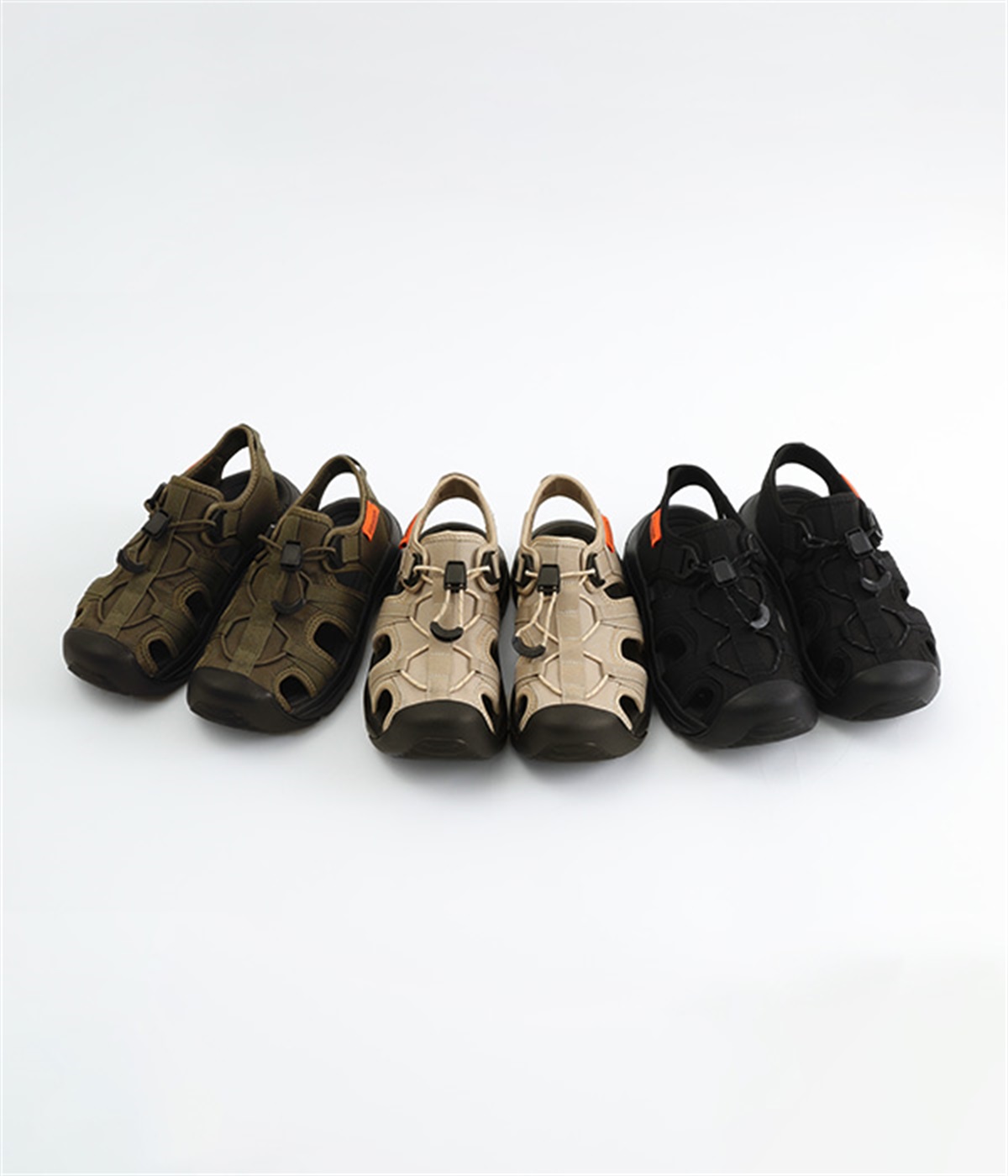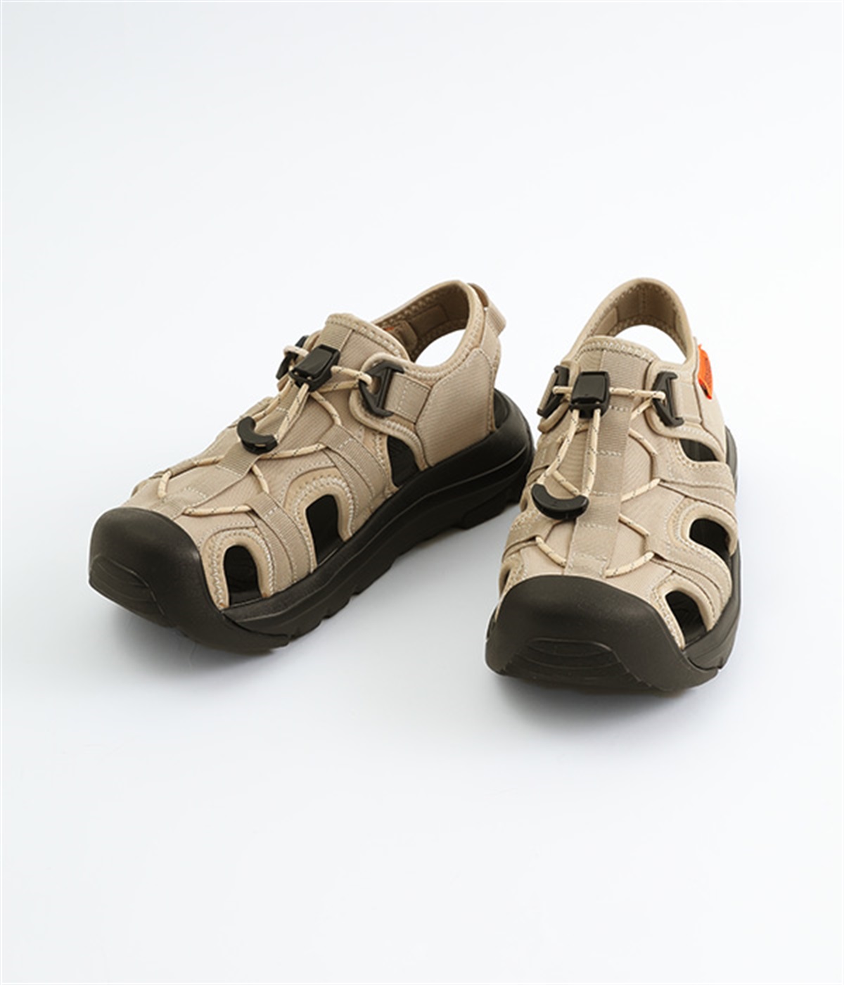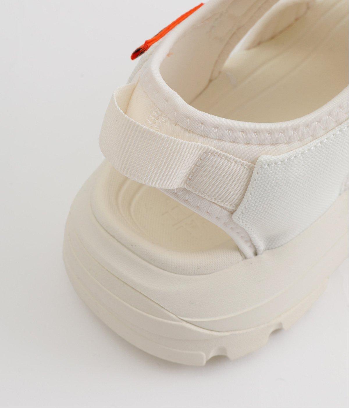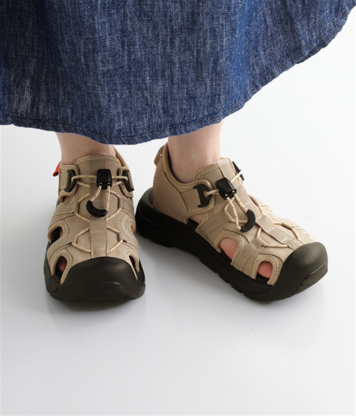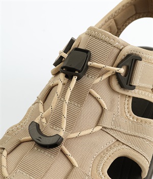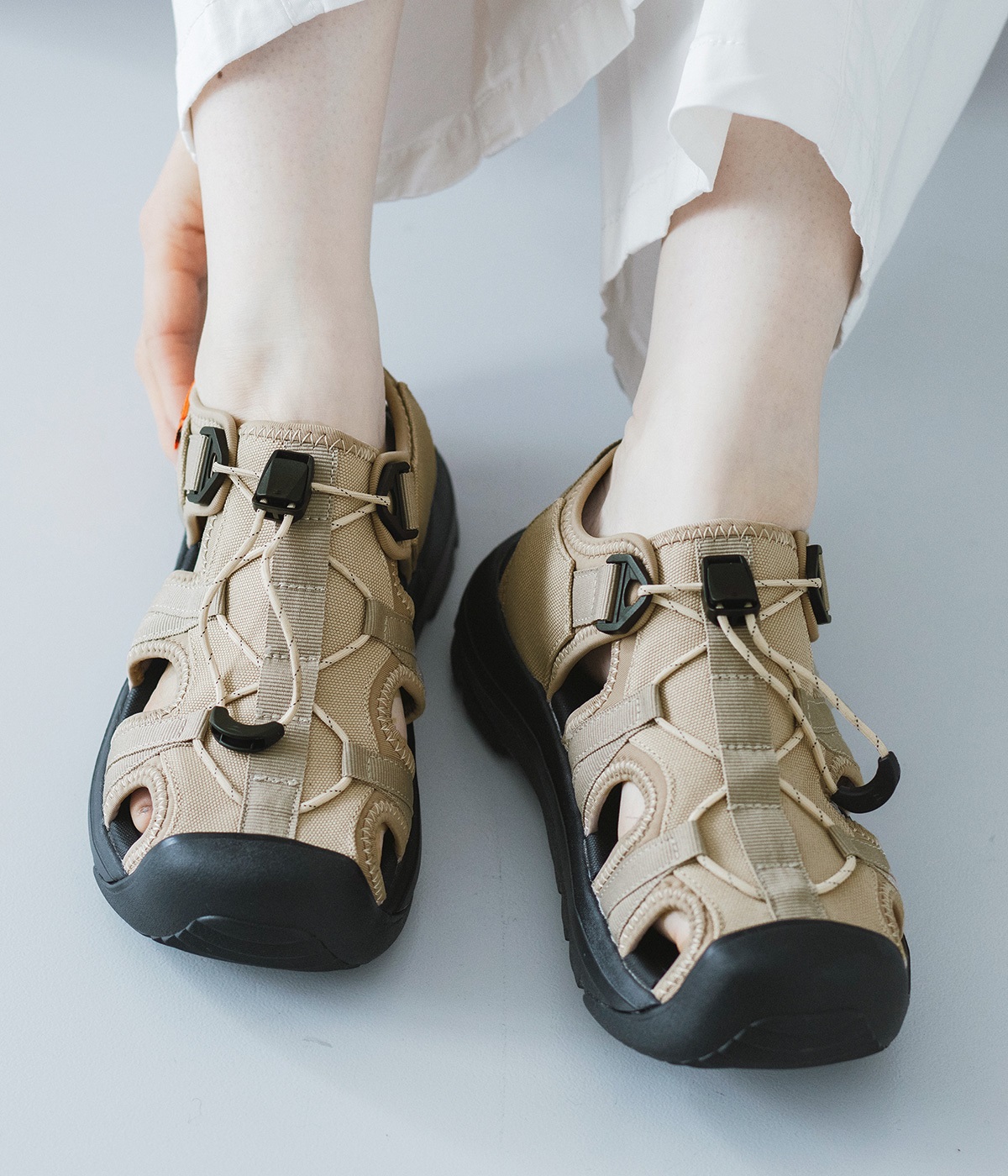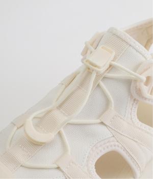 足の甲部分に付いたドローコードで、簡単にフィット感を調整できます。かかと部分のストラップが、足をしっかりとホールドして歩行中のズレを防ぎ、安定感もアップ。ストラップにはリングが付いて、スムーズな着脱をアシストします。
