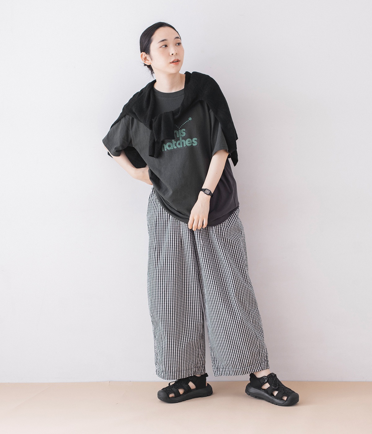 彩り豊かなパンツスタイルに、足元はブラックで引き締めて。アウトドアの雰囲気を残しながらもデイリーになじむ、ほどよいボリュームが魅力的。
