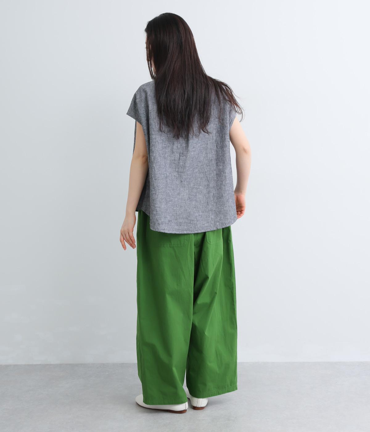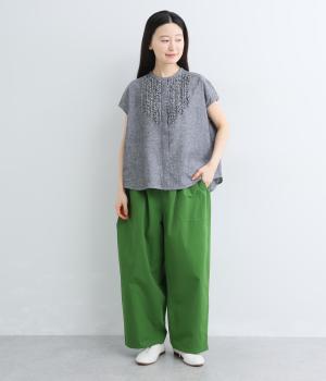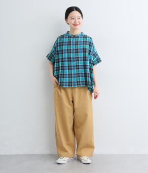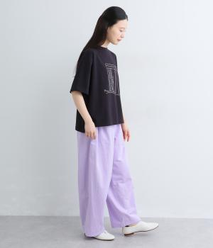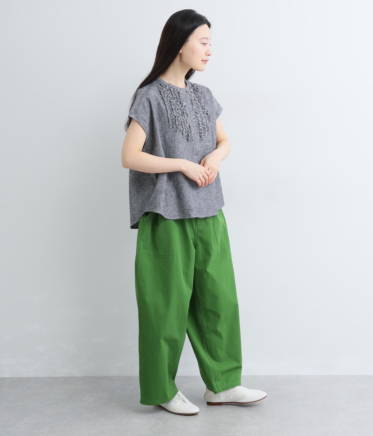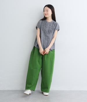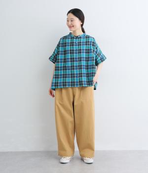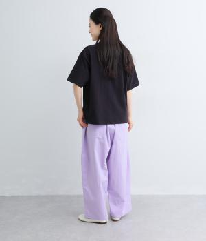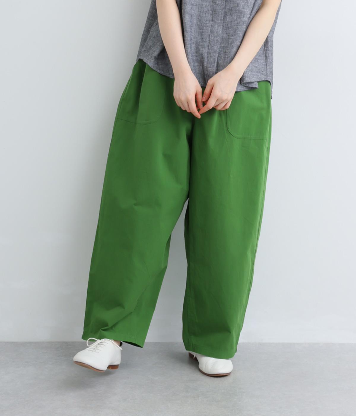 大きなL字型ポケットが目をひくベイカーパンツ風のデザイン。ほどよいワイドストレートが洗練されたシルエットを描きます。背面ゴムと紐仕様で、リラックスした穿き心地ときちんと感のある佇まいを両立させた一本です。