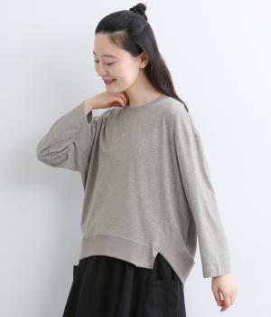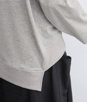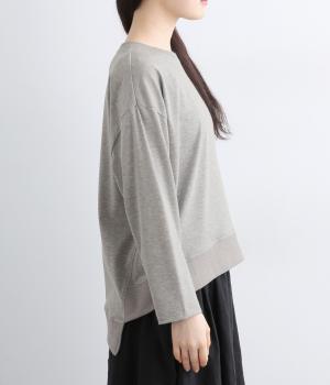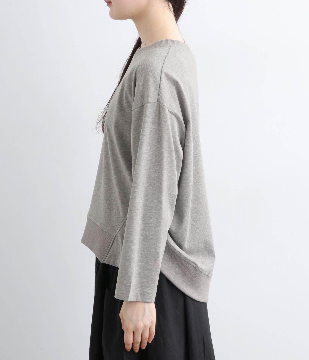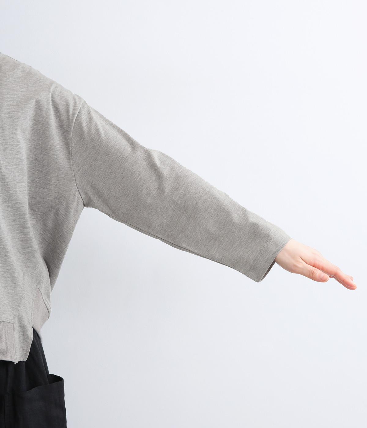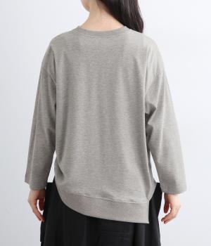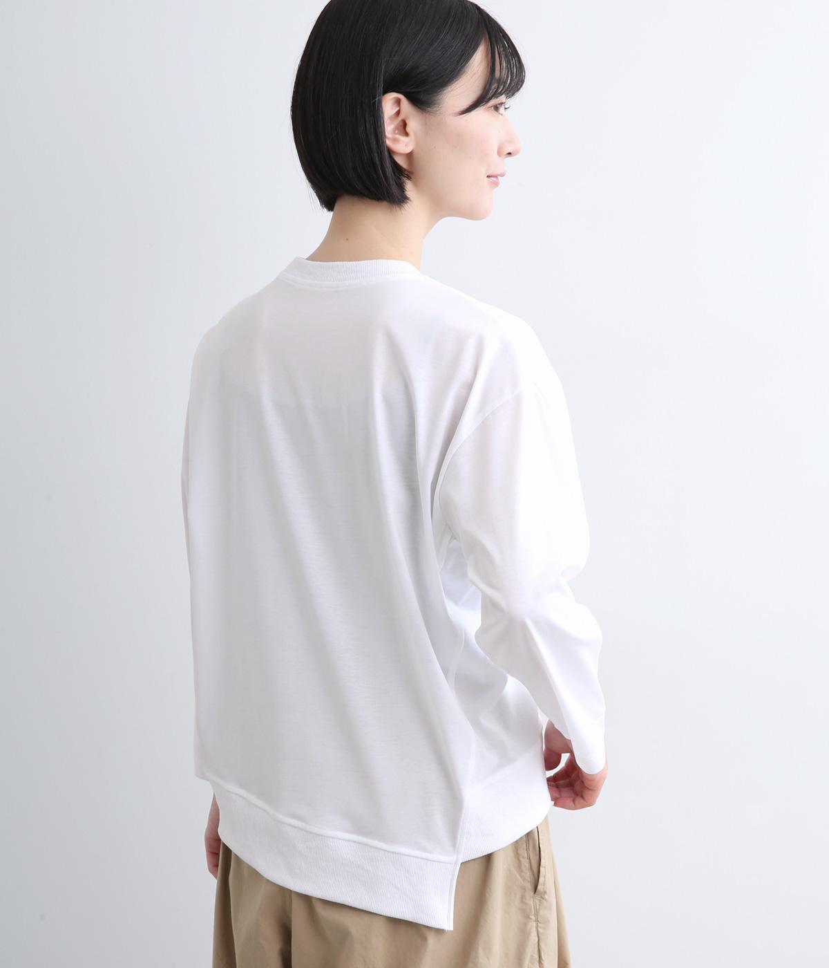 アーム下からななめに切り替えを入れて動きをつけた、アシンメトリーデザインです。うしろはゆるやかなコクーンシルエットで、自然なドレープが生まれるオーバーサイズに。前後差のある裾が抜け感を添え、八分袖で軽やかな印象にまとまります。着るだけでこなれた印象に仕上がる一枚です。
