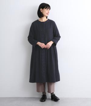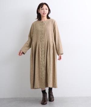 前立てと袖口にレースをあしらったワンピース。比翼仕立ての前立てはスナップボタン仕様で着脱もスムーズです。ウエストからたっぷり入れたタックがきれいな落ち感をつくり、品のある大人っぽいシルエットに仕上げました。
