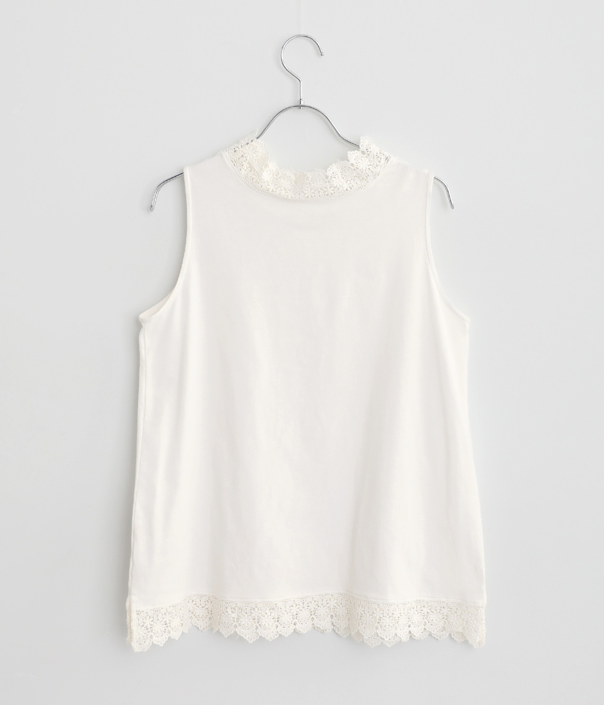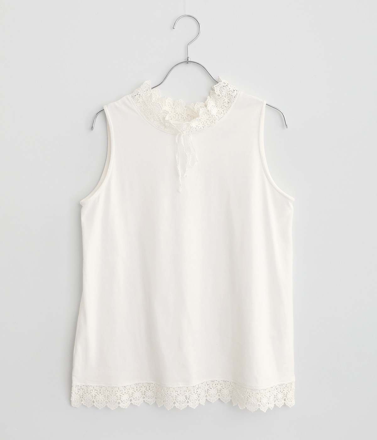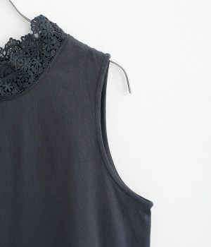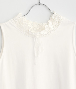 ハイネックレースのリボン襟がかわいらしいタンクトップです。暑い時期には一枚で、肌寒い日には羽織りものやワンピースのインナーとしても活躍します。レイヤードスタイルに最適な、少し長めの着丈です。