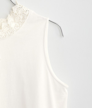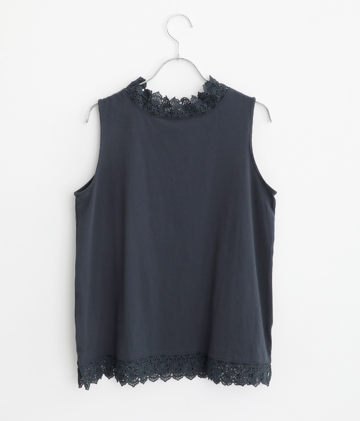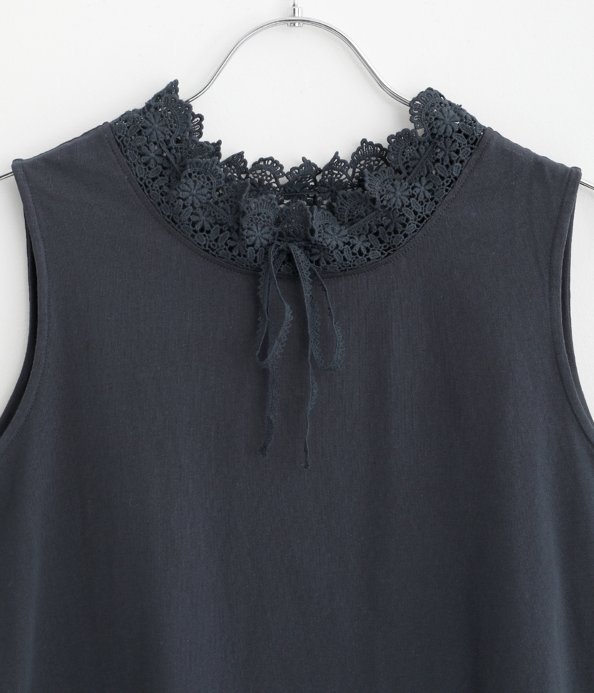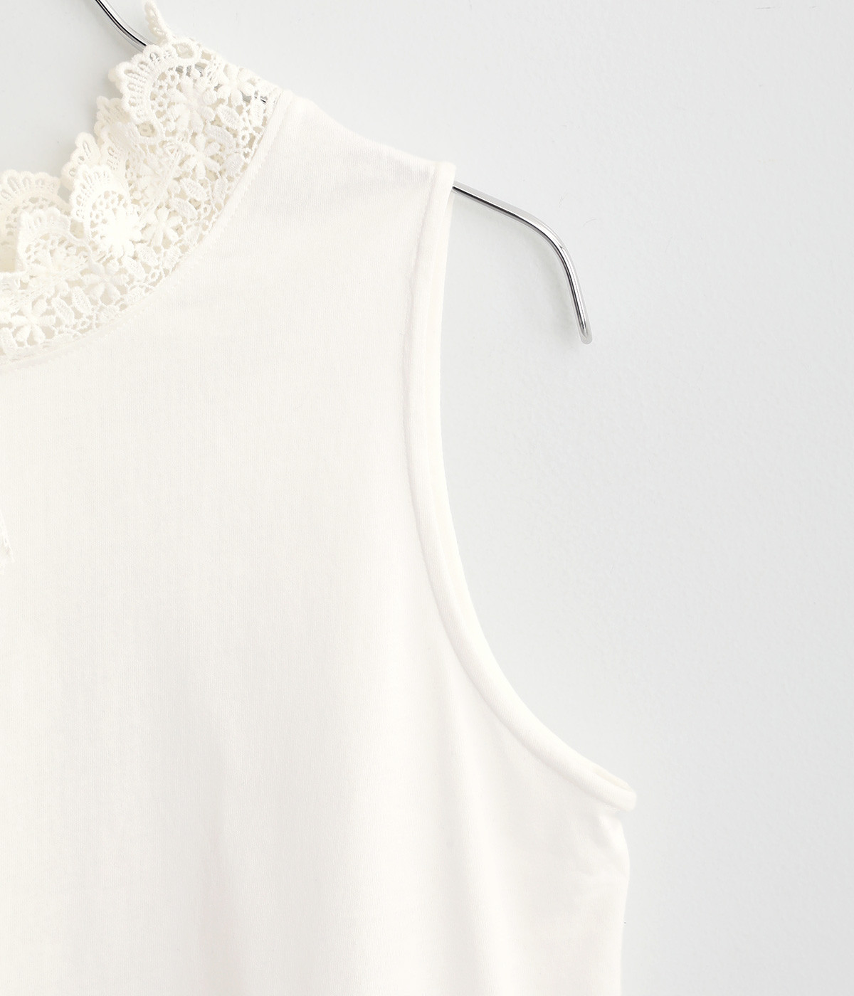 ハイネックレースのリボン襟がかわいらしいタンクトップです。暑い時期には一枚で、肌寒い日には羽織りものやワンピースのインナーとしても活躍します。レイヤードスタイルに最適な、少し長めの着丈です。