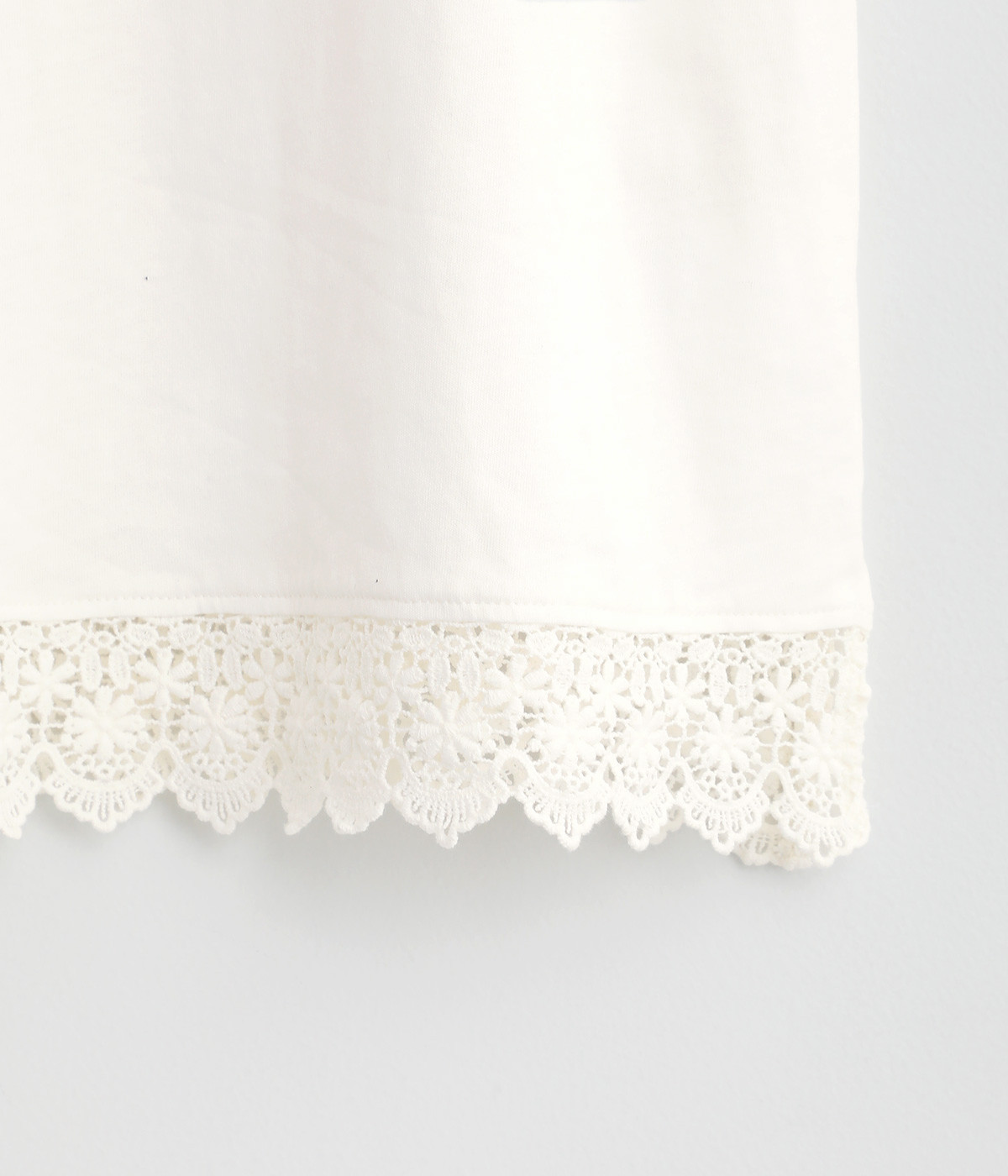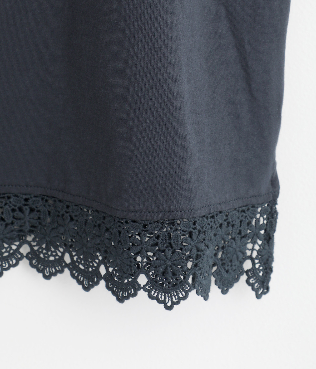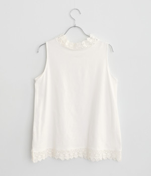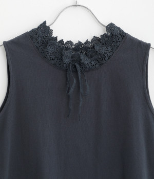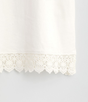 やわらかな肌ざわりをもつコットンの天竺素材。襟元と裾は透け感の出る、エアリーなレースを使用しています。