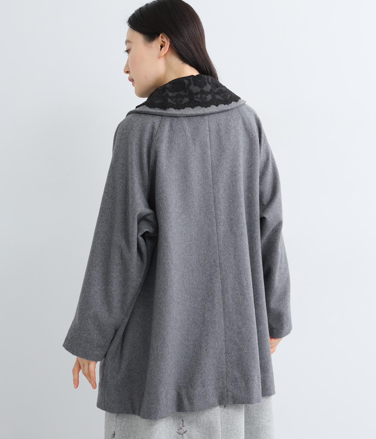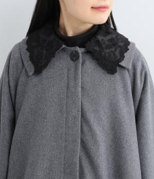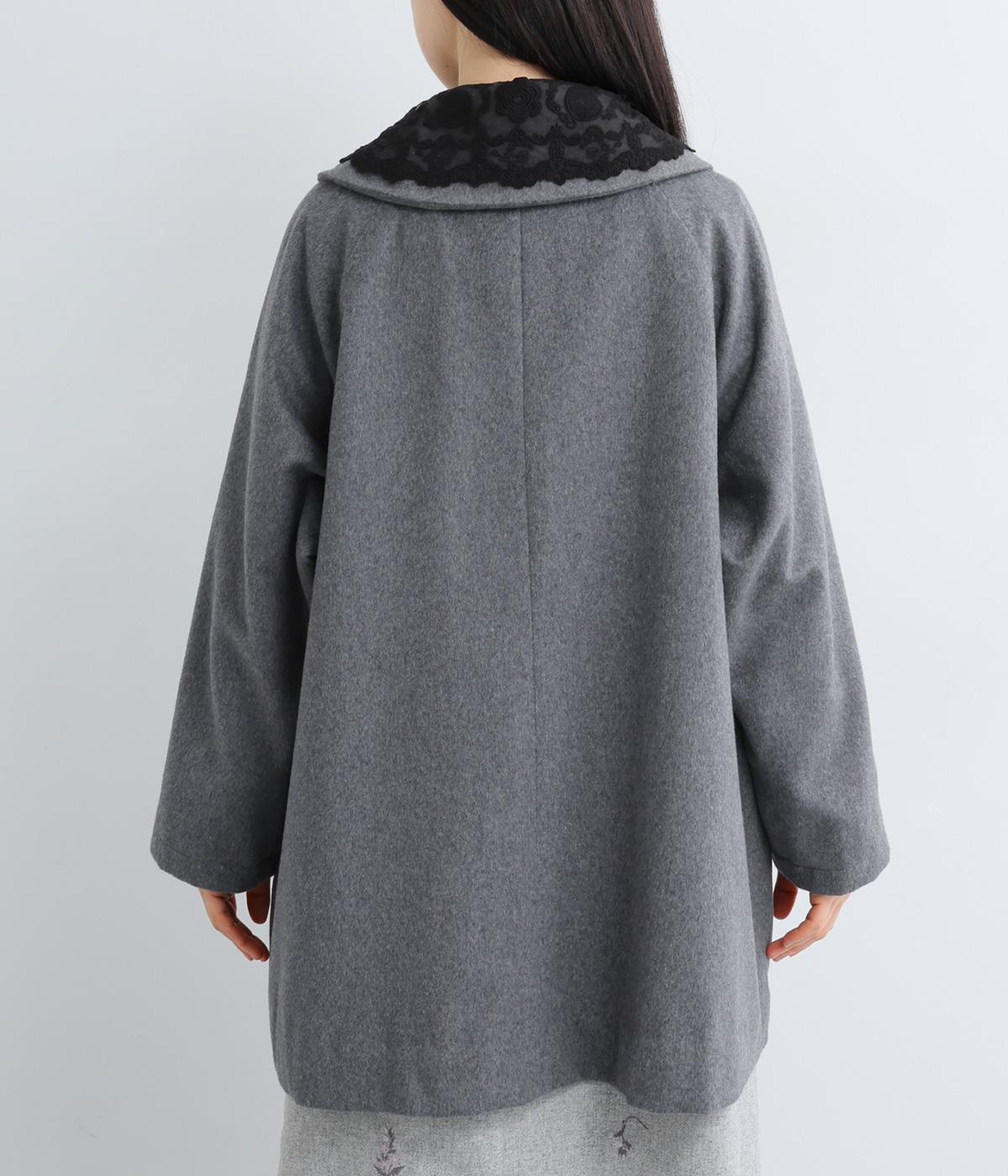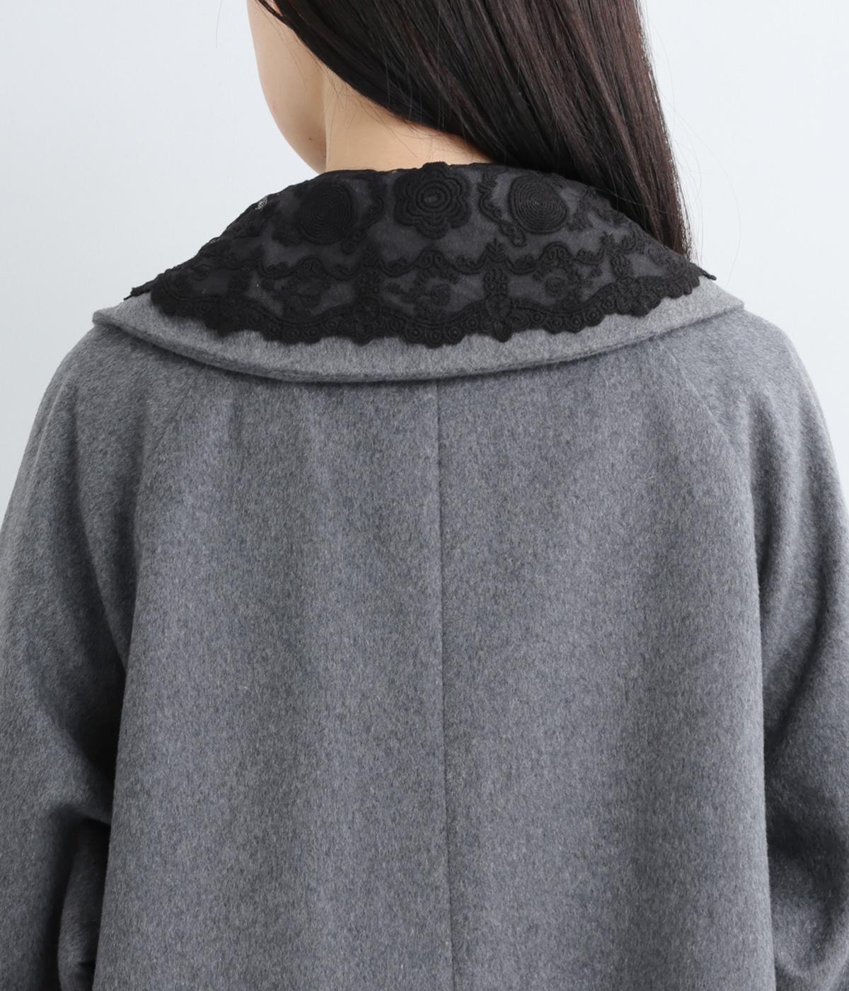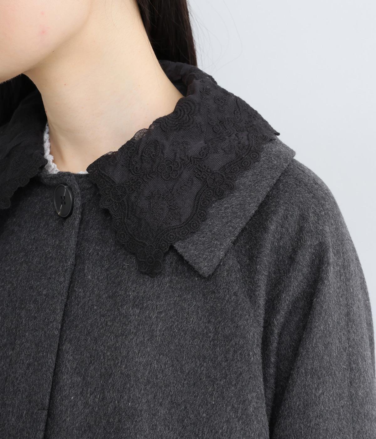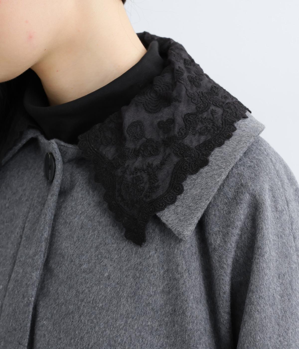 レースを重ねた二重襟が華やかな存在感を放つアウターです。第二ボタンからは比翼仕立てにし、襟を引き立てながらすっきりとしたバランスに仕上げました。体型カバーと防寒を両立させる丈感にもこだわりました。