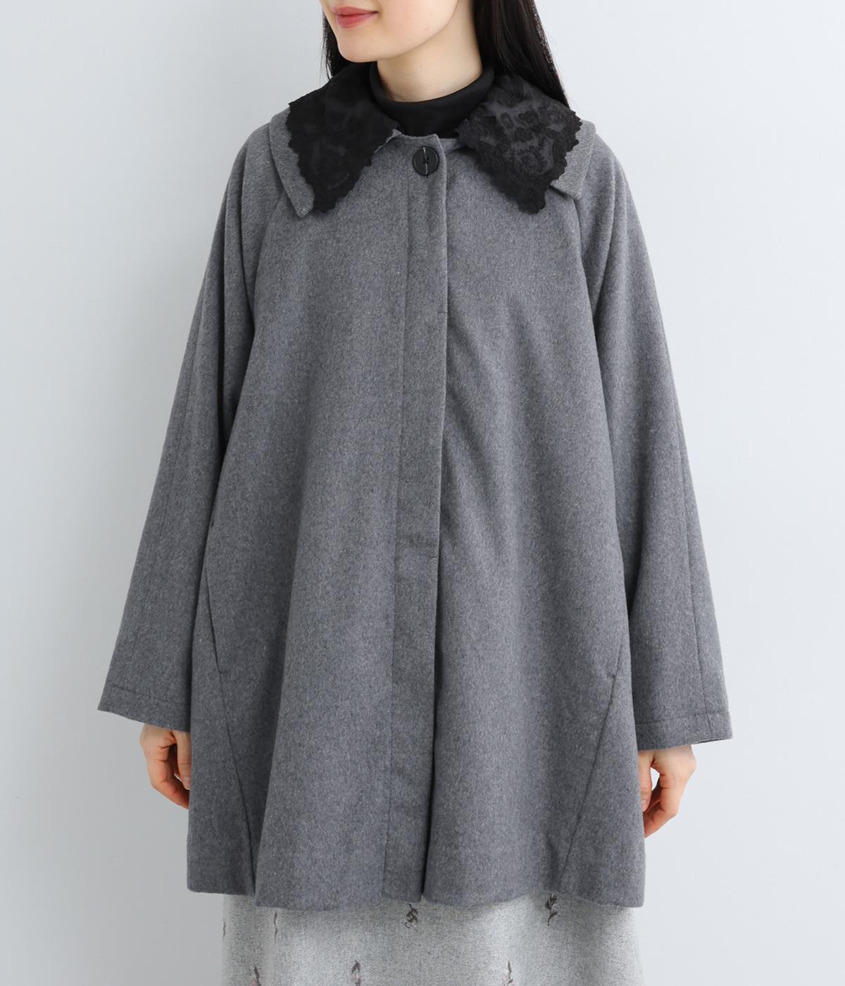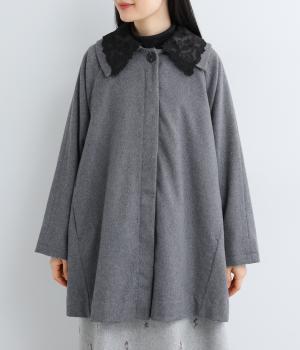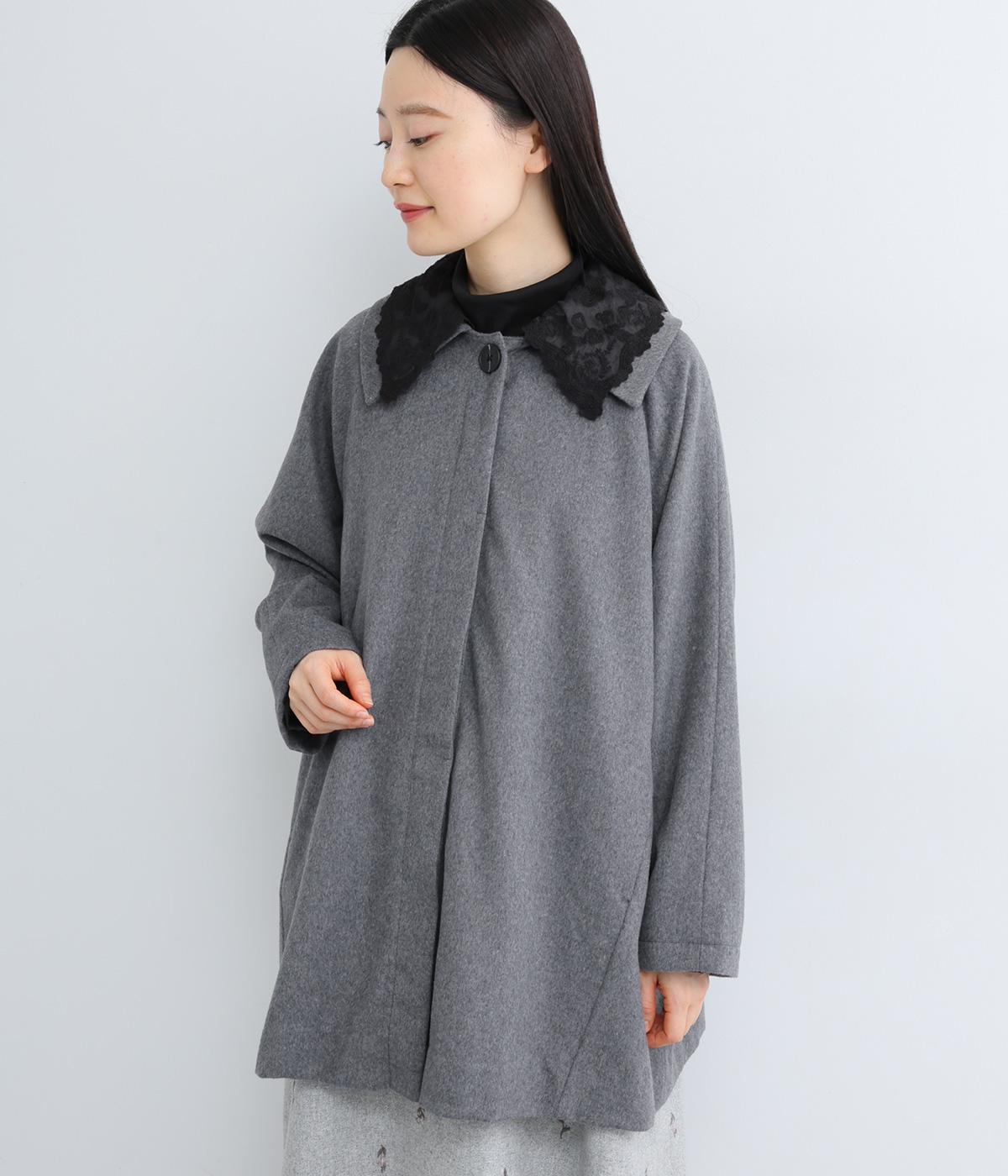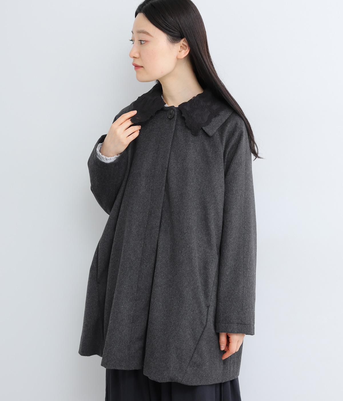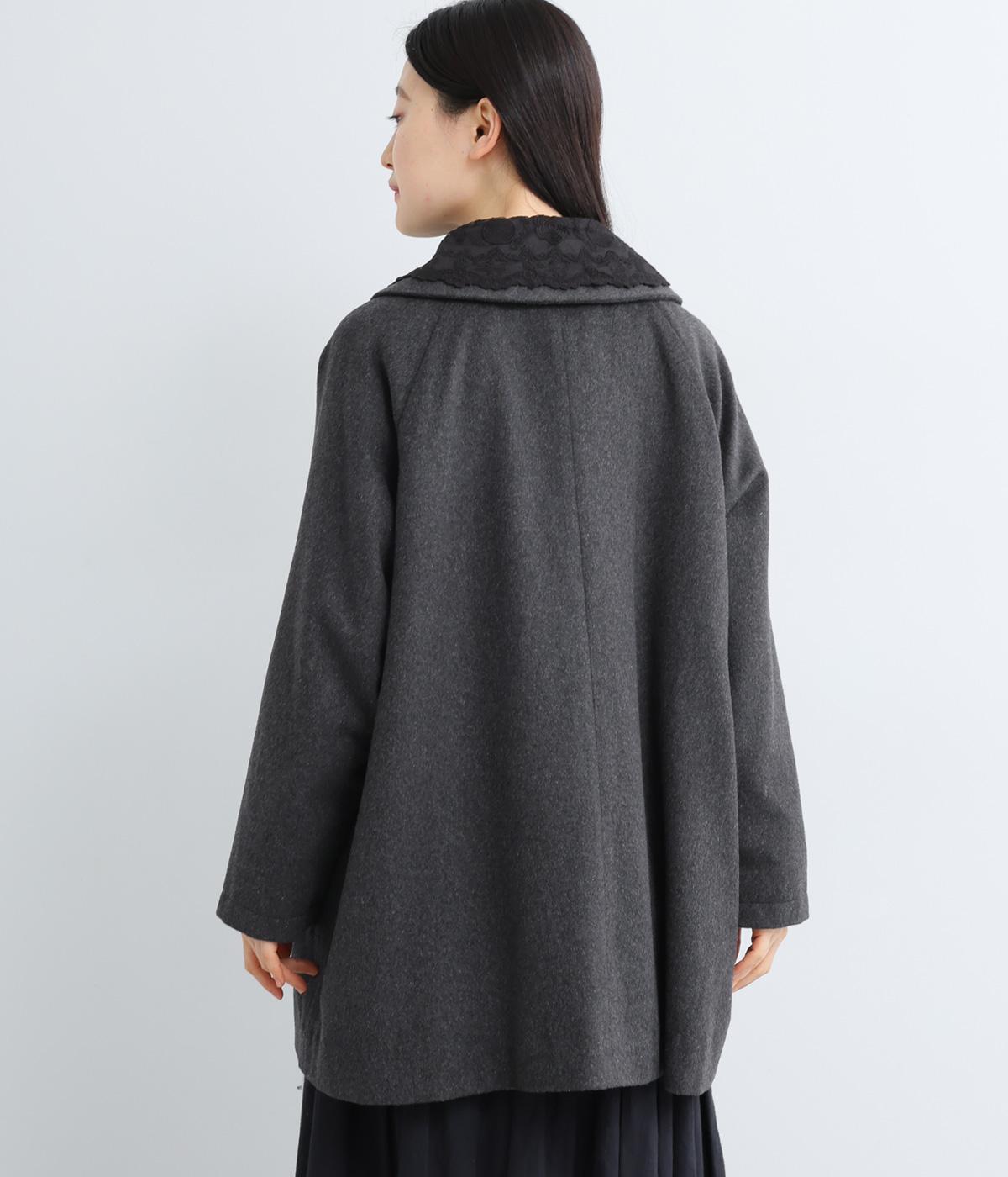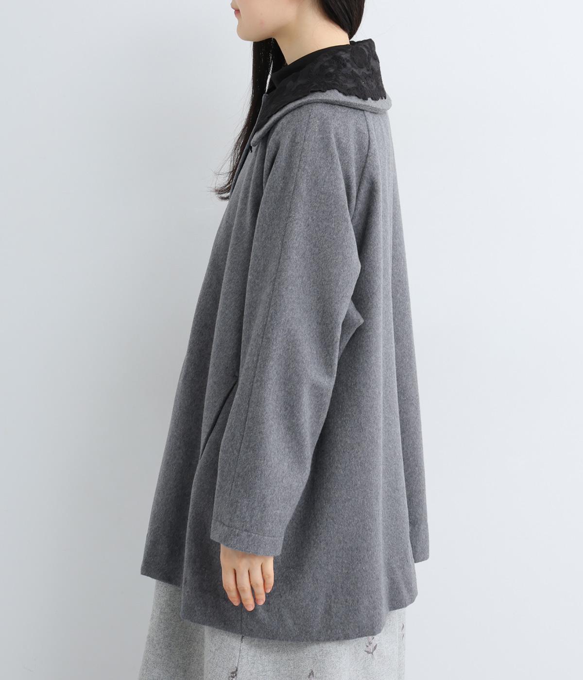レースを重ねた二重襟が華やかな存在感を放つアウターです。第二ボタンからは比翼仕立てにし、襟を引き立てながらすっきりとしたバランスに仕上げました。体型カバーと防寒を両立させる丈感にもこだわりました。