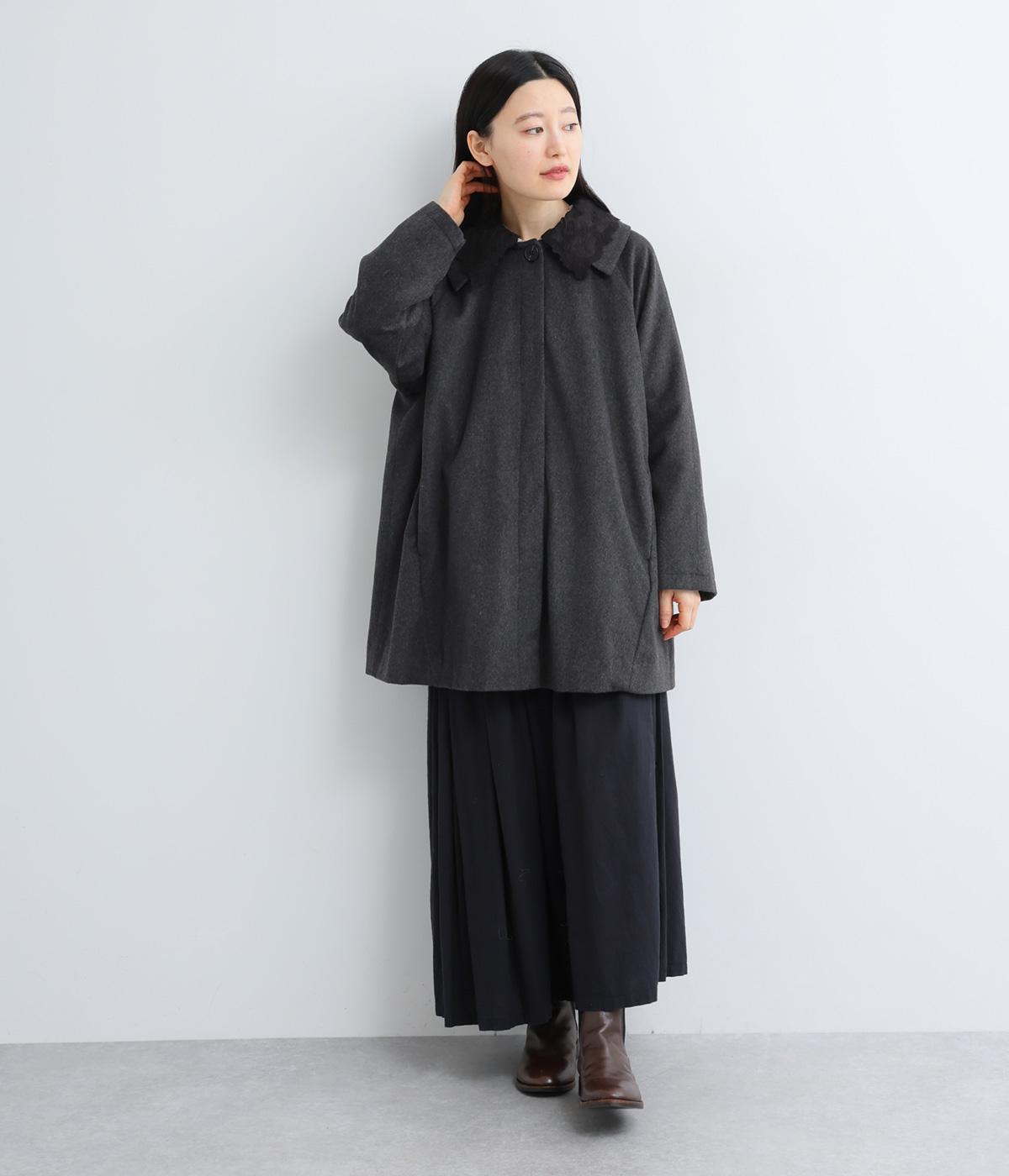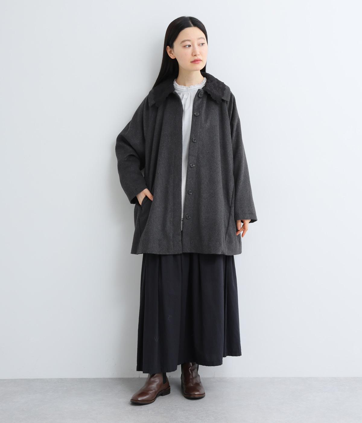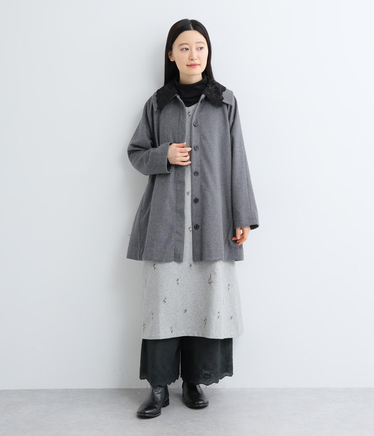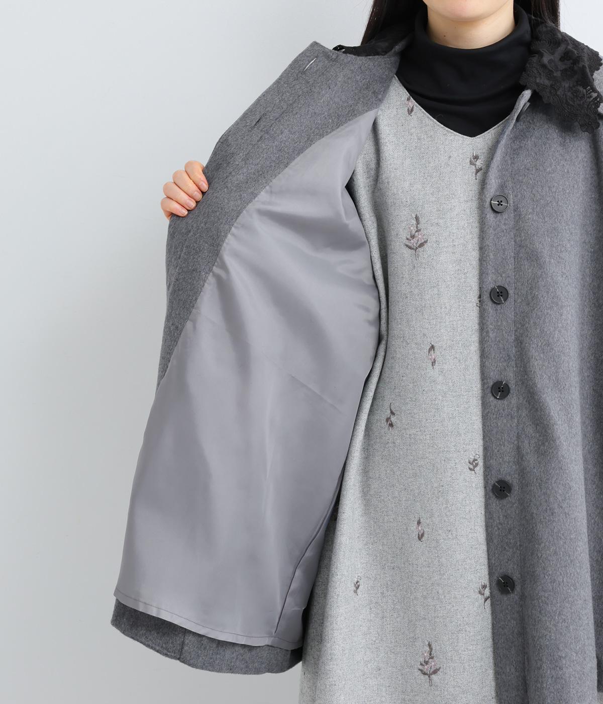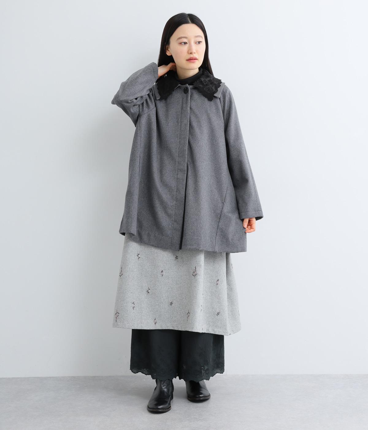 レースを重ねた二重襟が華やかな存在感を放つアウターです。第二ボタンからは比翼仕立てにし、襟を引き立てながらすっきりとしたバランスに仕上げました。体型カバーと防寒を両立させる丈感にもこだわりました。