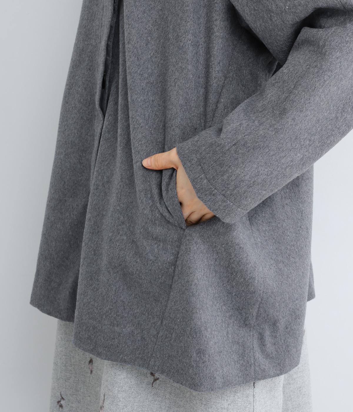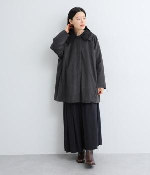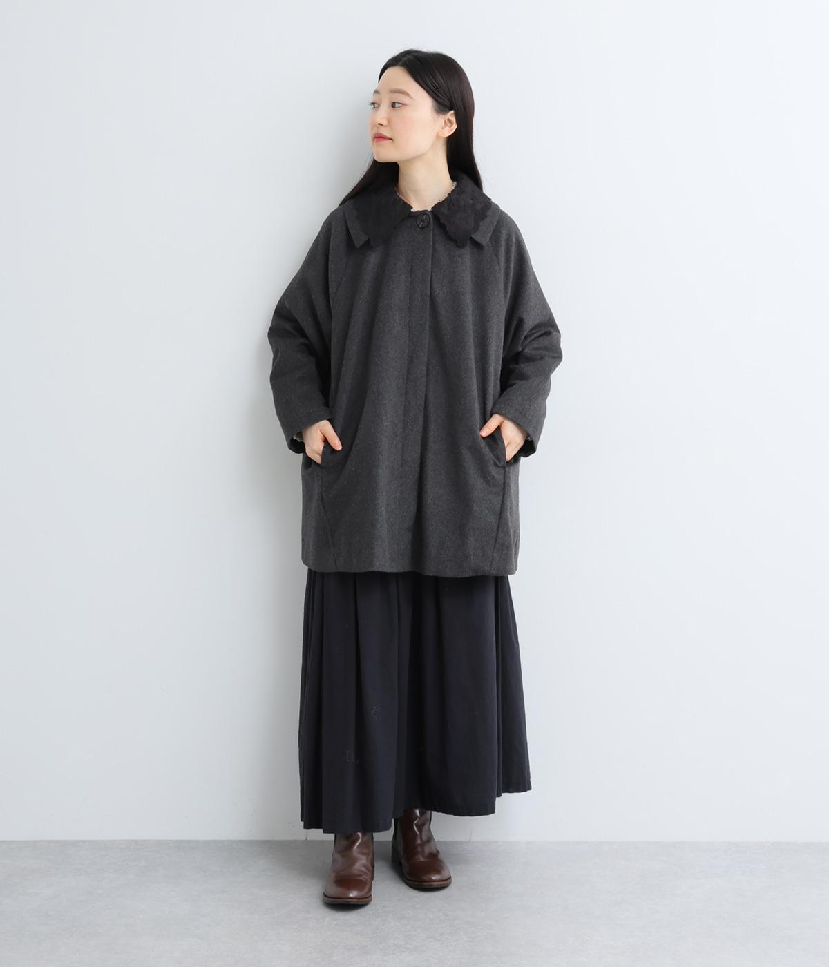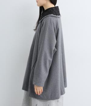 なめらかな肌ざわりで、動きにあわせてほのかな光沢を放つシャギー生地。765gと軽やかに仕立て、襟にはあたりのやわらかなレースを重ねました。裏地付きで着やすさと保温性も確保しました。