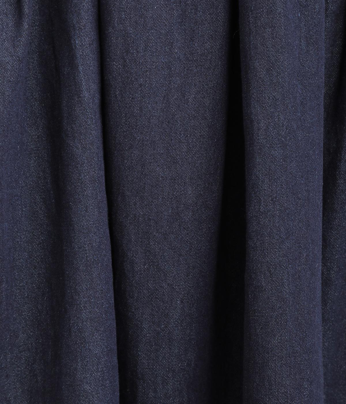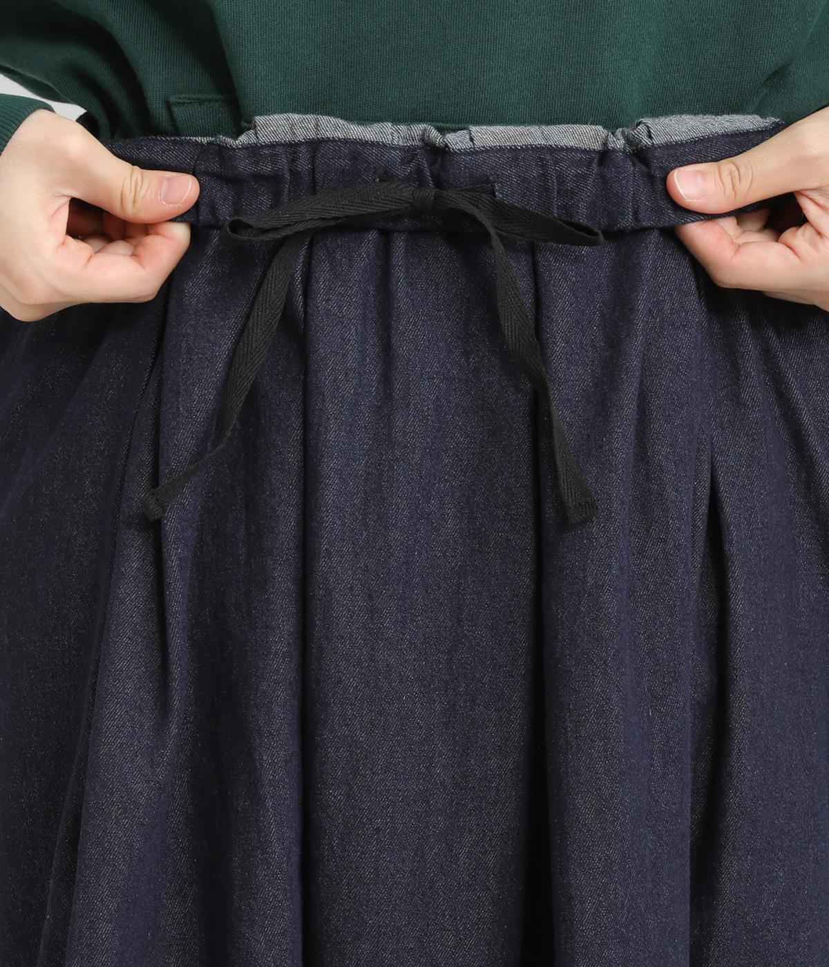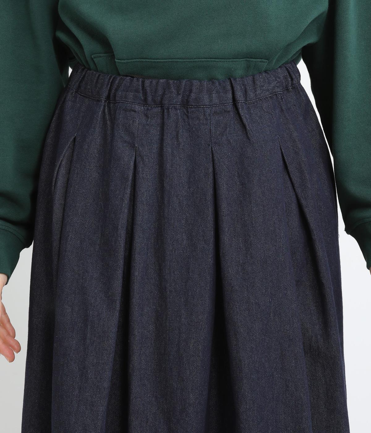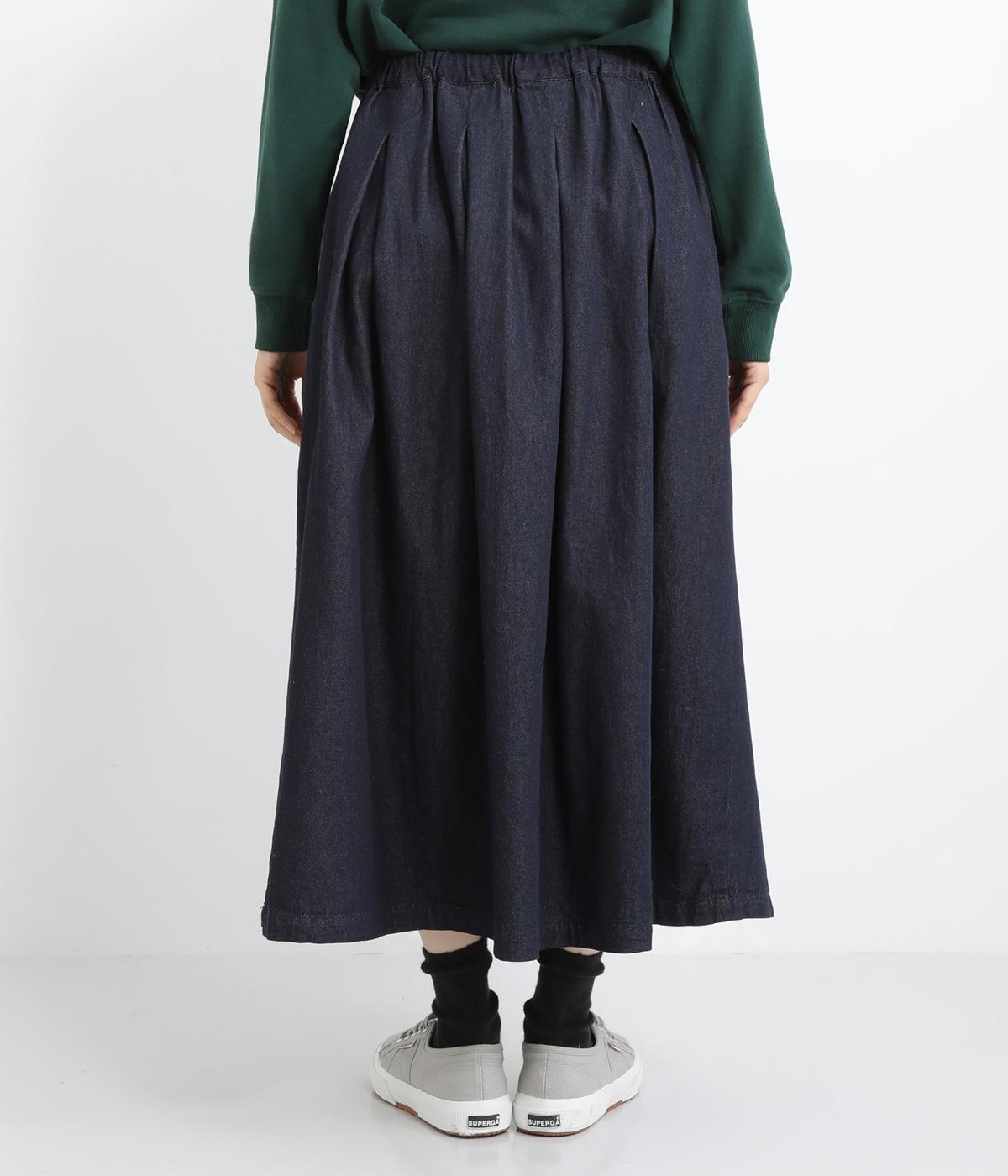 ほどよいボリューム感がかわいらしいコットンデニムのスカートです。腰回りのギャザーとタック仕様でころんとした女性らしいデザインが魅力。バックサイドの繊細なギャザーで立体感を出し、サイドからの美しいシルエットを演出しています。ウエストラインは総ゴム入りで心地よさも◎。