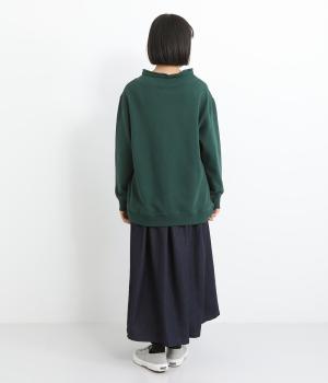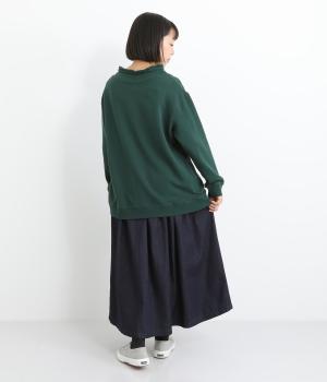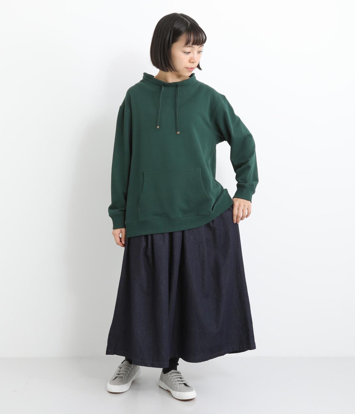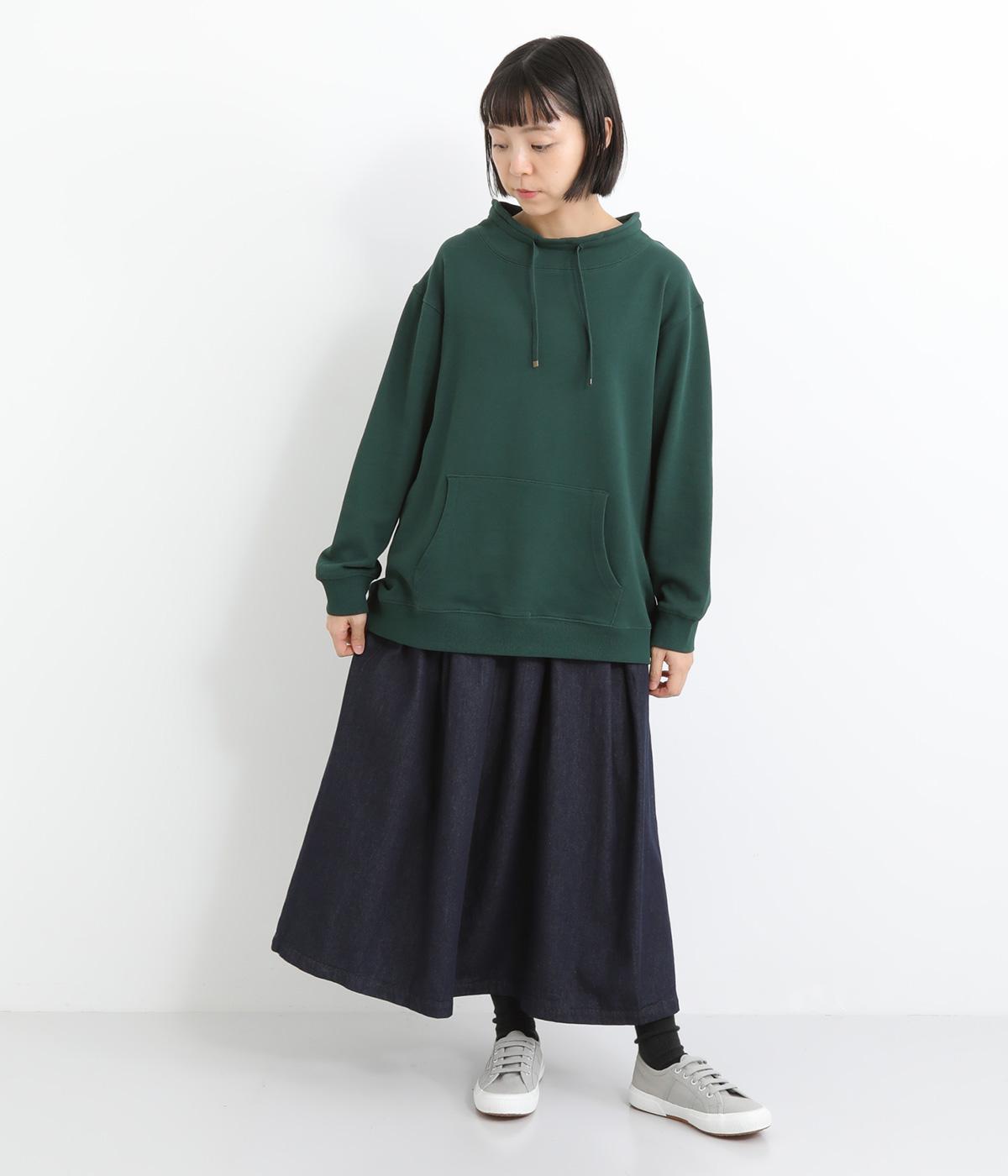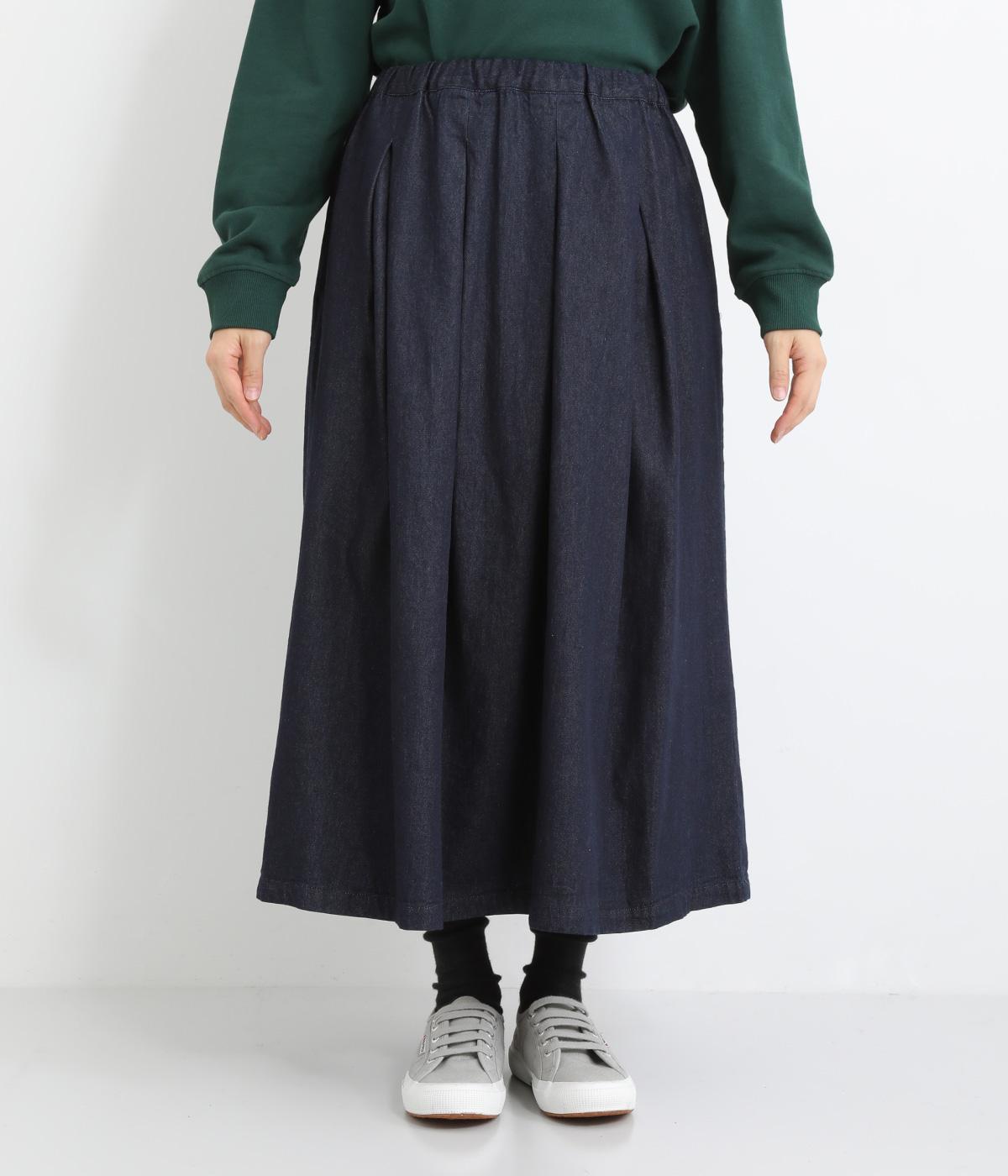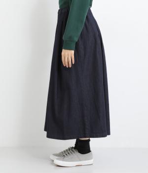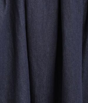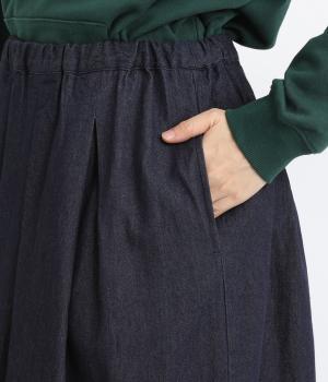 ほどよいボリューム感がかわいらしいコットンデニムのスカートです。腰回りのギャザーとタック仕様でころんとした女性らしいデザインが魅力。バックサイドの繊細なギャザーで立体感を出し、サイドからの美しいシルエットを演出しています。ウエストラインは総ゴム入りで心地よさも◎。