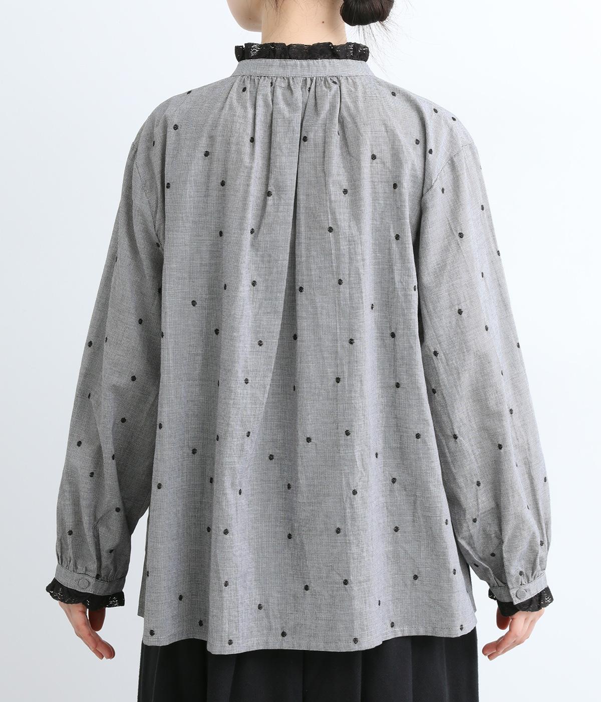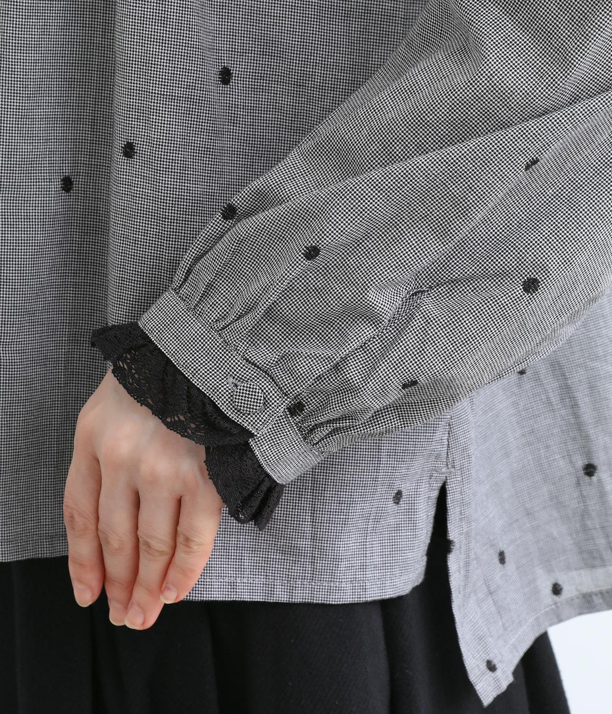 襟ぐりと袖口のブラックレースが大人の甘さを添えたブラウスです。着丈に前後差をつけたスリット入りでボトム合わせもすっきりとみせ、フェミニンすぎないいいバランスに。くるみボタンでディテールもシックにまとめました。