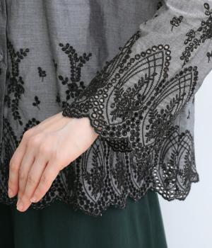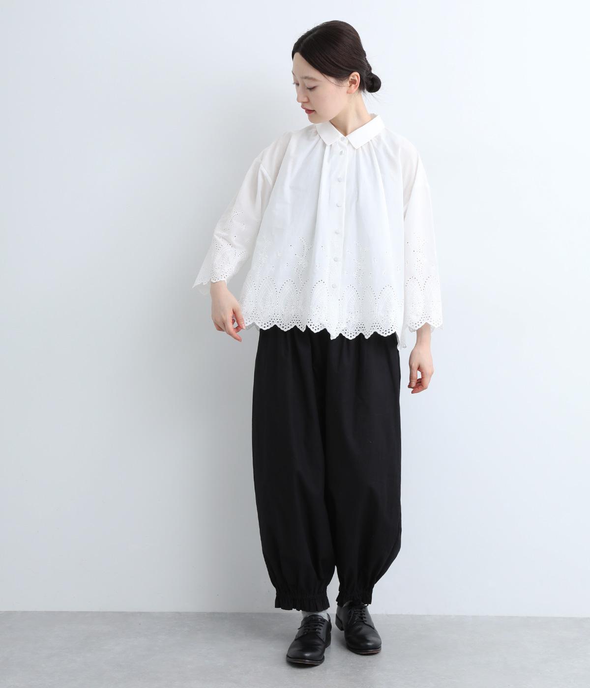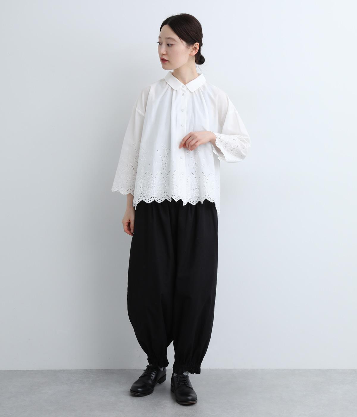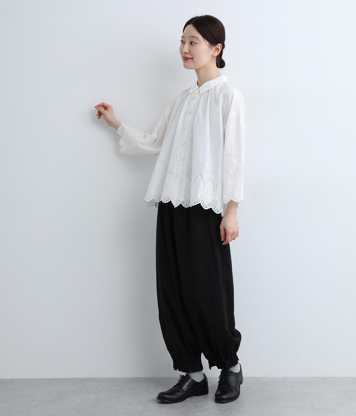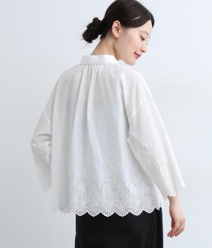 身頃と袖に大胆にほどこしたスカラップ刺しゅうが品よく華やかなブラウス。適度にゆとりを持たせたシルエットやナチュラル素材が、ロマンティックなディテールと好バランス◎。くるみボタンでクラシカルにまとめた前あき仕様です。