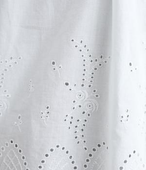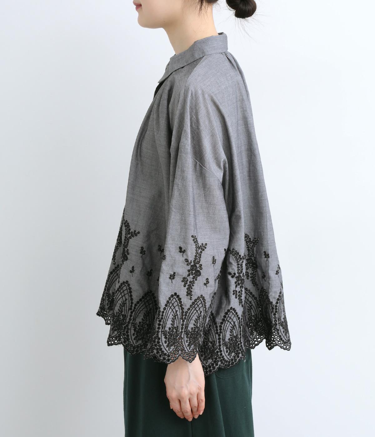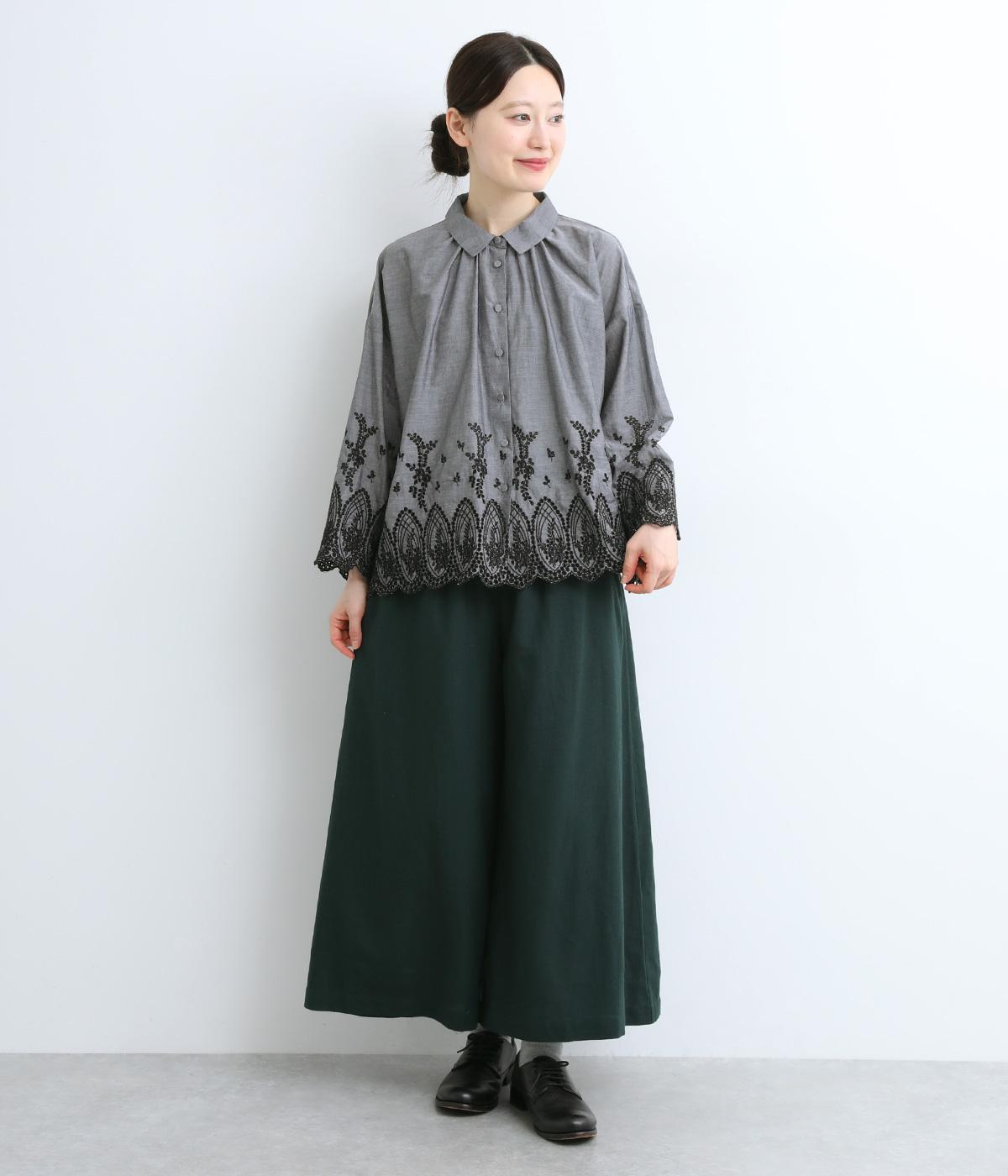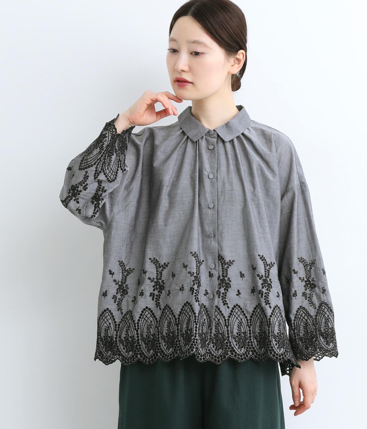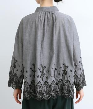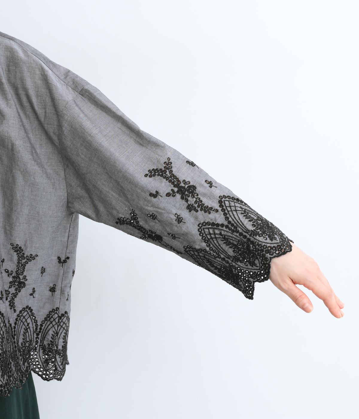 身頃と袖に大胆にほどこしたスカラップ刺しゅうが品よく華やかなブラウス。適度にゆとりを持たせたシルエットやナチュラル素材が、ロマンティックなディテールと好バランス◎。くるみボタンでクラシカルにまとめた前あき仕様です。