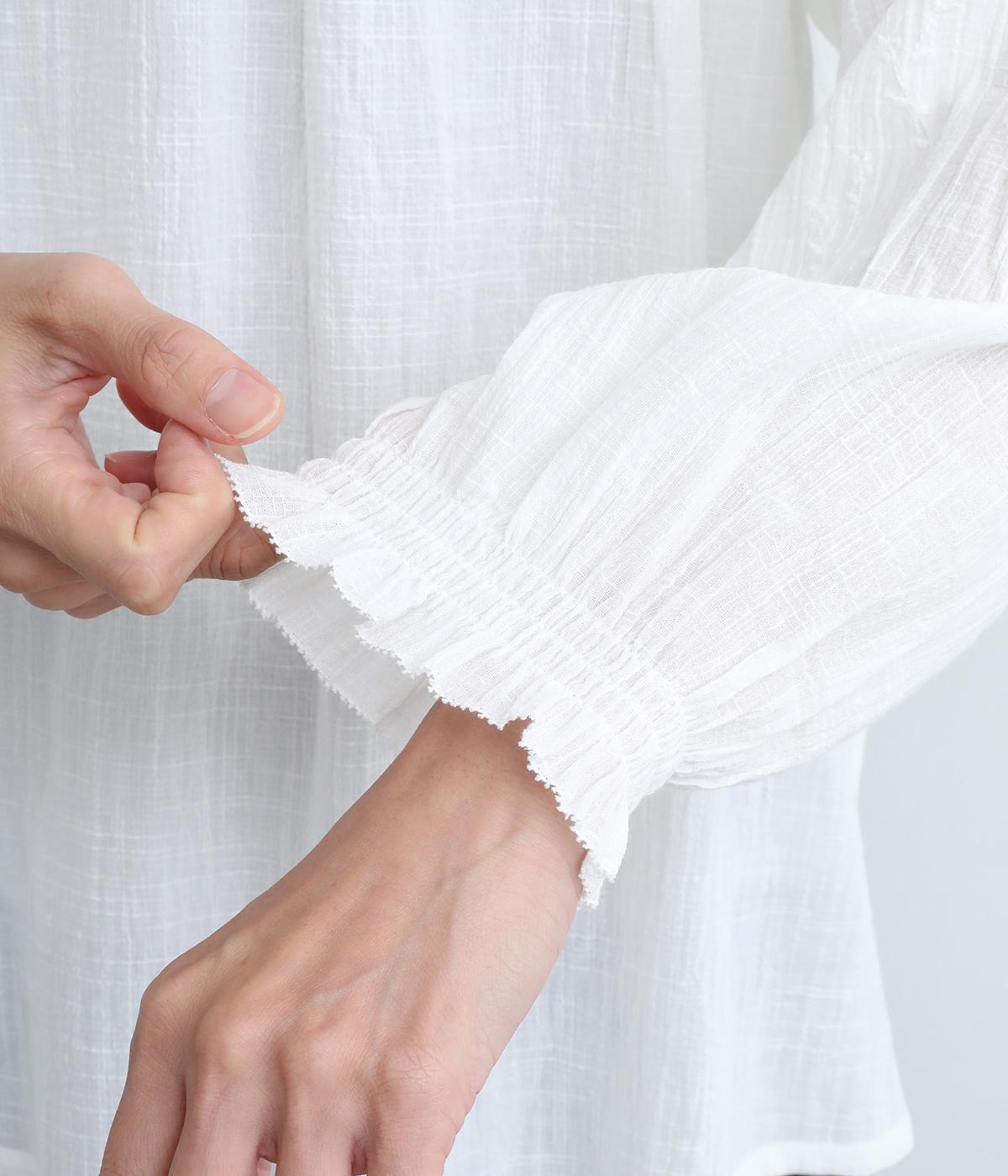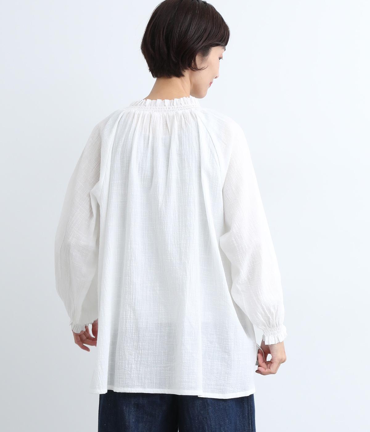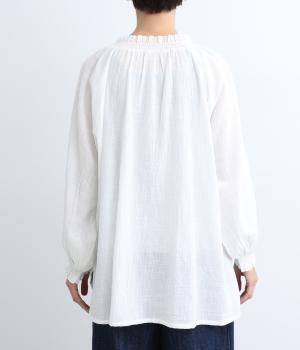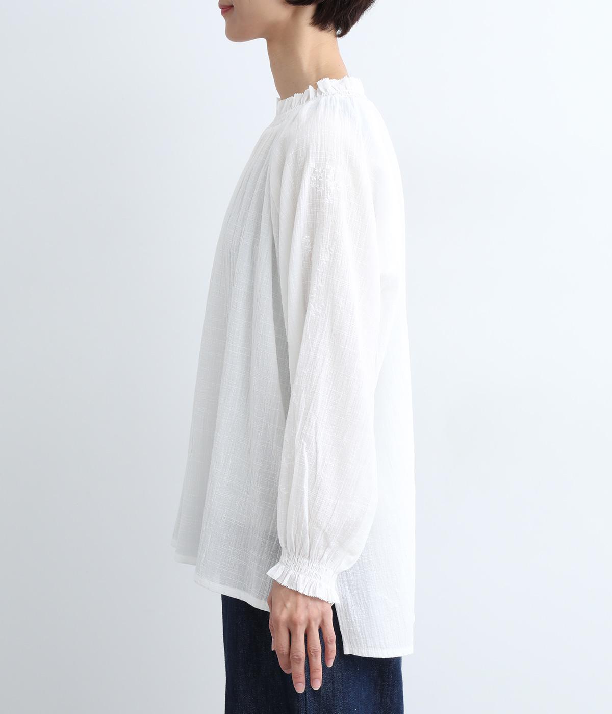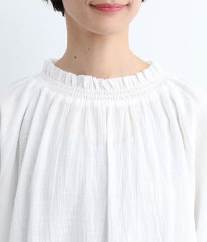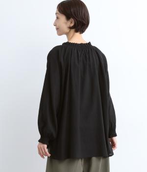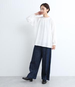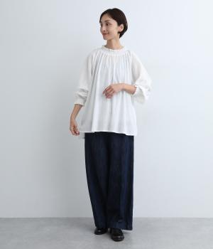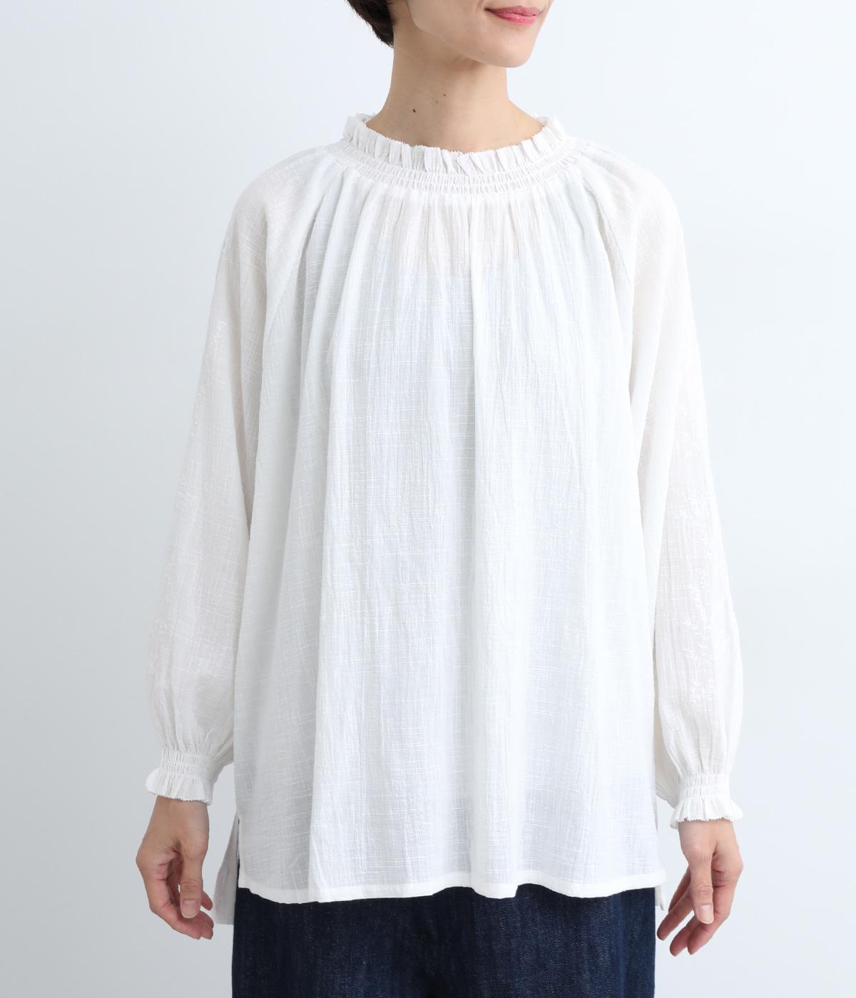 襟ぐりと袖口のフリルディテールでさり気なく甘さを足したプルオーバーです。ゴムシャーリング仕様で頭の通りもスムーズ。袖にさり気なく入った同色系の刺しゅうもこだわりポイント。着丈は前後差をつけたサイドスリット入りですっきりきまります。