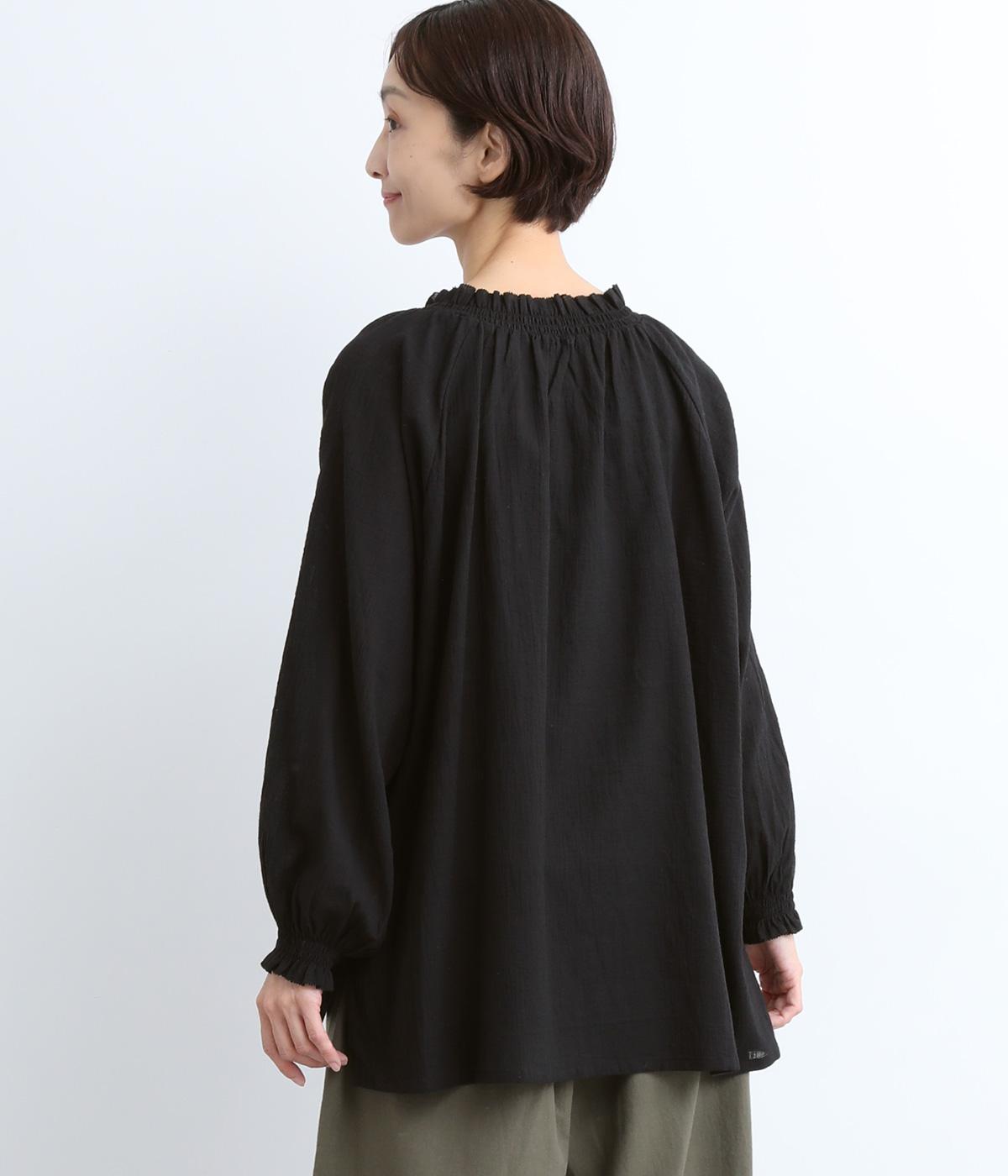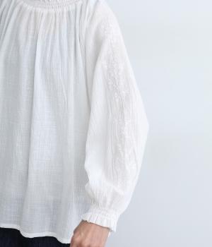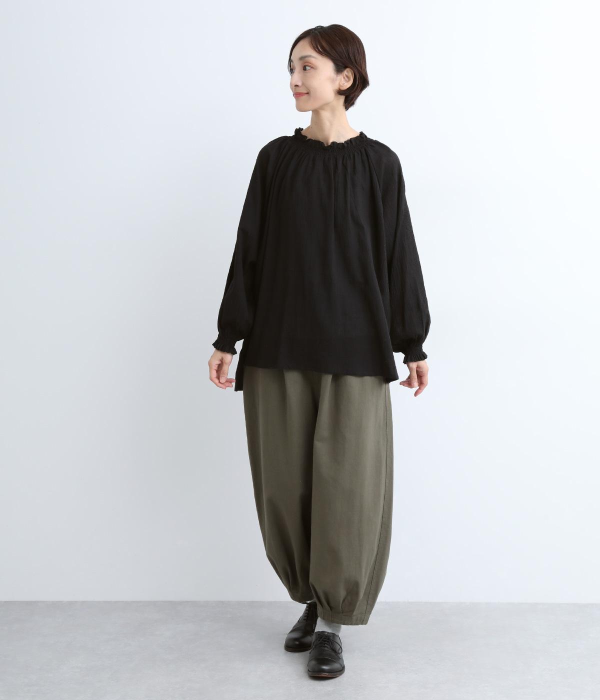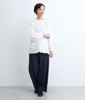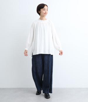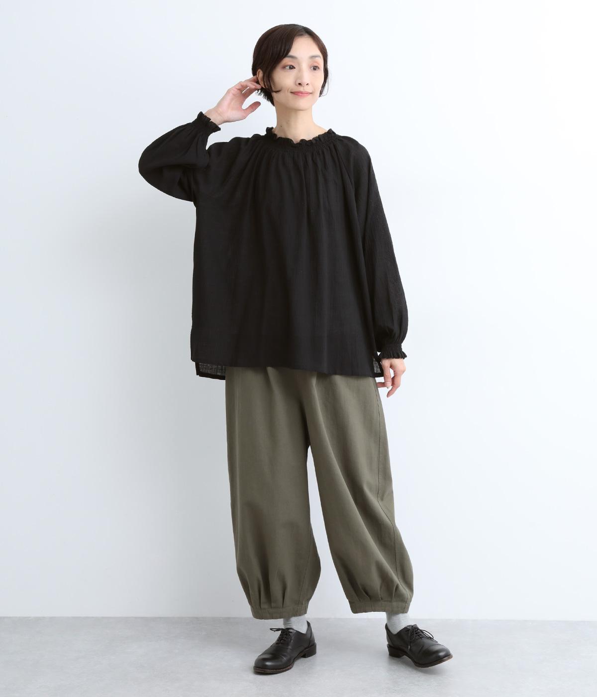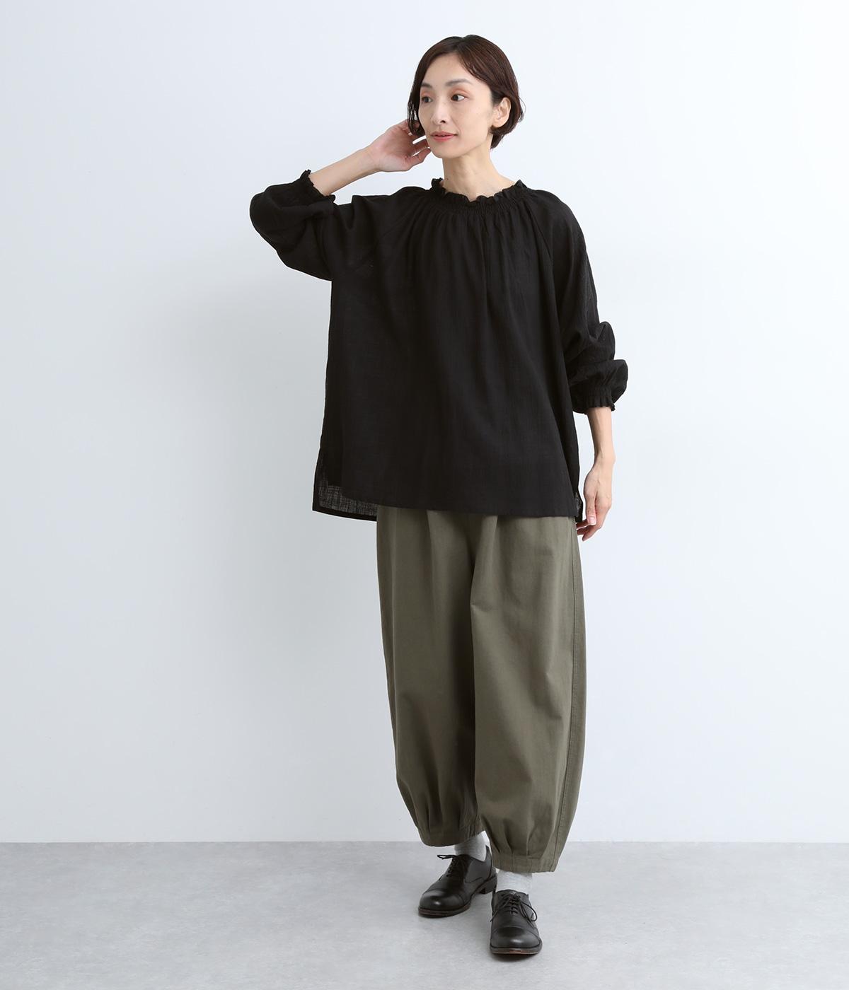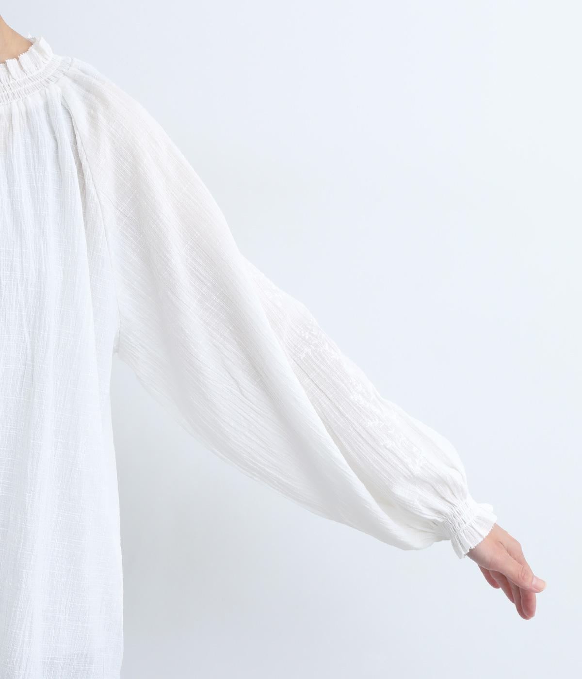 襟ぐりと袖口のフリルディテールでさり気なく甘さを足したプルオーバーです。ゴムシャーリング仕様で頭の通りもスムーズ。袖にさり気なく入った同色系の刺しゅうもこだわりポイント。着丈は前後差をつけたサイドスリット入りですっきりきまります。