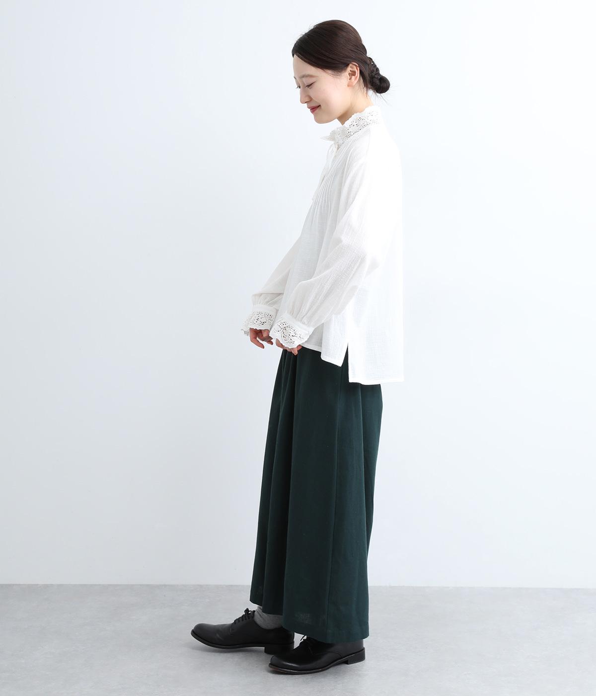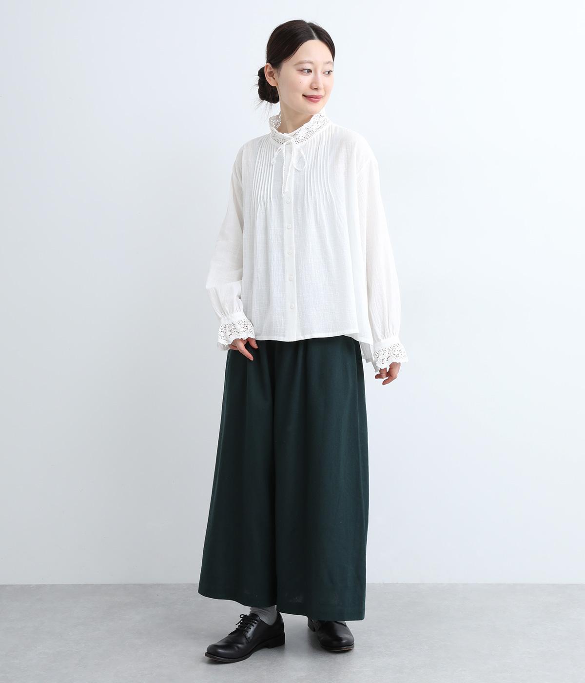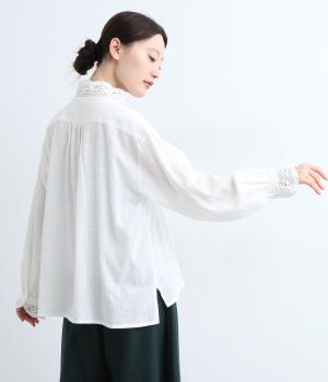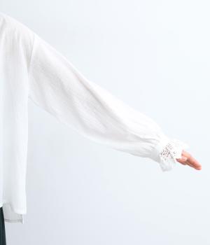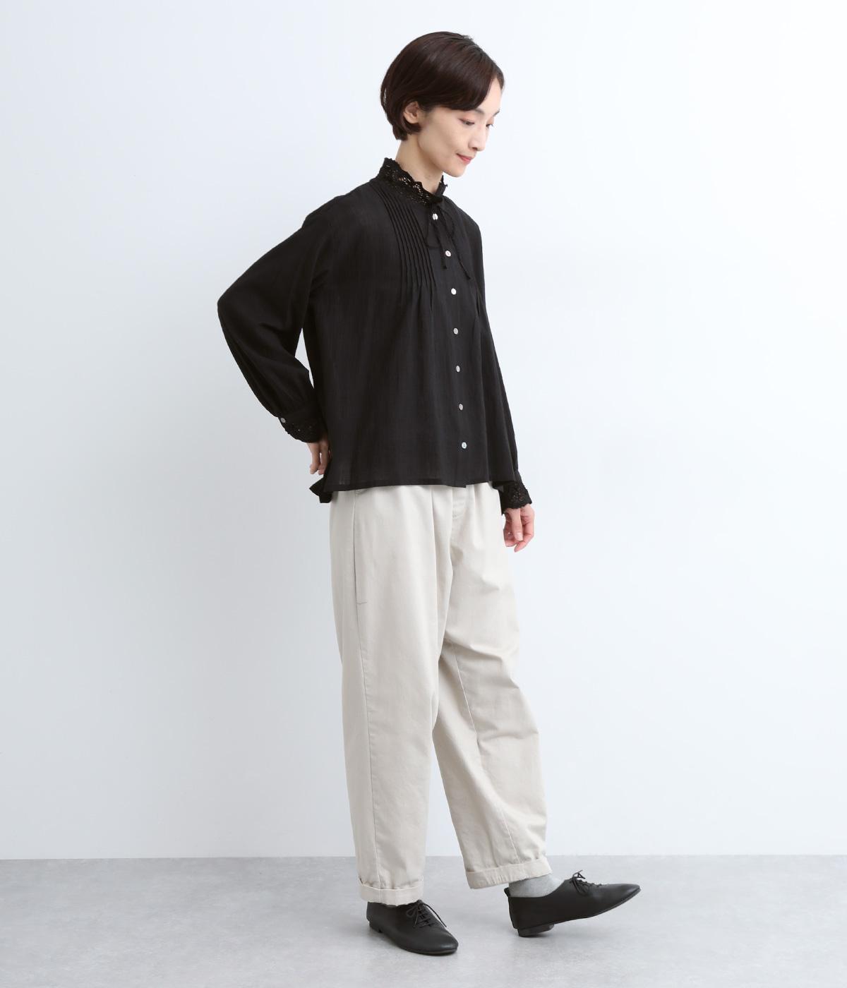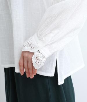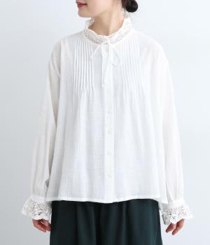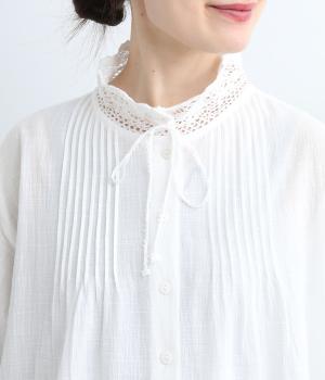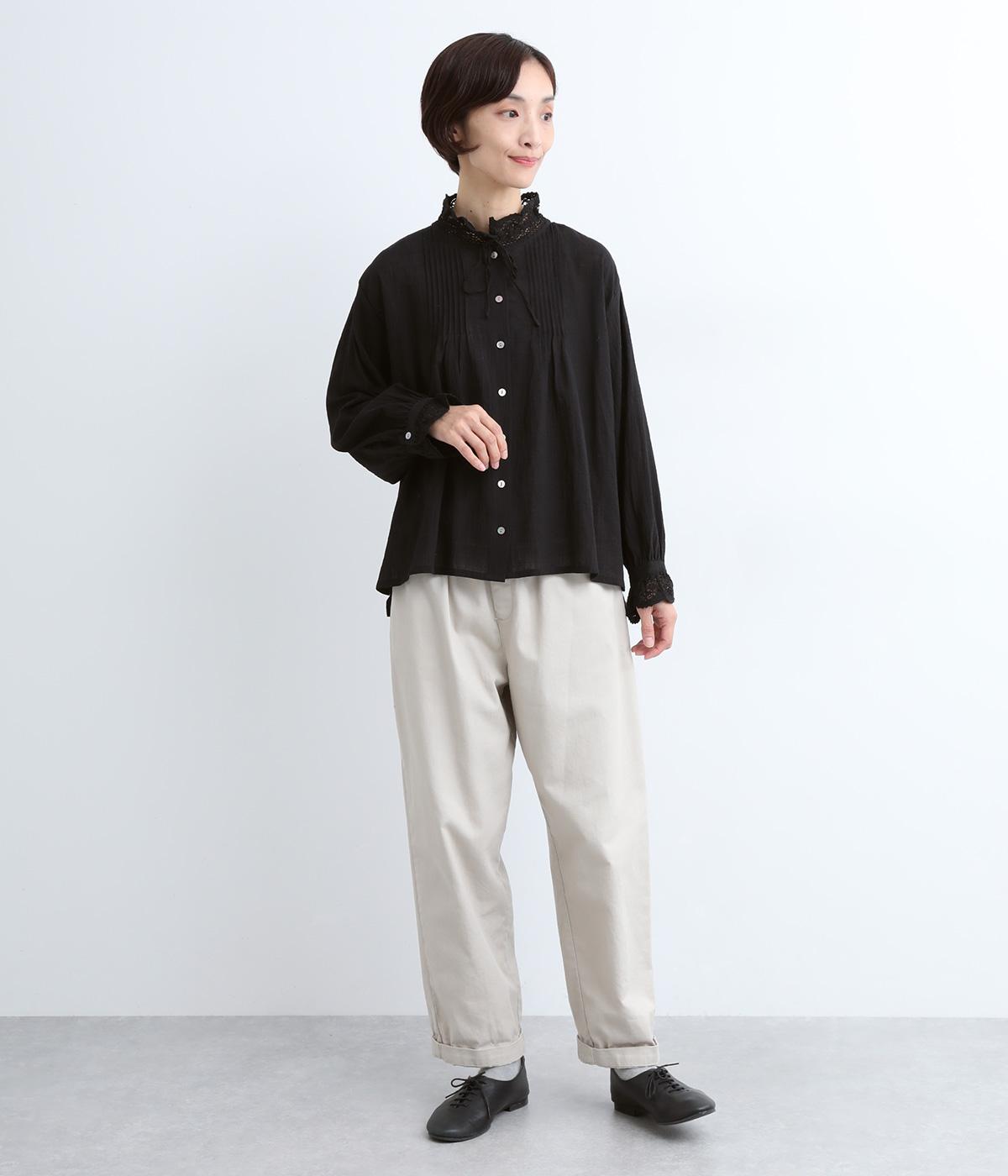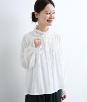 レースやピンタック、襟ぐりのリボンなどロマンティックな雰囲気満点のブラウスです。雰囲気のいいナチュラル素材が甘さをちょうどよく中和させてくれます。着丈は前後差をつけたサイドスリット入りでボトム合わせも困りません。
