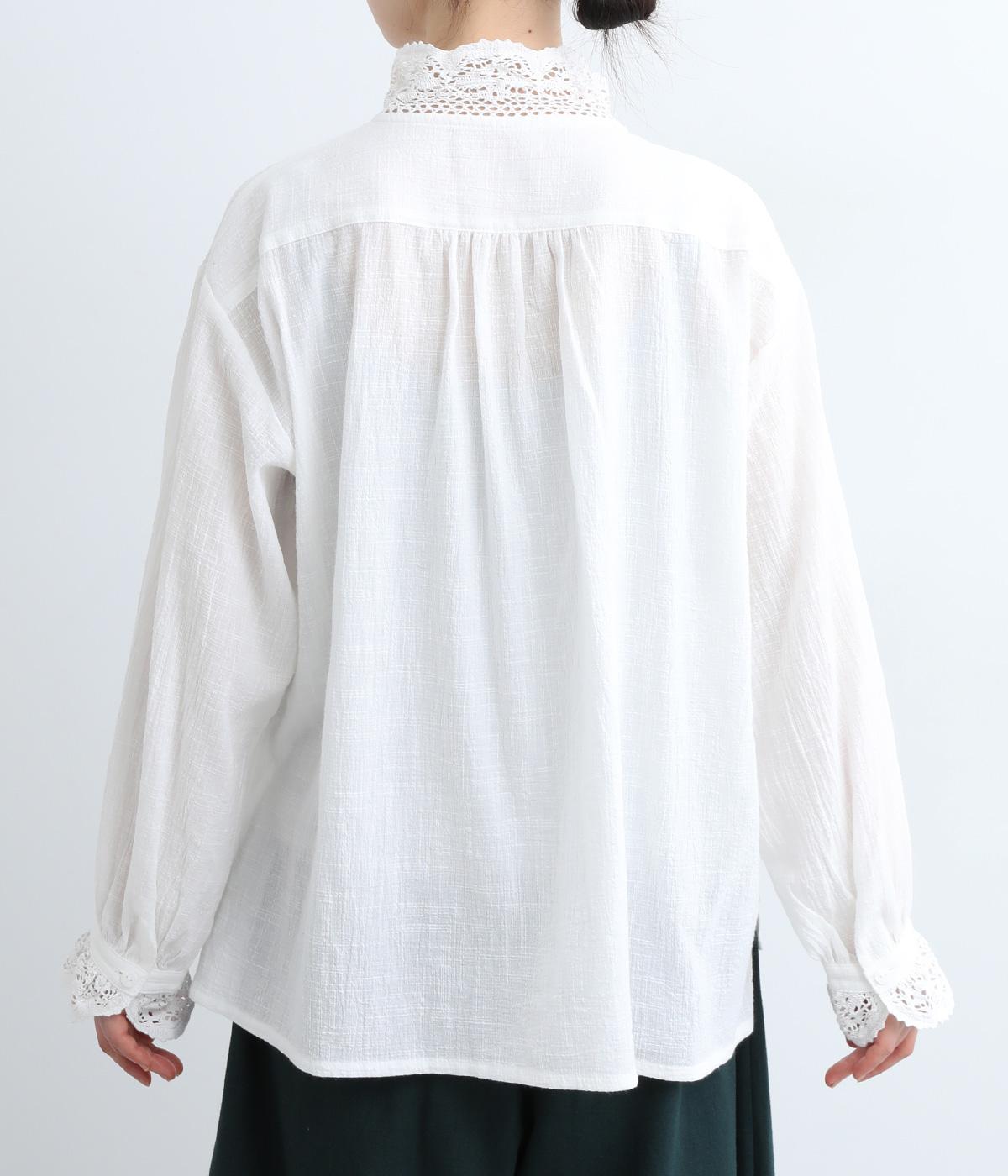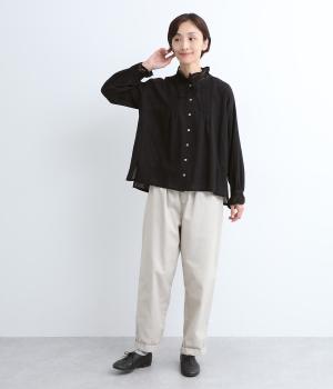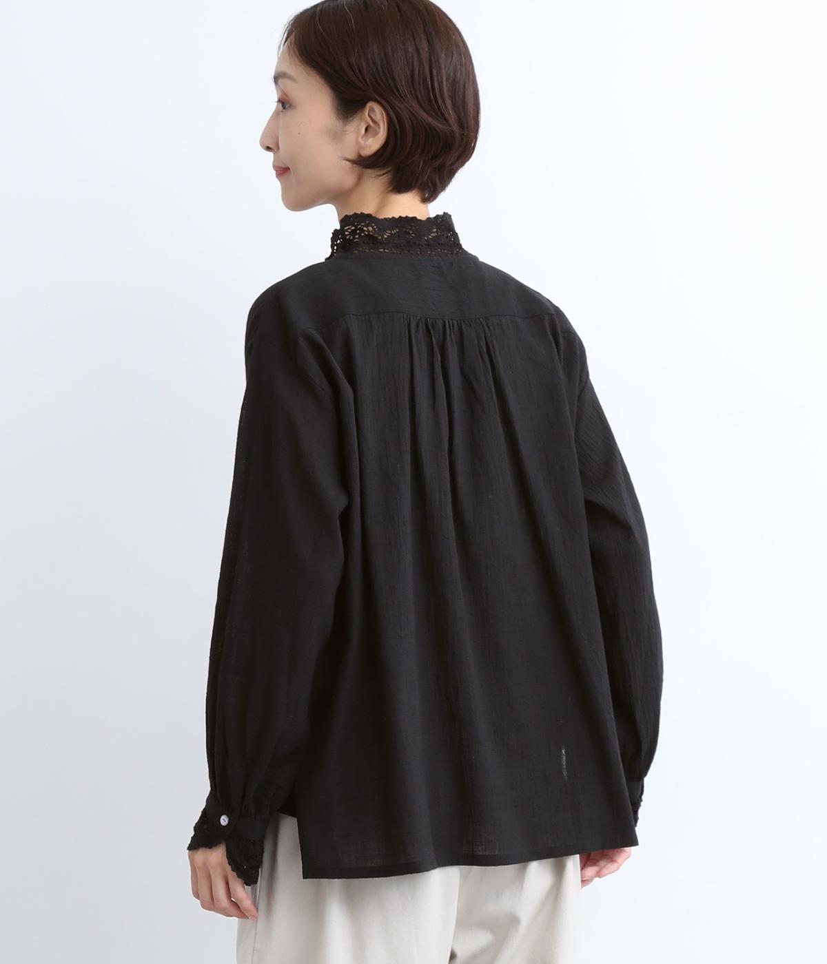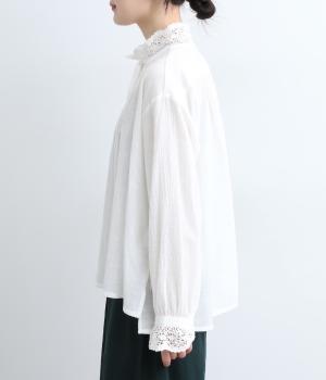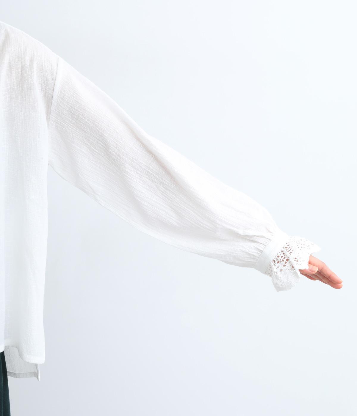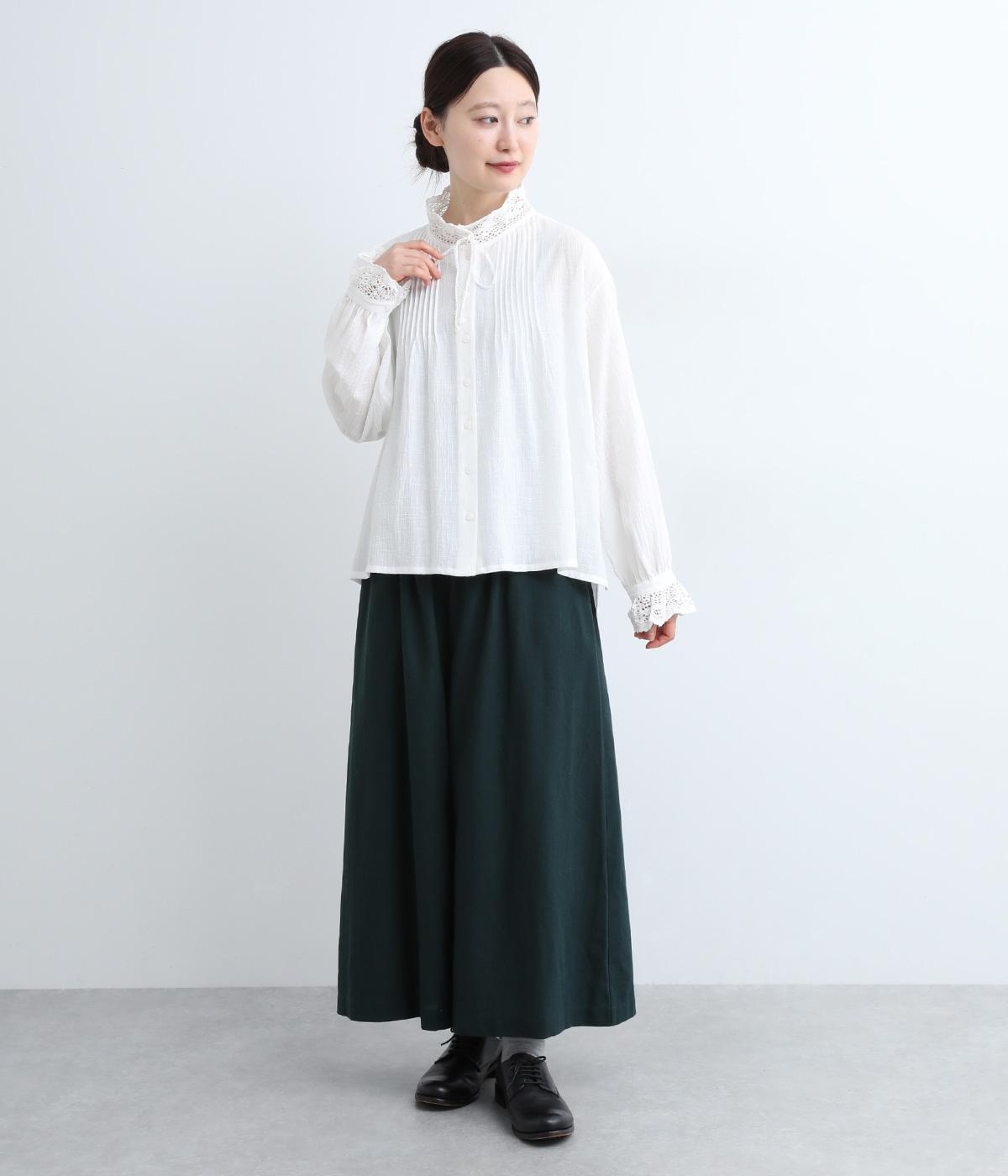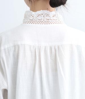 レースやピンタック、襟ぐりのリボンなどロマンティックな雰囲気満点のブラウスです。雰囲気のいいナチュラル素材が甘さをちょうどよく中和させてくれます。着丈は前後差をつけたサイドスリット入りでボトム合わせも困りません。